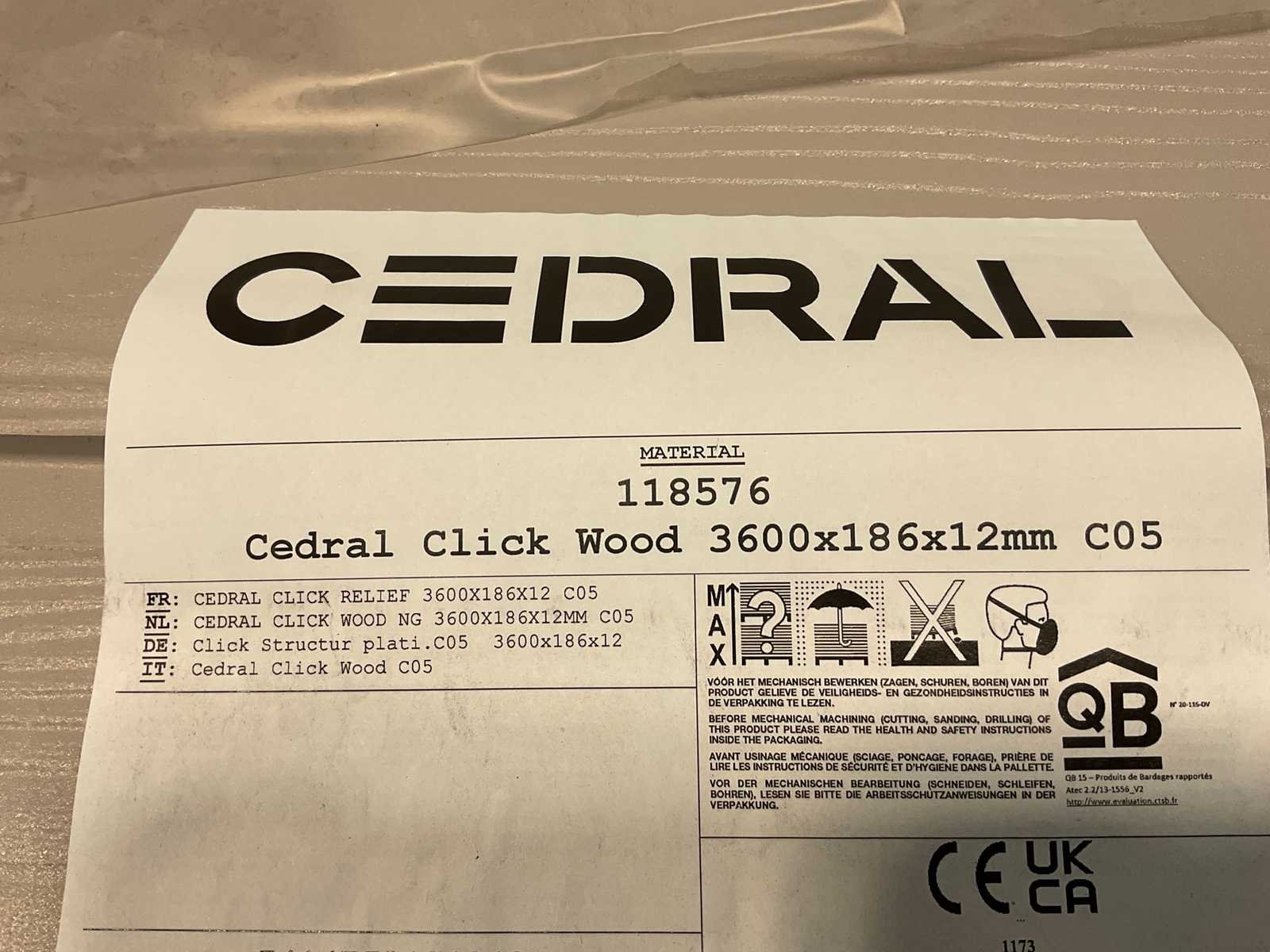 Cedral Click Wood 3600x186x12 mm gevelplaten Brandklasse: A2-s1, d0 Gewicht per plank: 12,86 kg Merk: Cedral Model: Click Wood Product type: Gevelstrook Kleur: Platinagrijs Lengte: 360cm Breedte: 18,6cm Hoogte: 1,2cm Materiaal: Cementvezel