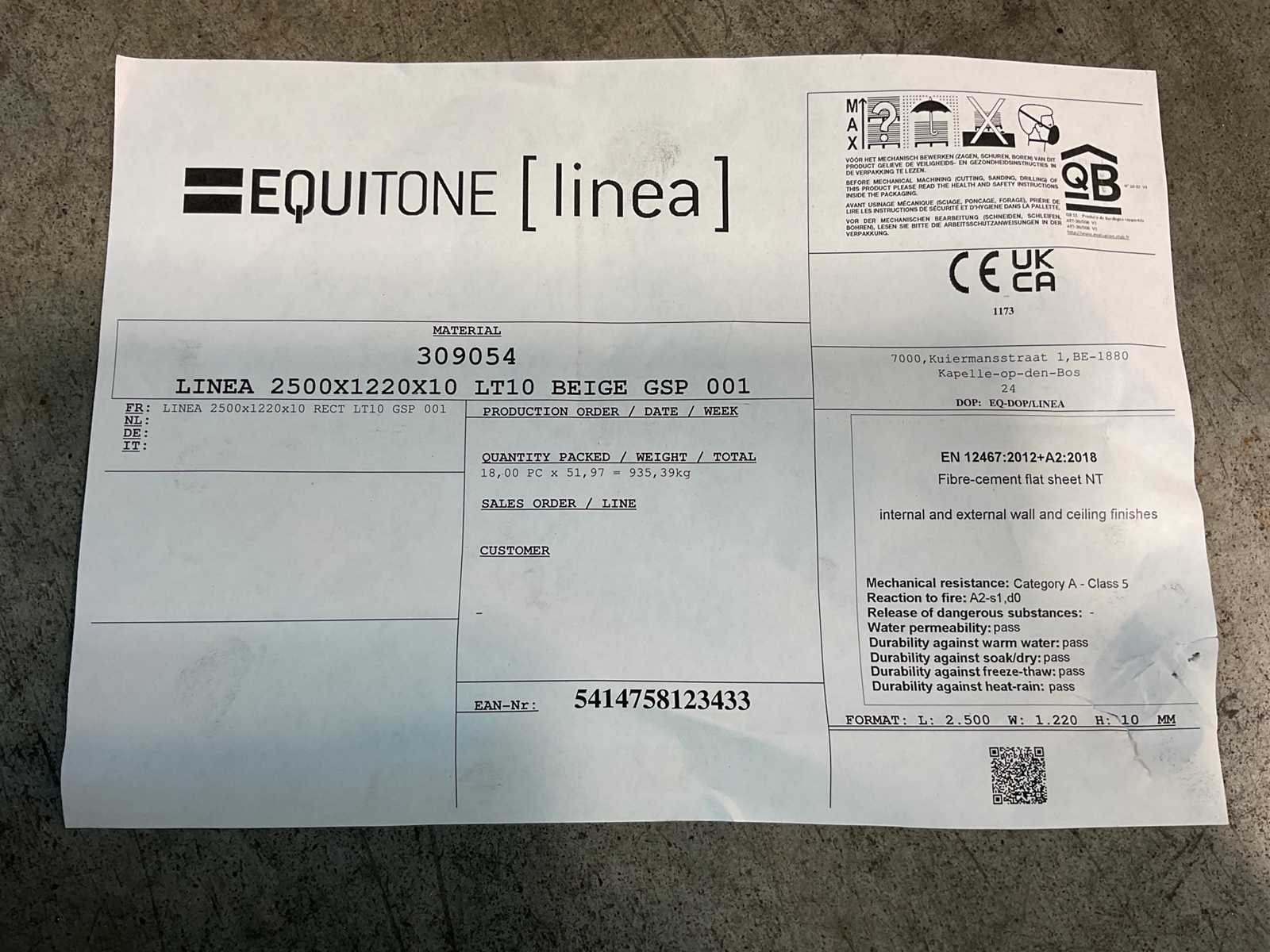Linea plaatmateriaal, 250 x 122 x 1 cm dik LT Beige GSP 001 EQUITONE Linea is een door en door gekleurde vezelcement gevelplaat met karakteristieke groeven voor extra diepte en een moderne uitstraling. Specificaties Serie: Linea Toepassing: Gevelplaat Afmetingen: 2500 × 1220 × 10 mm Kleur: Bruin (LT10) Brandveilig en waterbestendig Bestand tegen vorst, temperatuurwisselingen en chemicaliën Merk: Equitone Type: Gevelplaat Kleur: Beige Lengte: 2500mm Breedte: 1220mm Hoogte: 10mm Materiaal: Vezelcement