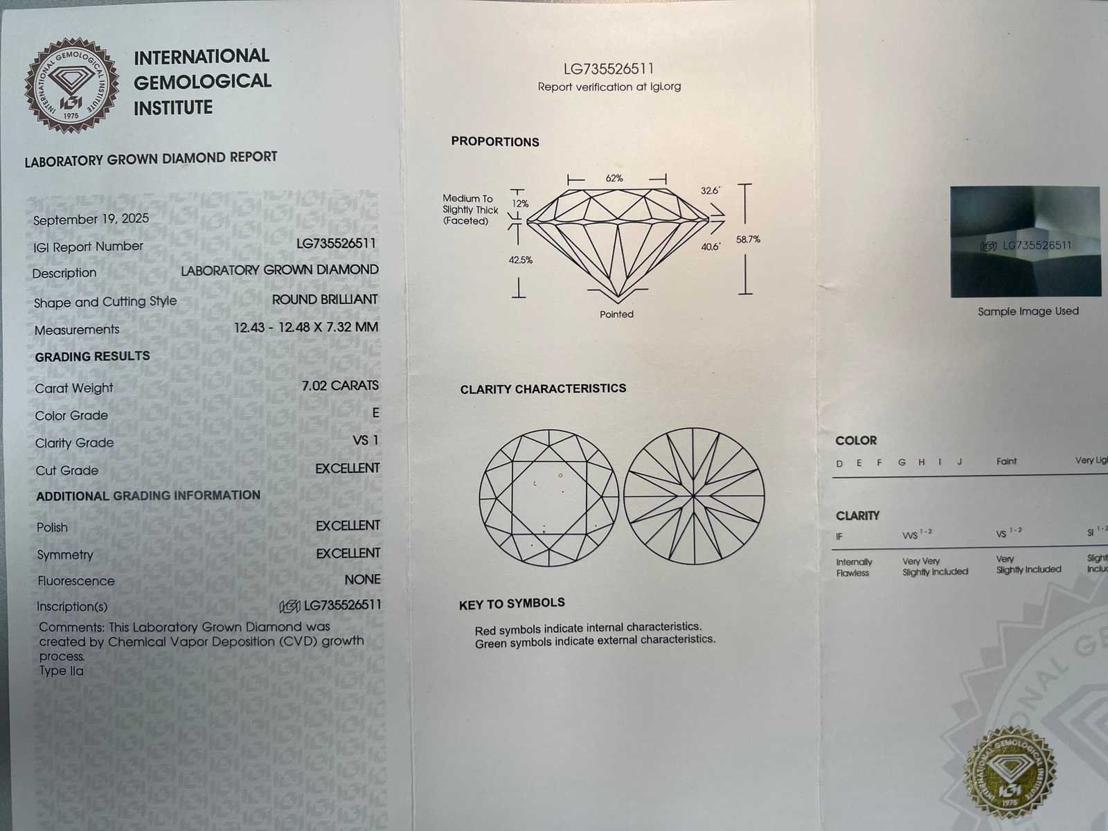 Ongebruikt Vorm: rond Briljant Gewicht: 7,30 CRT Kleur: E Duidelijkheid: VS1 Pools: Uitstekend Symmetrie: Uitstekend Rapportnummer IGI 14K wit goud Met IGI-certificaat Bezichtiging op afspraak Product type: 14 karaat wit goud Kleur diamant: E Slijpvorm diamant: Rond Briljant Ringmaat: 54 Slijpvorm: rond Certificaat: Ja Kleur: VS1 Materiaal: 14 karaat wit goud Lage schatting: 14000€ Hoge schatting: 17000€