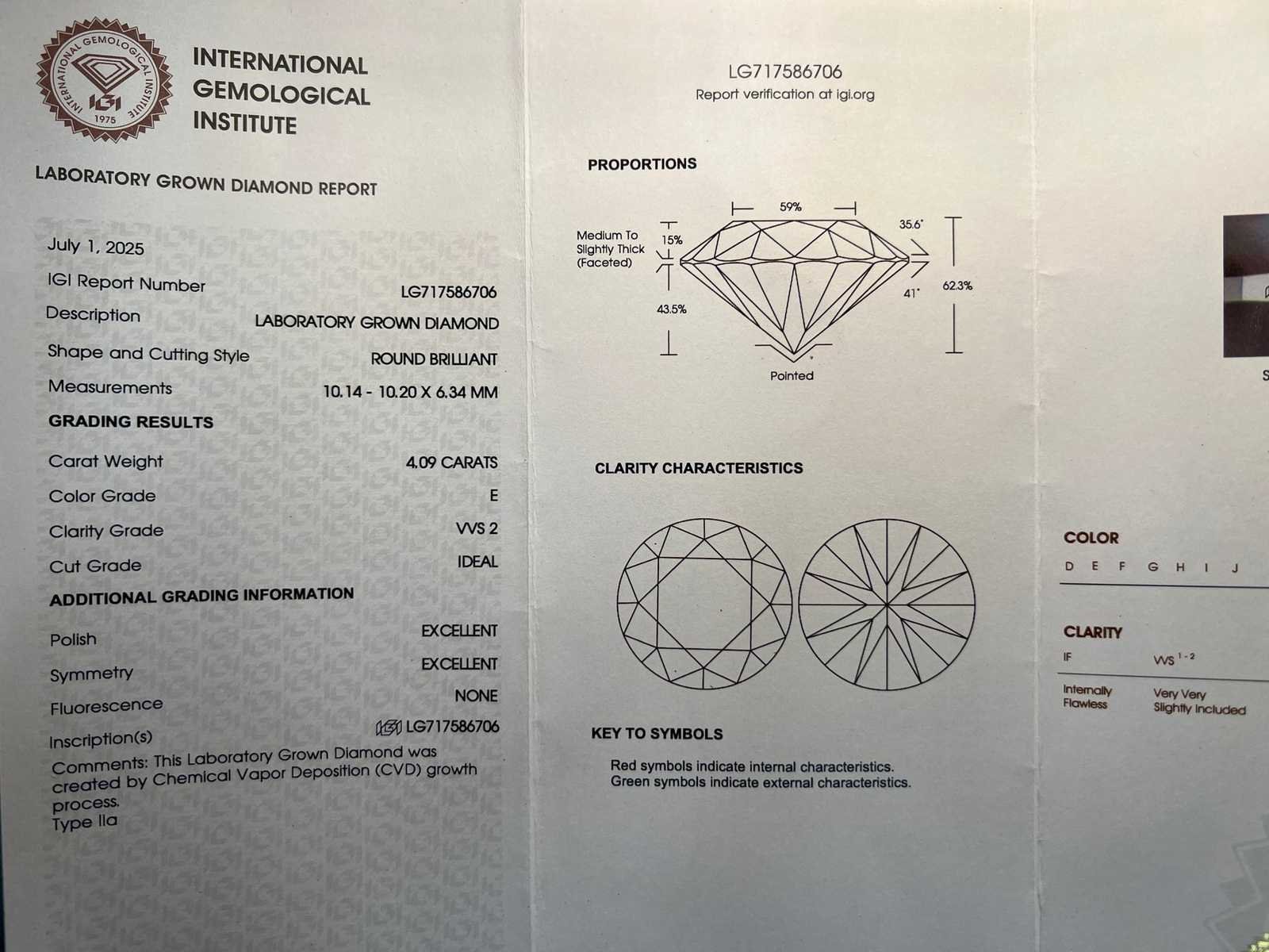 Vorm: Rons briljant Totaal Gewicht: 2,44 Kleur: E Helderheid: VVS2 Uitstekend Symmetrie: uitstekend Bezichtiging op afspraak Materiaal: Wit goud Kleur diamant: E Gewicht diamant: 4.09ct Slijpvorm: Briljant Lengte: 43cm Certificaat: ja Lage schatting: 6500€