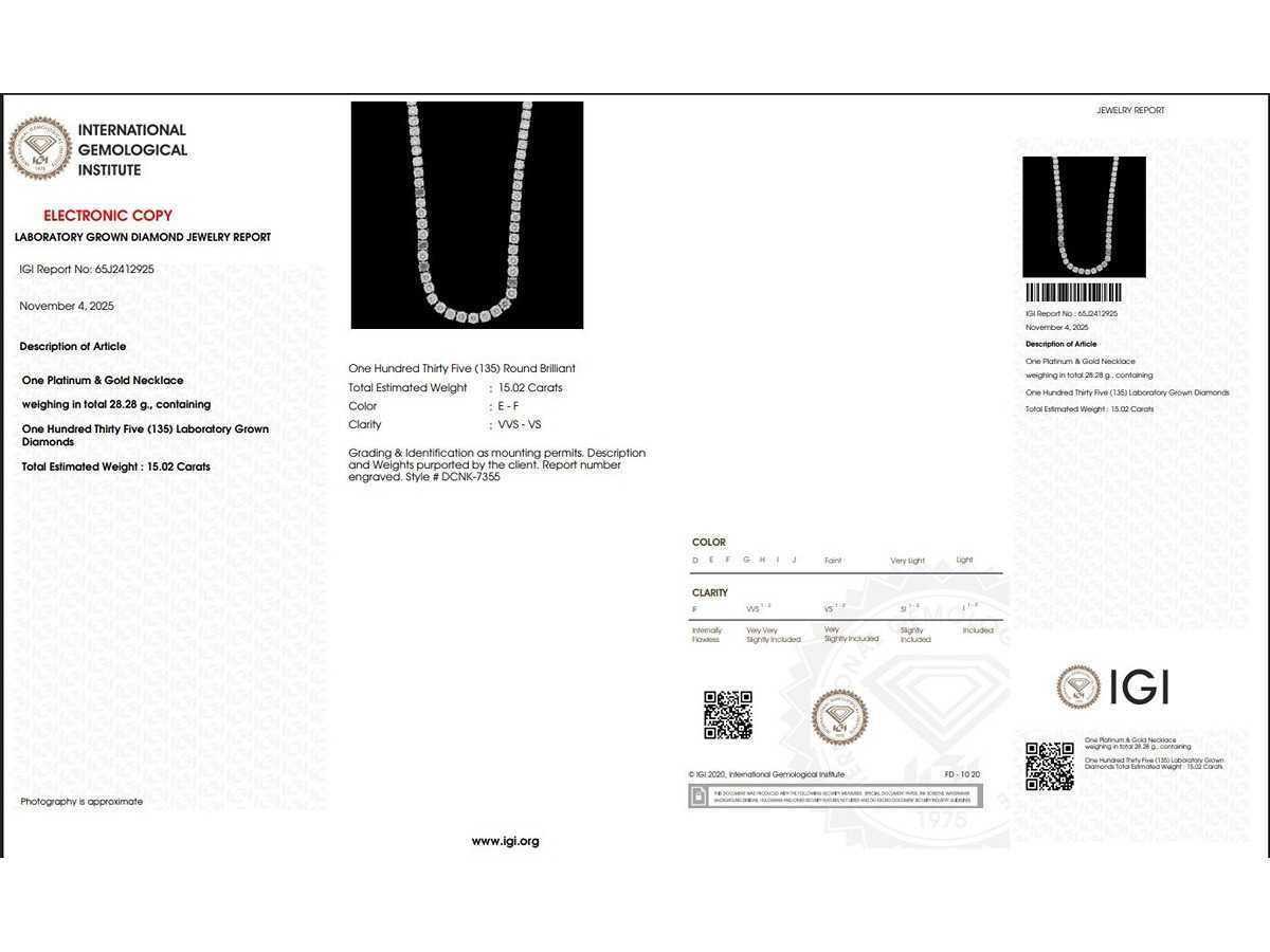 Necklace is made up of platinum950 Report Number - 65J2412925 Gross weight - 28.28 grams Total Carat Weight - 15.02 carat Color - E-F Clarity -VSS-VS Number of diamonds - 135 Shape - Round Brilliant Cut Bezichtiging op afspraak Materiaal: Platina Lage schatting: 15900€