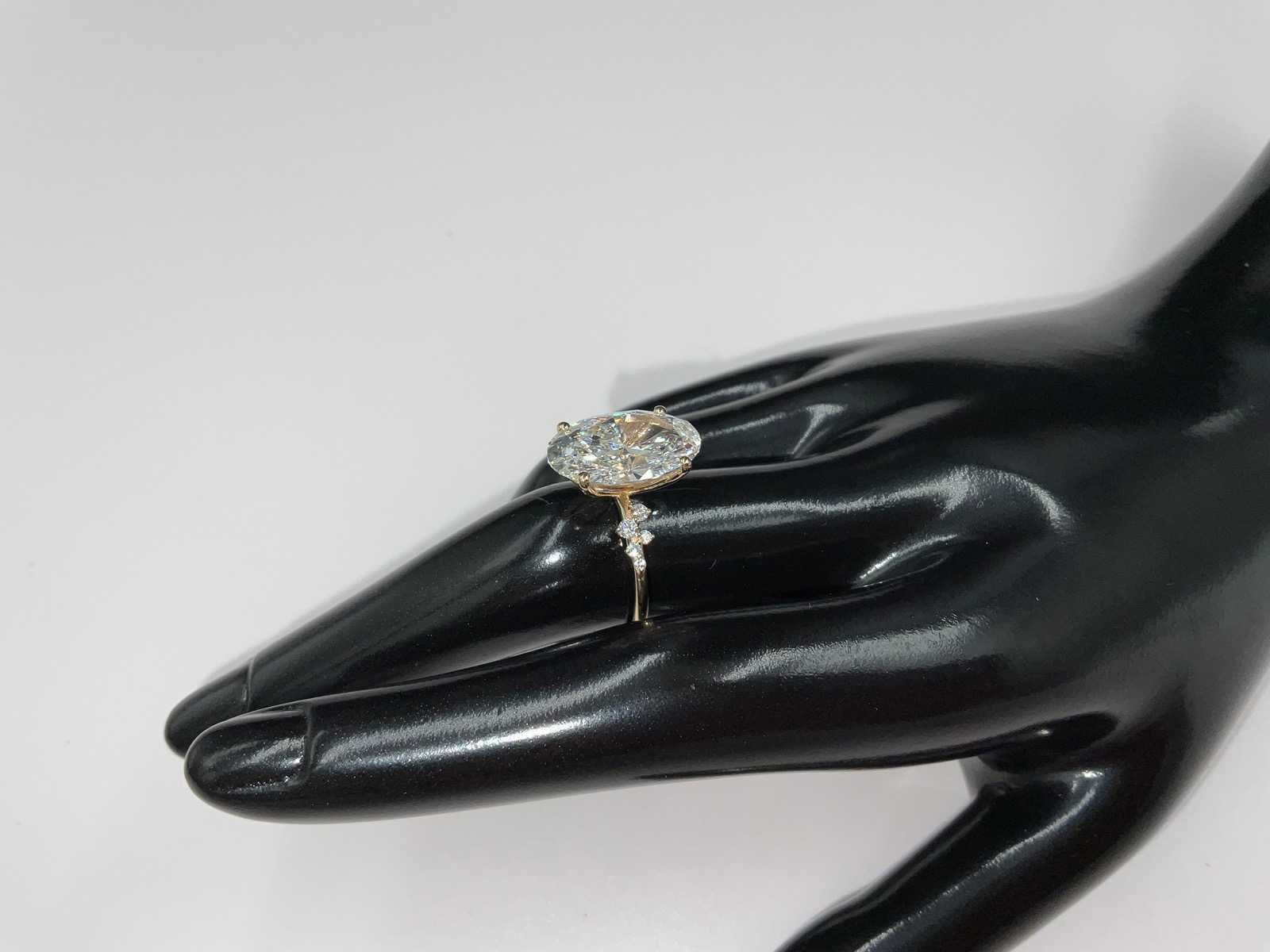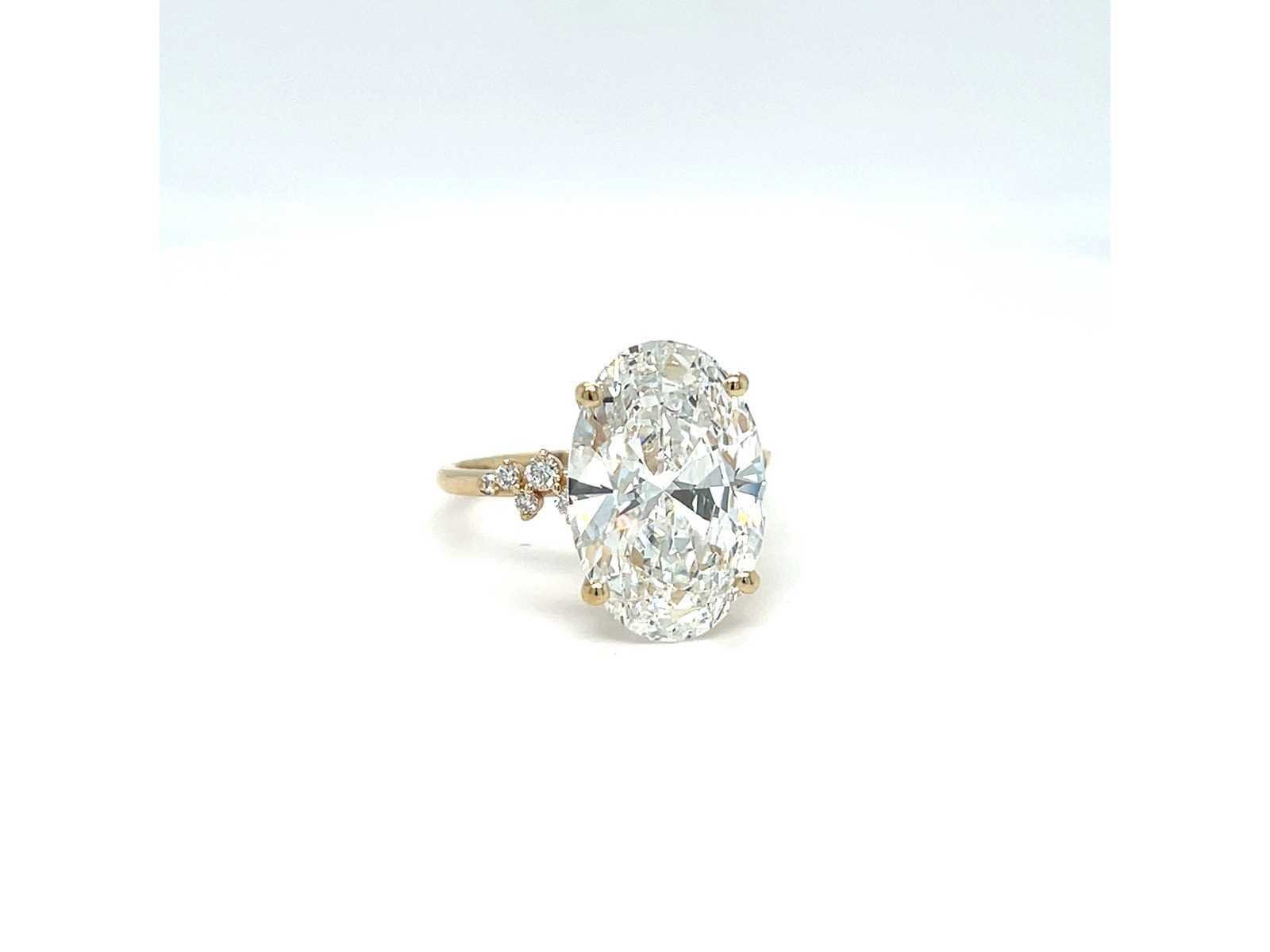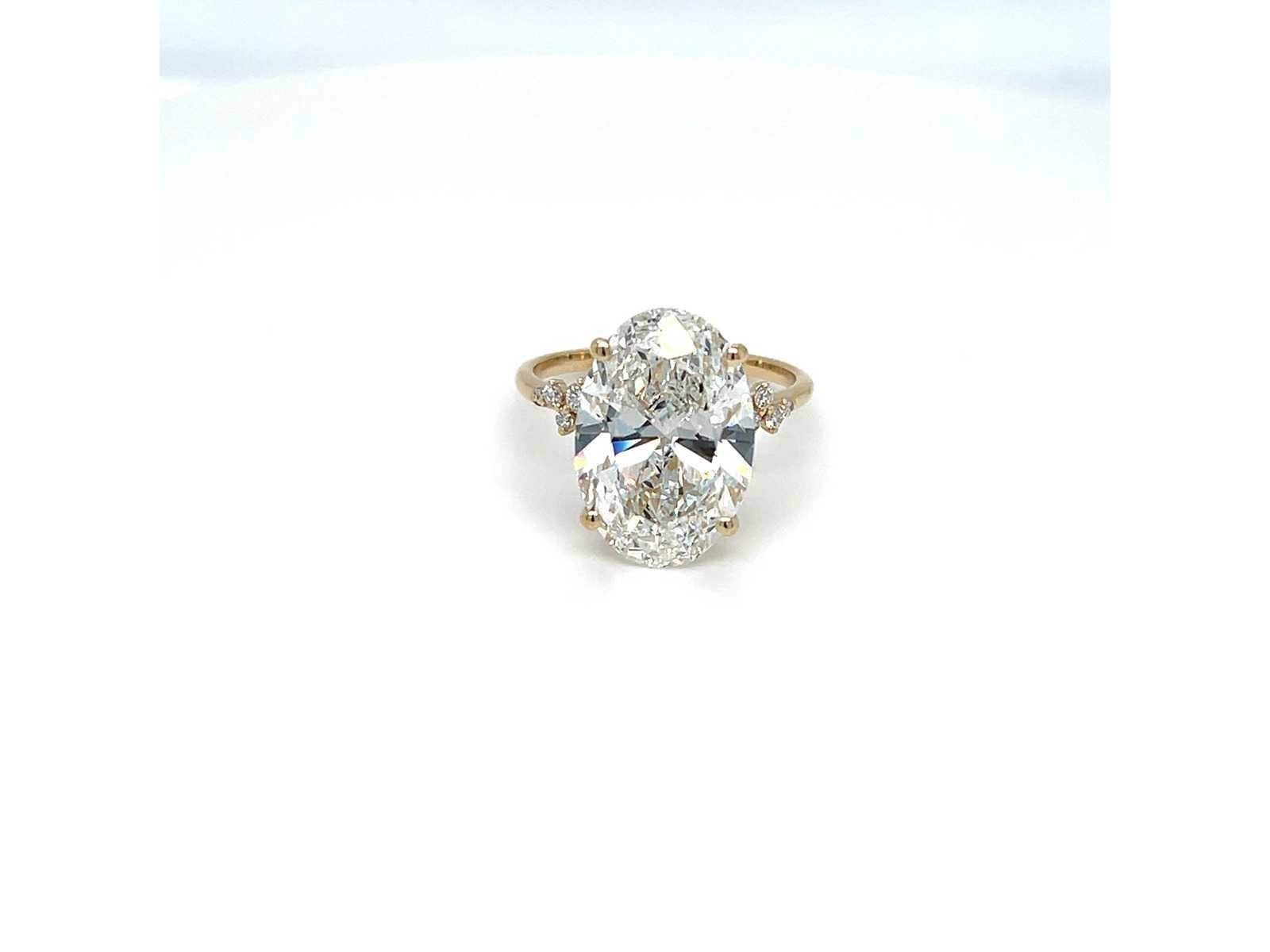 Vorm: ovaal Gewicht: 7,09 CT Kleur: E Helderheid: VS1 Symmetrie: uitstekend Fluorescentie: geen Bijstenen: 10 stuks van 0,20 ct rond Bezichtiging op afspraak. Materiaal: Geelgoud Ringmaat : 55 Certificaat: ja Lage schatting: 18900€