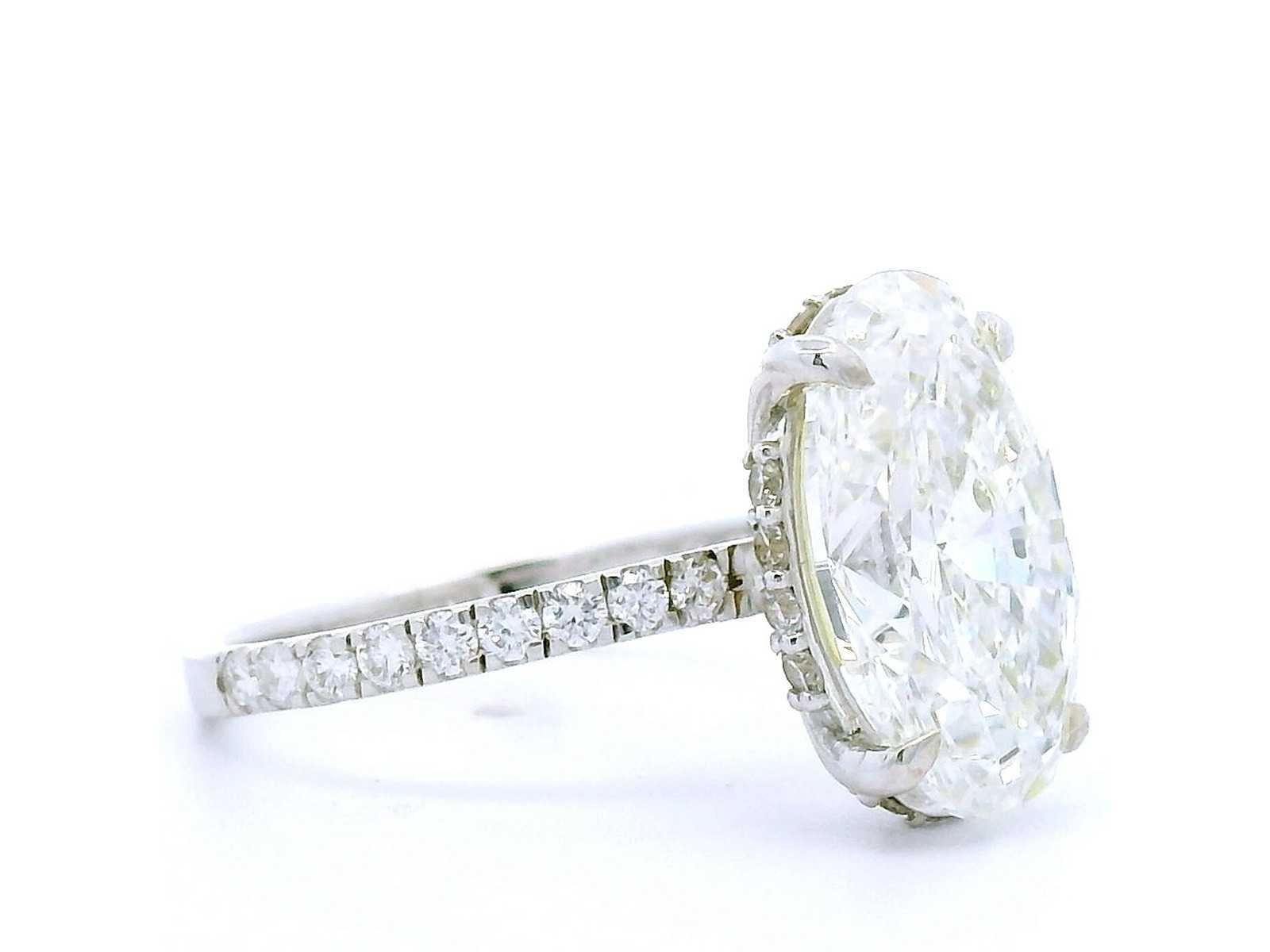Exclusieve 18K witgouden ring Ringmaat - 54 EU / 14 IT / 6.75 US Rapportnummer IGI: LG701502543 Totaal karaatgewicht - 5,55 Ovale briljant Gewicht van de hoofdsteen: 5,04 CT Kleur: E Helderheid: VVS2 Snede: uitstekend Symmetrie: uitstekend Omringende stenen - 0,51 (30 stuks) Totale ringgewicht: 3,27 gram Bezichtiging op afspraak Materiaal: Witgoud Lage schatting: 9900€