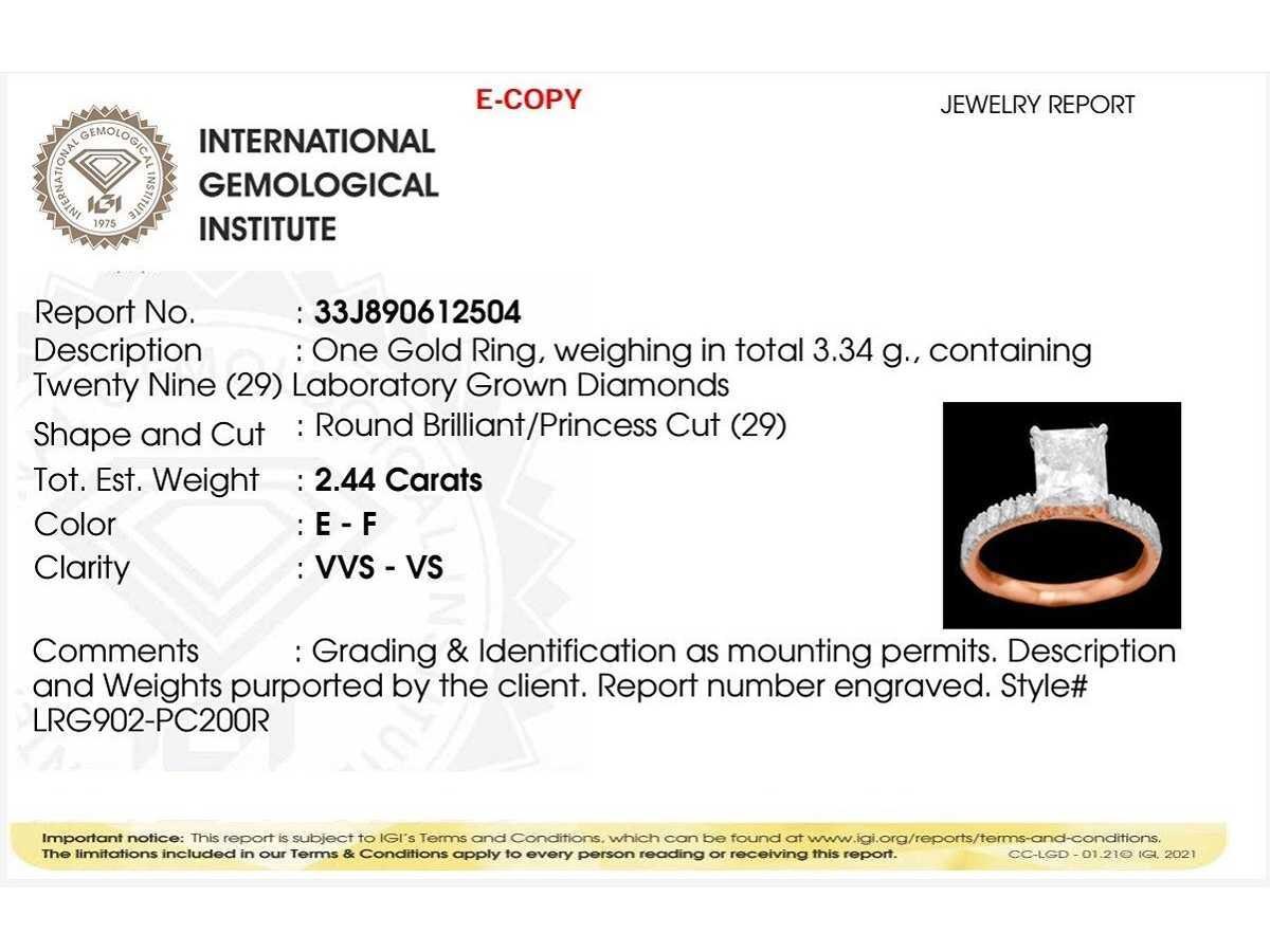 DIAMANT DETAILS Totaal karaatgewicht: 2,44 CT Hoofdsteen: 2,00 CT Omringende stenen: 0,44 CT Kleurgradatie: E-F Helderheidsklasse: VVS-VS IGI Certificaatnummer- 33J890612504 METAALDETAILS Metaaltype: Goud Goudzuiverheid: 14K Gouden kleur: Roségoud Ringmaat 54 Bezichtiging op afspraak Materiaal: Roségoud Ringmaat : 53 Certificaat: Ja Lage schatting: 5100€