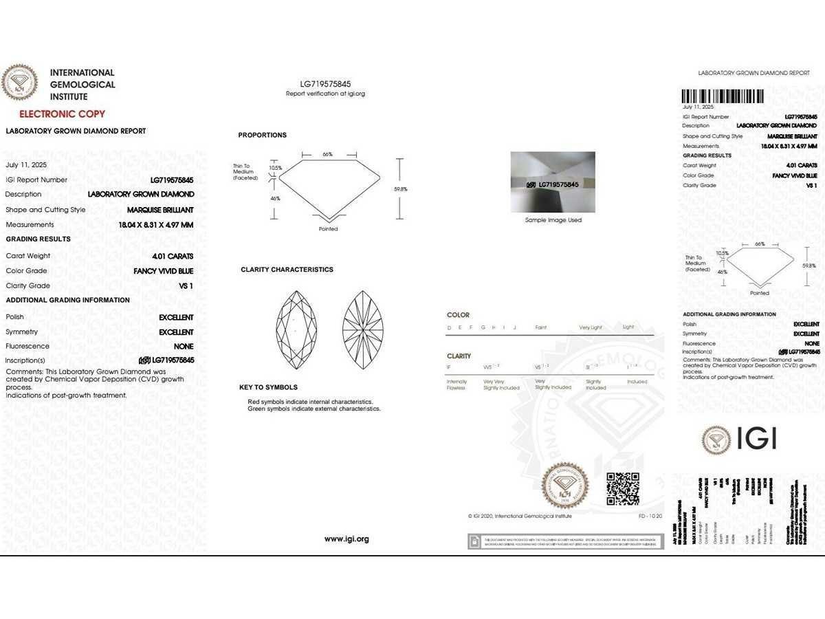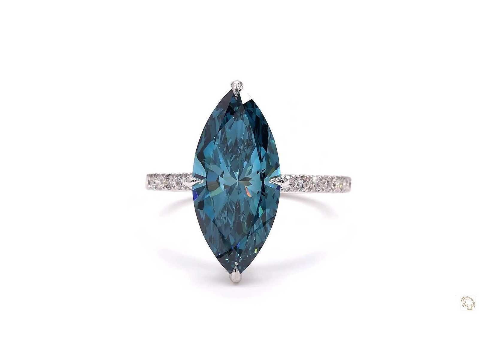 Exclusieve 18K witte goudring Ringmaat - 56 EU / 16 IT / 7.50 US Rapportnummer IGI: LG719575845 Vorm: Markies Briljant Gewicht van de hoofdsteen met 4,01 karaat Kleur: Fancy levendig blauw Helderheid: VS1 Symmetrie: uitstekend Zijstenen - 0,43 (42 stuks) Totaal Carat - 4,44 Totale ringgewicht: 3,51 gram Bezichtiging op afspraak Materiaal: Witgoud Ringmaat : 56 Certificaat: Ja Lage schatting: 9100€