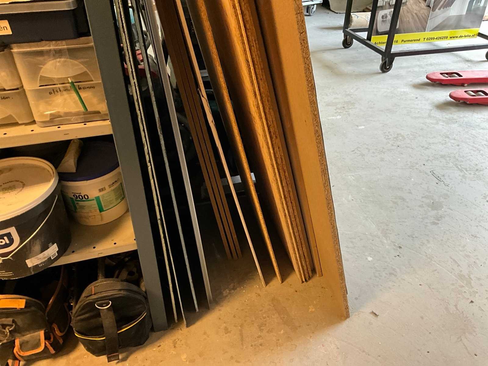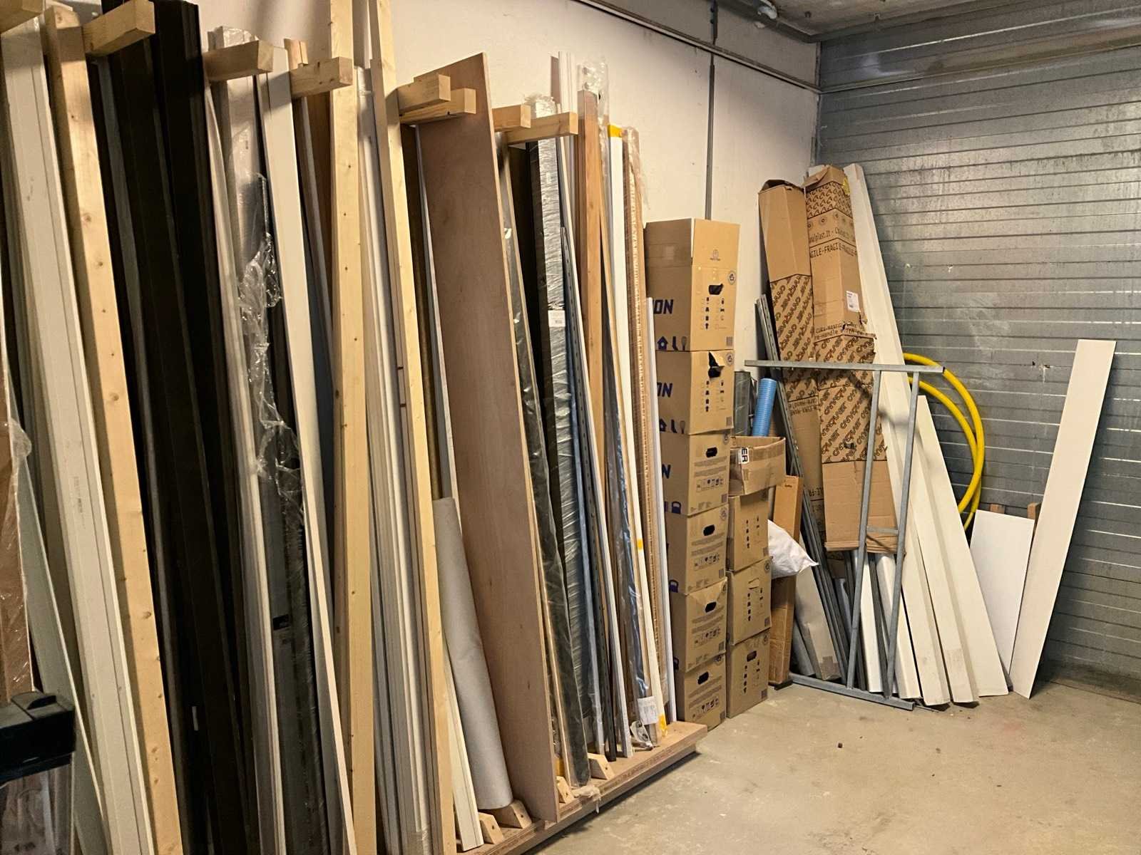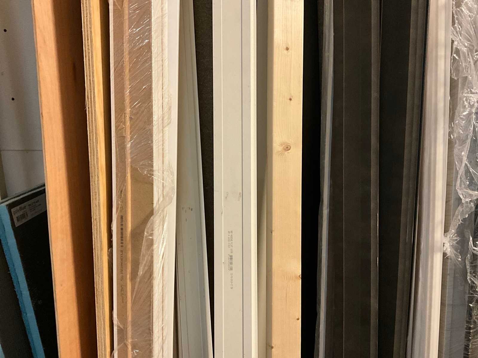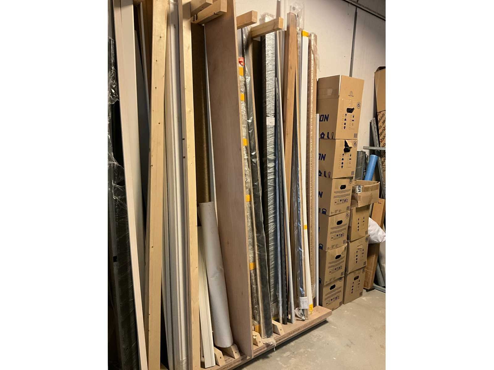 Waaronder houten platen; balken; palen; plinten; buizen; strips; afwerkprofielen etc. Lengtes tot circa. 270 cm; Inclusief houten bok, verhuisdozen niet inbegrepen