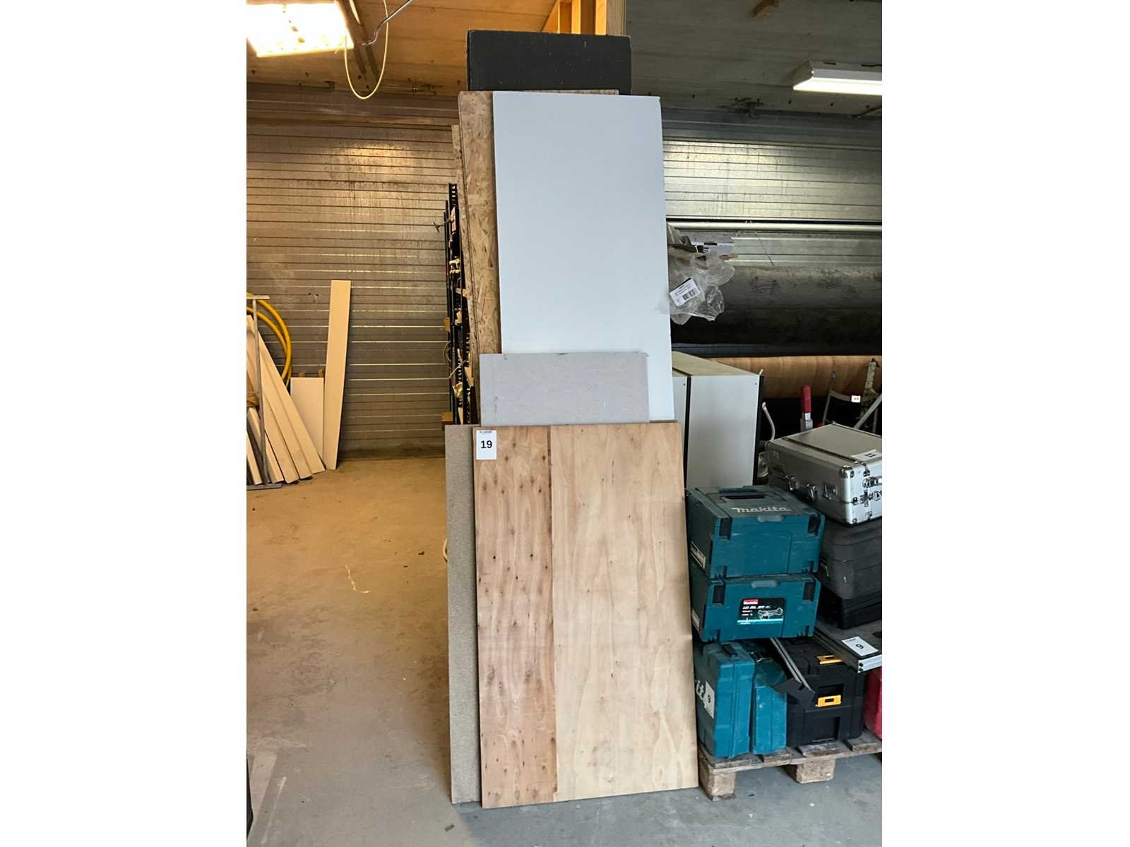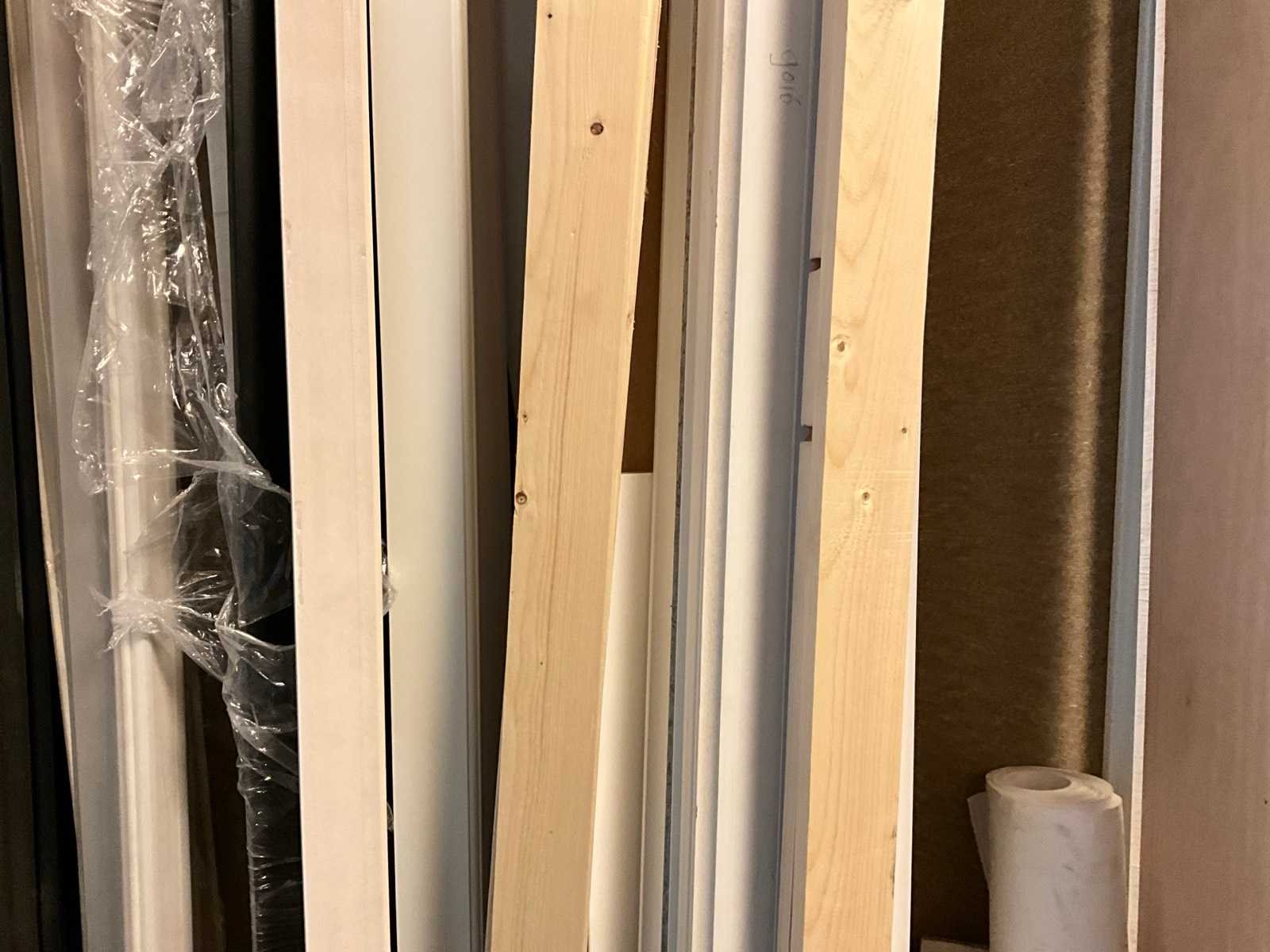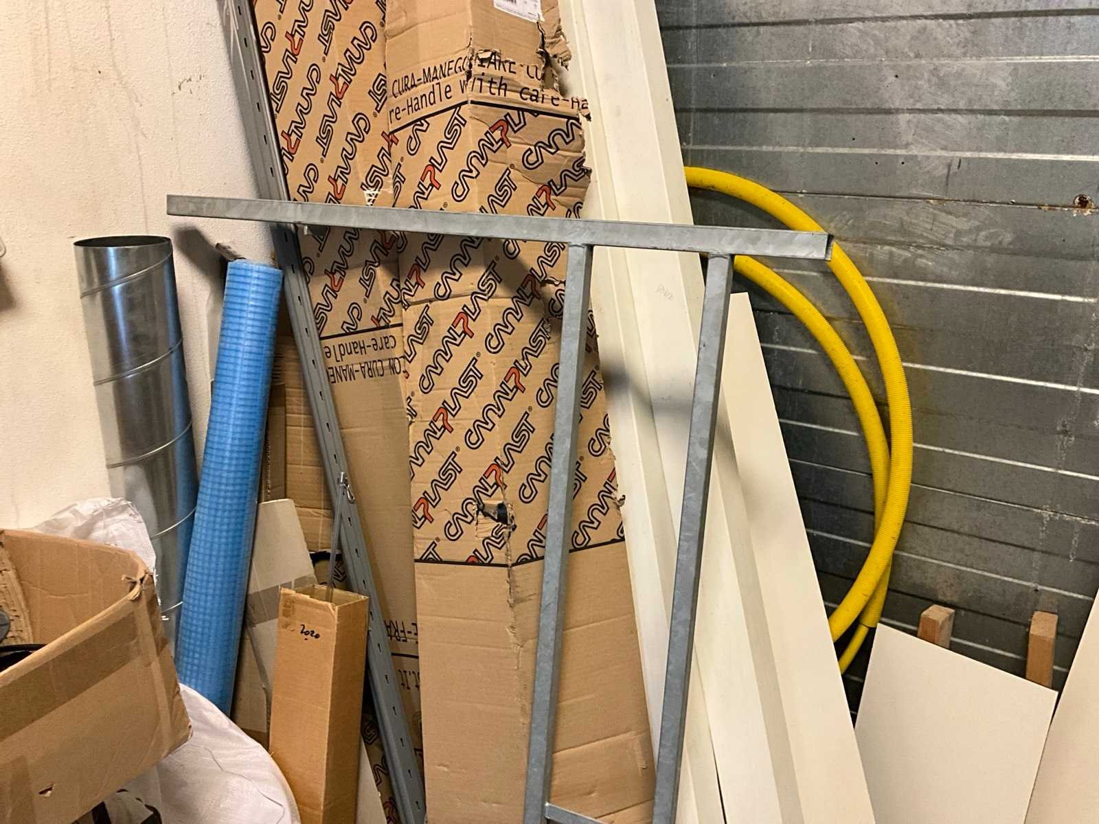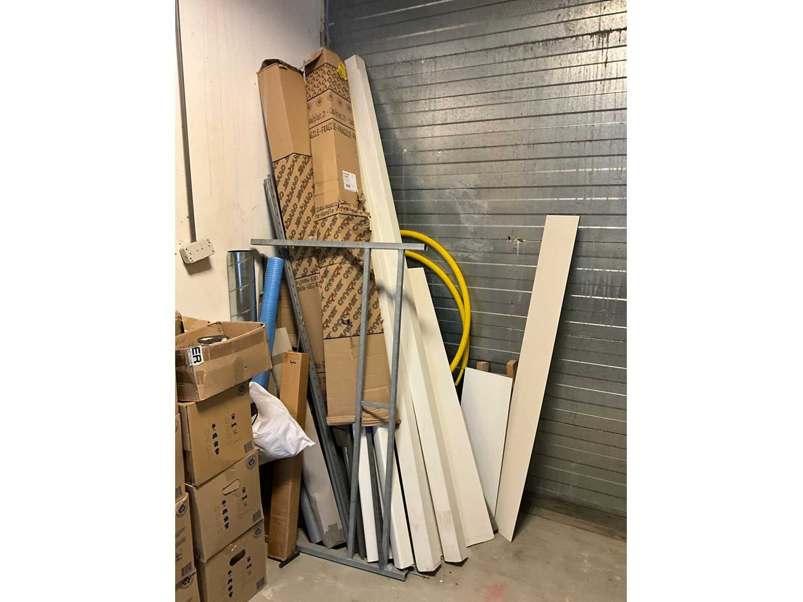 Waaronder houten platen; balken; palen; plinten; buizen; strips; afwerkprofielen etc. Lengtes tot circa. 270 cm; Inclusief houten bok, verhuisdozen niet inbegrepen