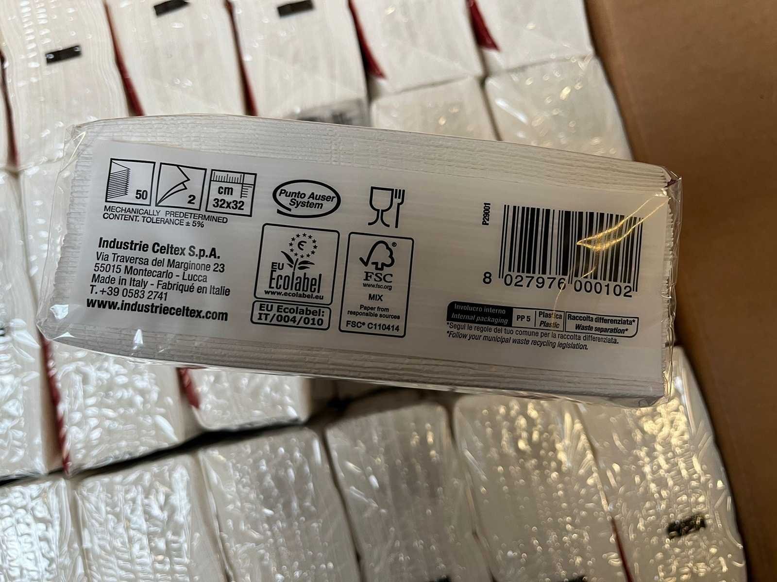25.200 servetten. Verpakt in 14 dozen. 1800 servetten in een doos. Doos: 36 pak à 50 stuks.