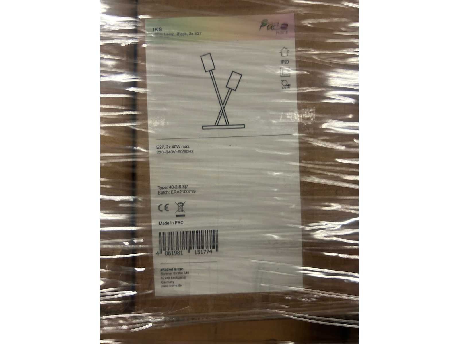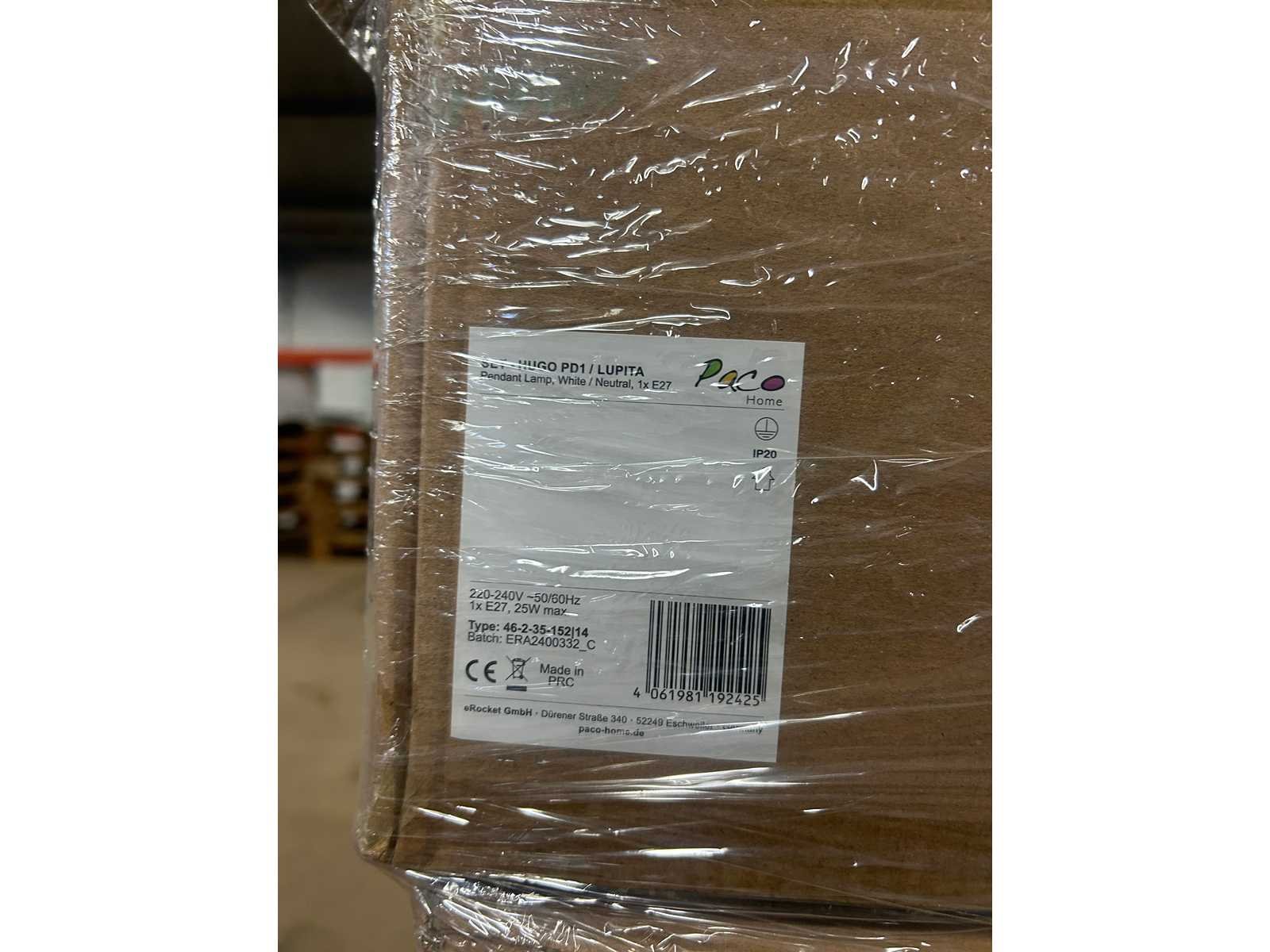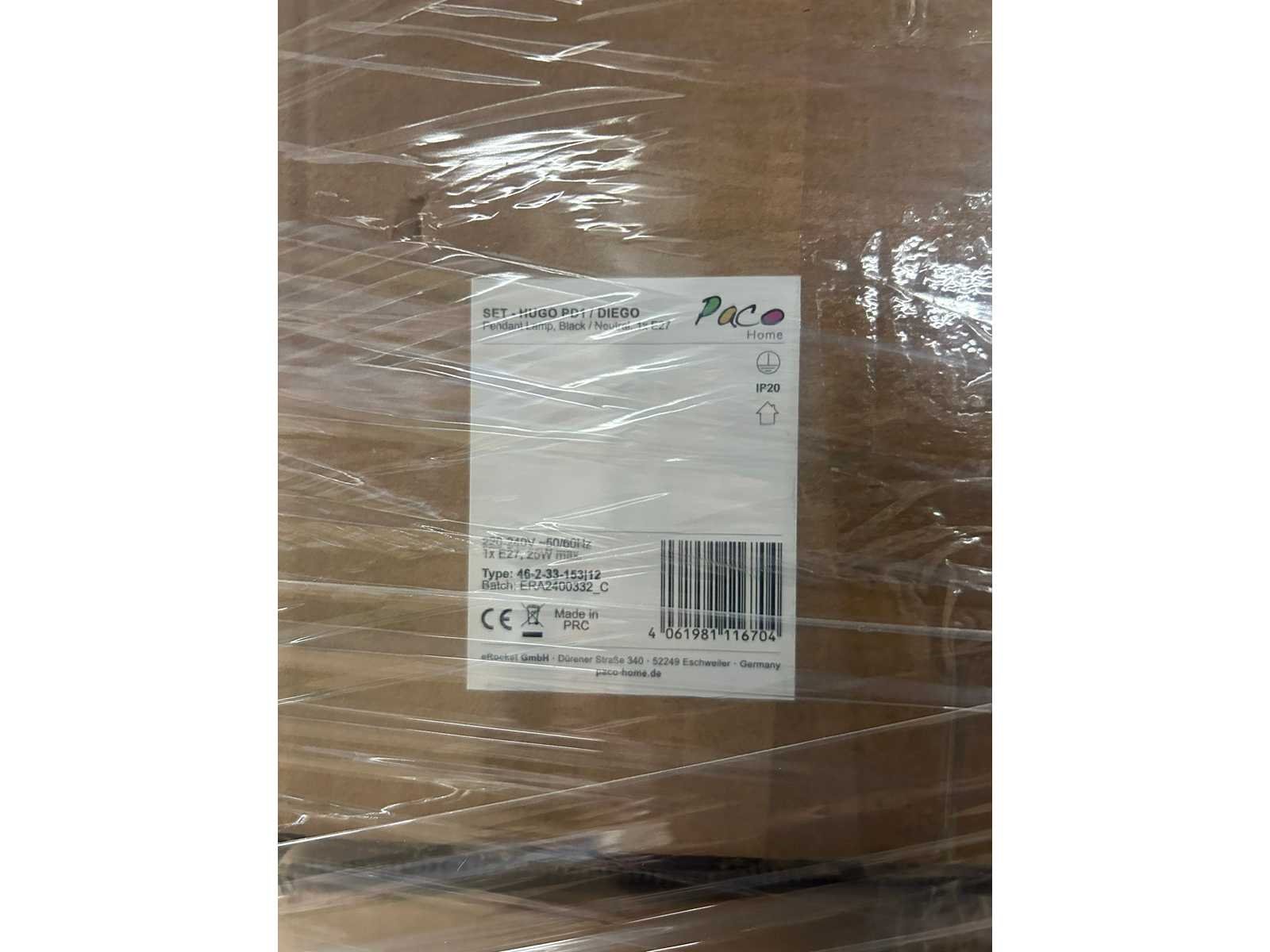 Pallet met design verlichting van Paco Home, rechtstreeks afkomstig uit het fulfillment center. De dozen zijn ongeopend en niet gesorteerd. De inhoud kan bestaan uit nieuwe producten, demo-artikelen of items met beschadigingen of ontbrekende onderdelen. Soms gaat het alleen om een beschadigde verpakking, maar het kan ook voorkomen dat het product zelf beschadigd of incompleet is.