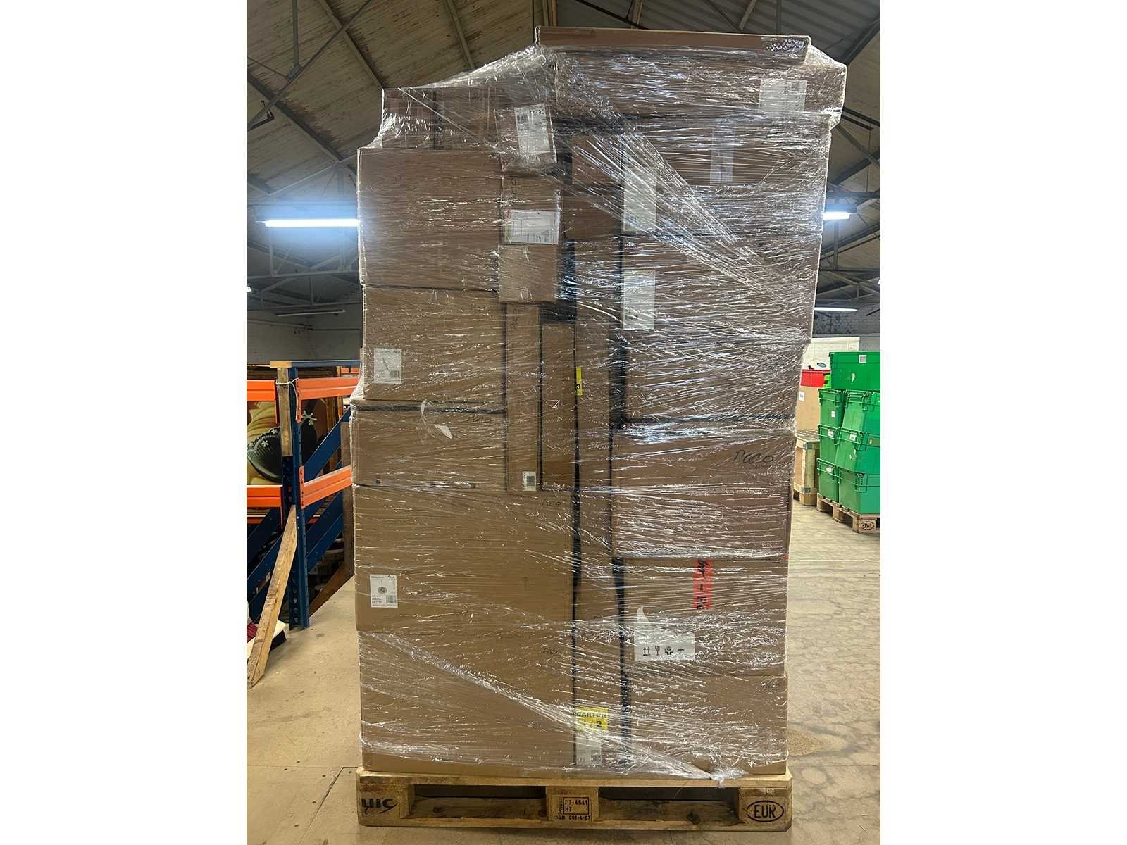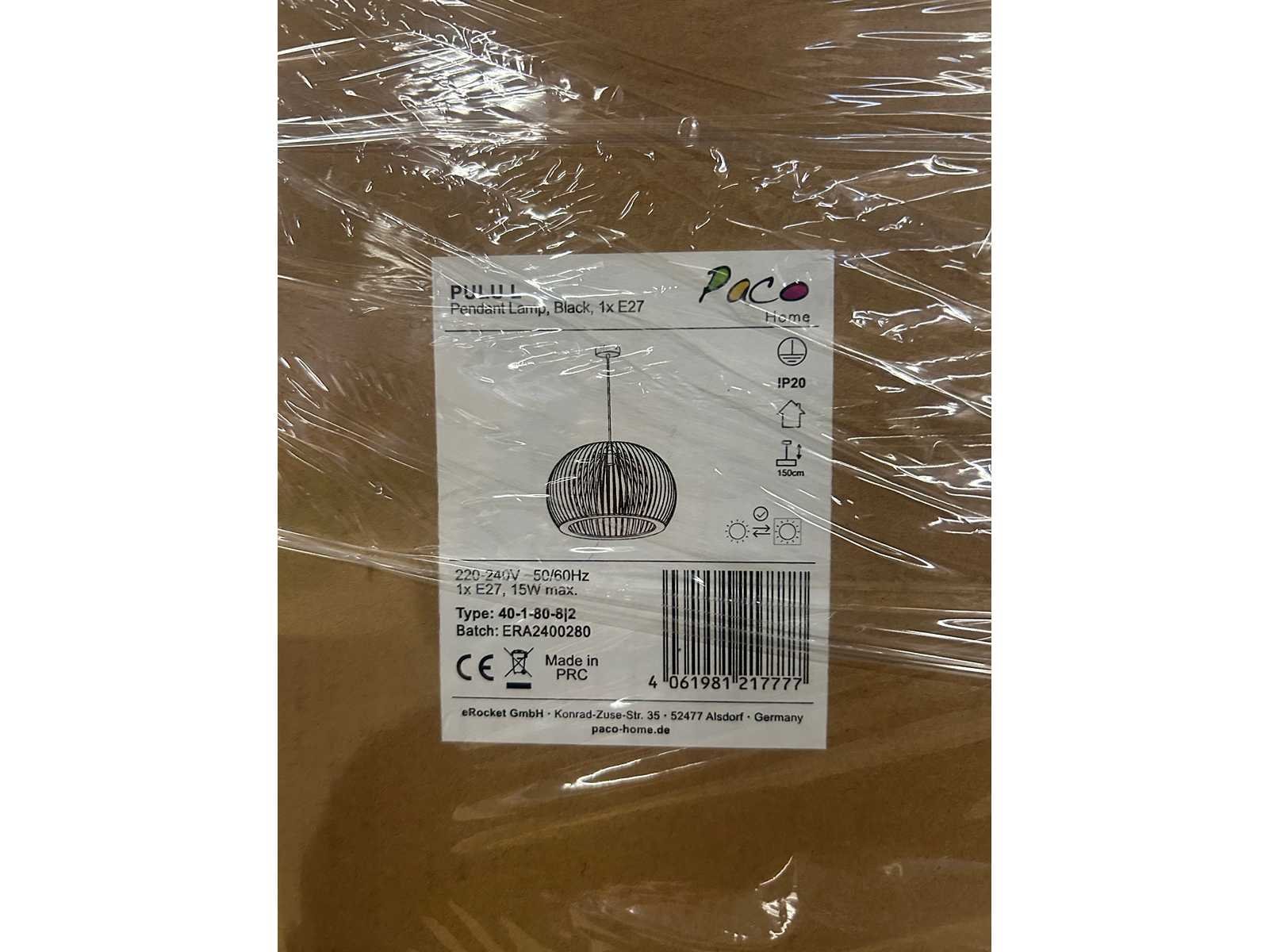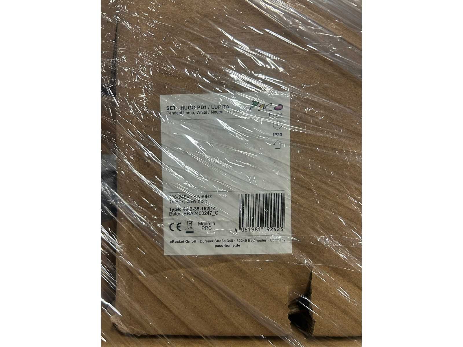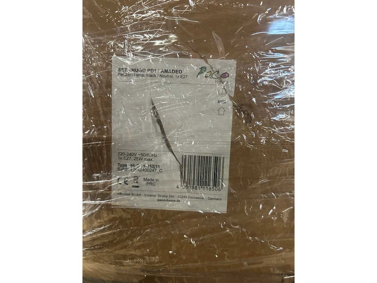 Pallet met design verlichting van Paco Home, rechtstreeks afkomstig uit het fulfillment center. De dozen zijn ongeopend en niet gesorteerd. De inhoud kan bestaan uit nieuwe producten, demo-artikelen of items met beschadigingen of ontbrekende onderdelen. Soms gaat het alleen om een beschadigde verpakking, maar het kan ook voorkomen dat het product zelf beschadigd of incompleet is.