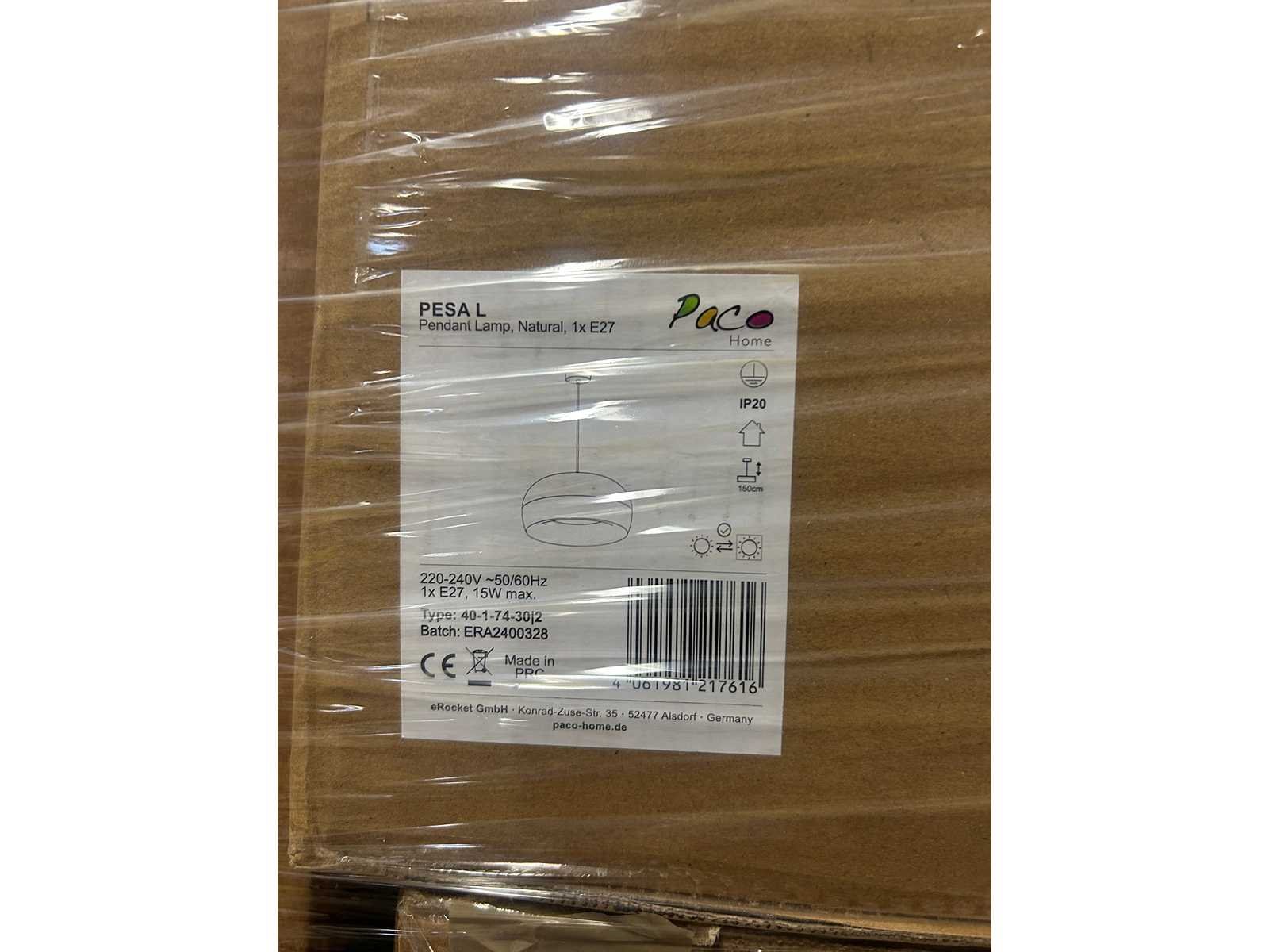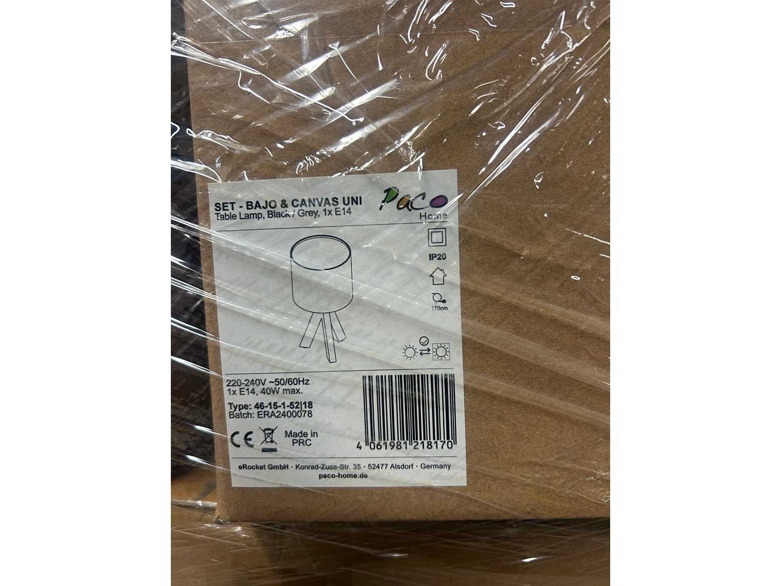 Pallet met design verlichting van Paco Home, rechtstreeks afkomstig uit het fulfillment center. De dozen zijn ongeopend en niet gesorteerd. De inhoud kan bestaan uit nieuwe producten, demo-artikelen of items met beschadigingen of ontbrekende onderdelen. Soms gaat het alleen om een beschadigde verpakking, maar het kan ook voorkomen dat het product zelf beschadigd of incompleet is.