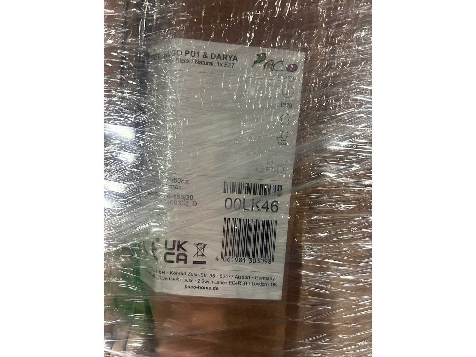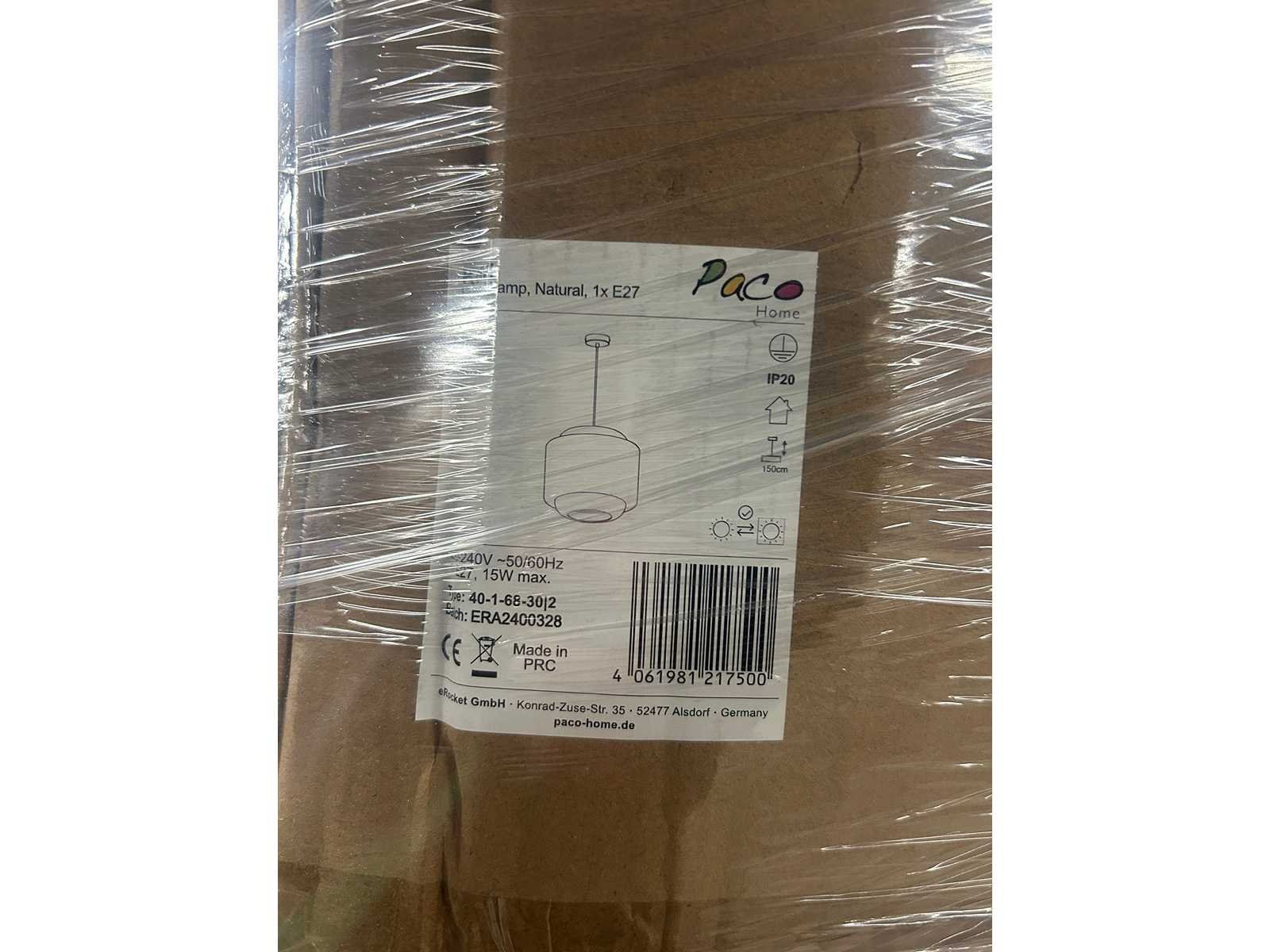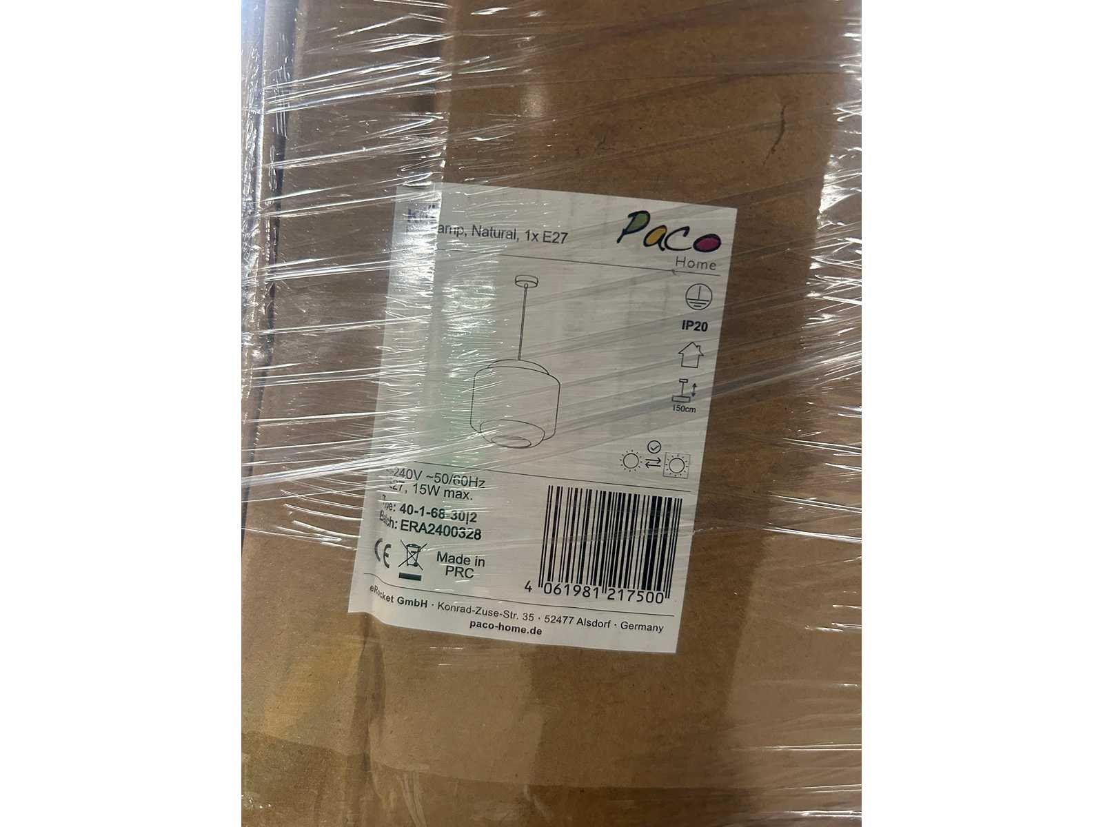 Pallet met design verlichting van Paco Home, rechtstreeks afkomstig uit het fulfillment center. De dozen zijn ongeopend en niet gesorteerd. De inhoud kan bestaan uit nieuwe producten, demo-artikelen of items met beschadigingen of ontbrekende onderdelen. Soms gaat het alleen om een beschadigde verpakking, maar het kan ook voorkomen dat het product zelf beschadigd of incompleet is.