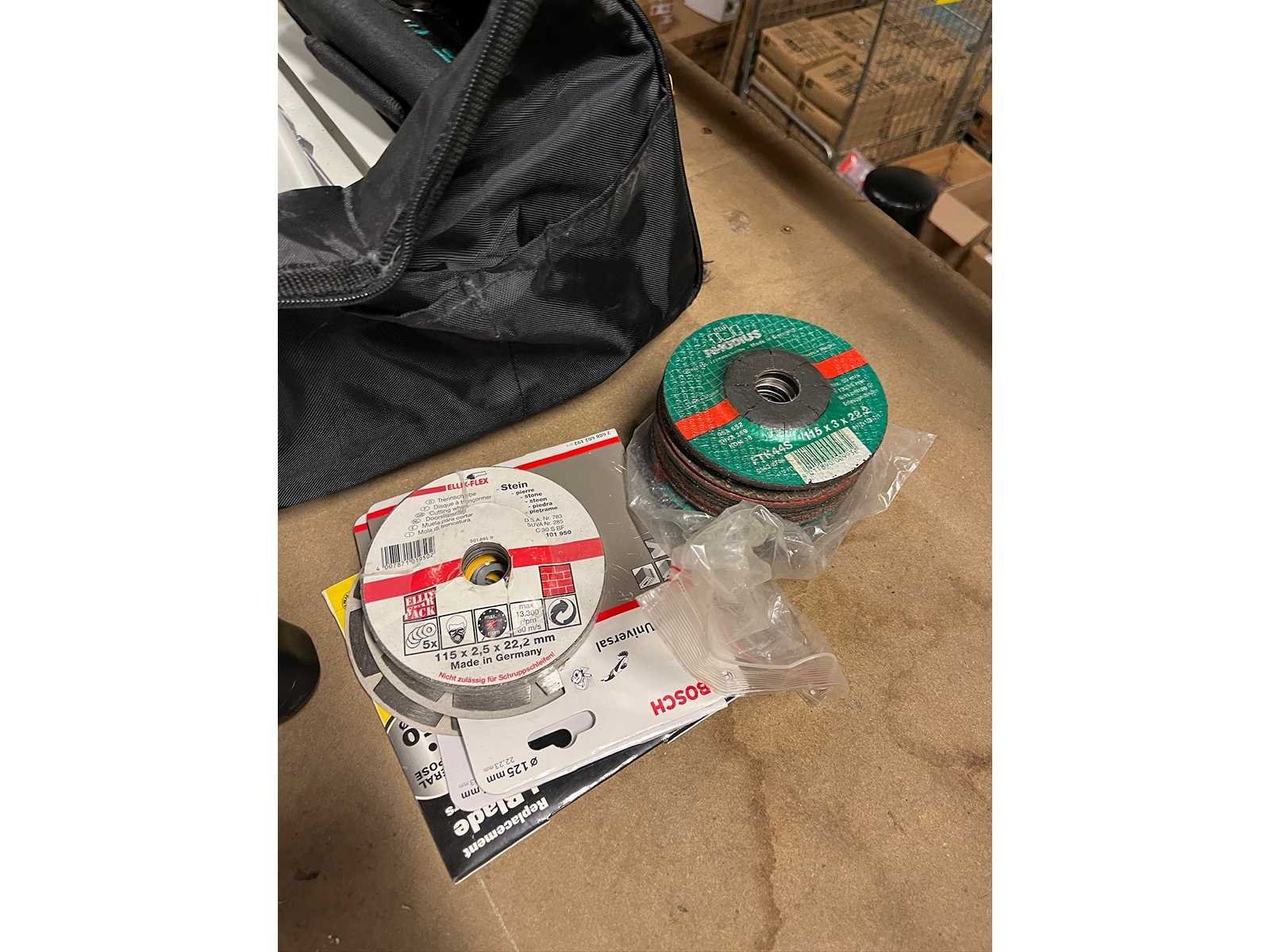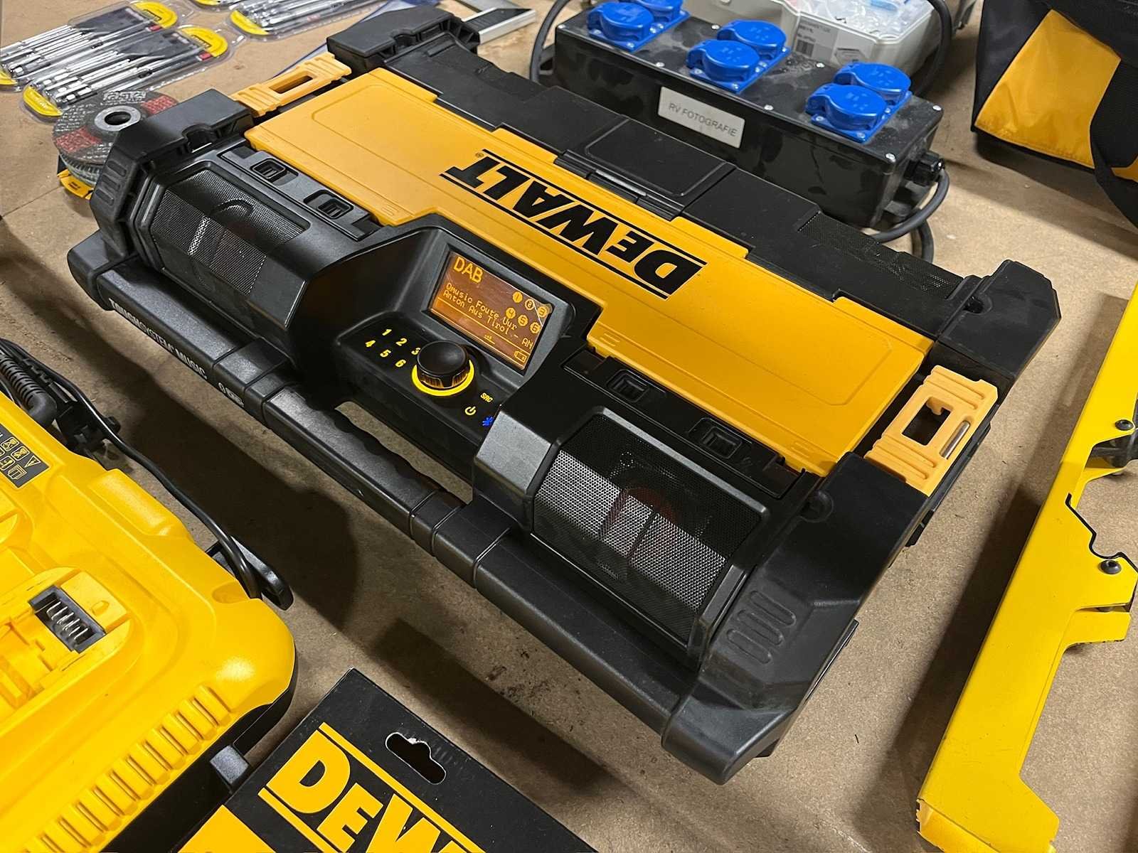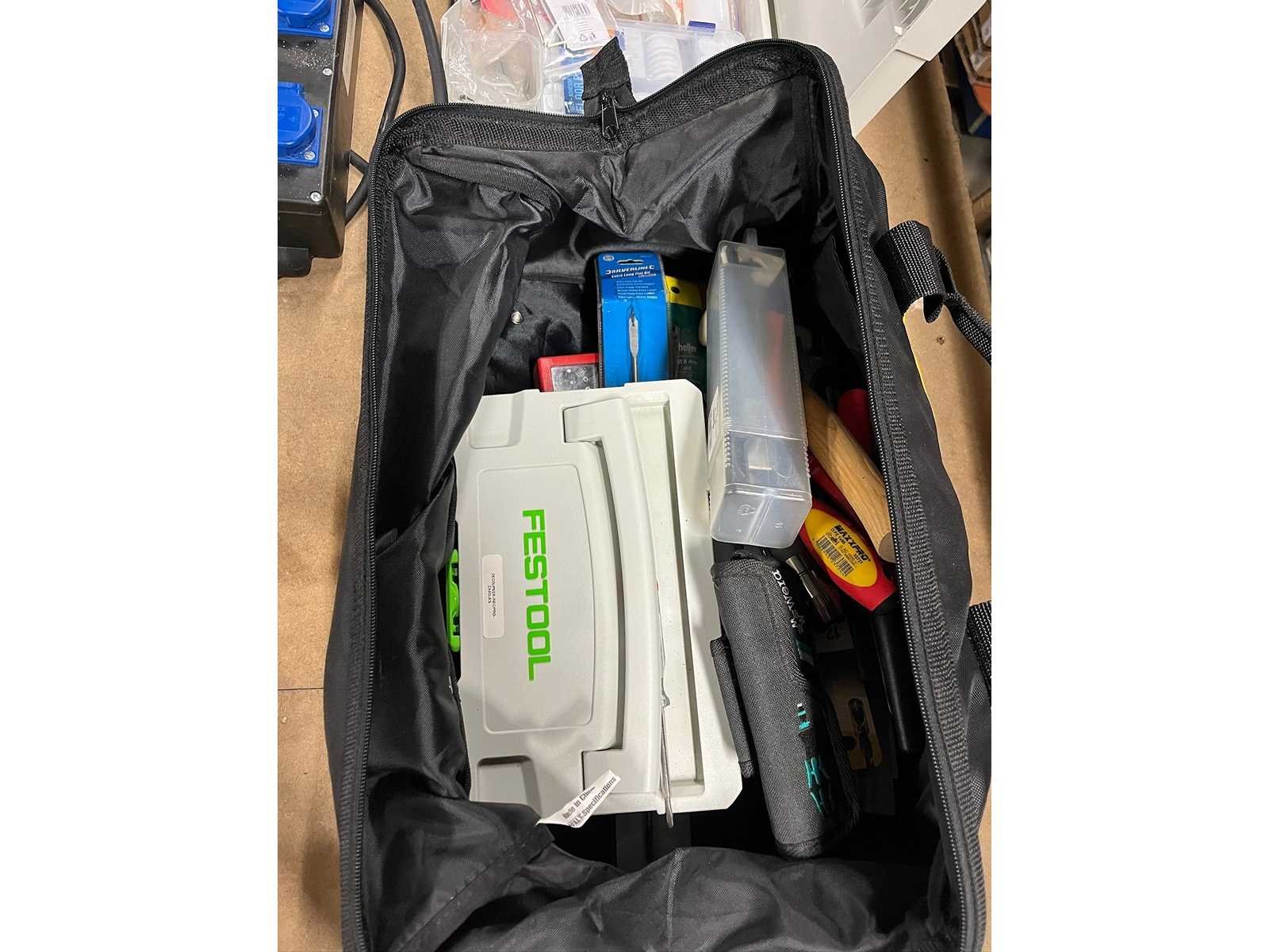 Demo set. Kavel bestaat uit: Schroeven Festool opbergkoffers Schuurpapier Klein gereedschap in tas DCS 380 + DCF850 met koffer Dewalt radio Onderstel voor afkortzaag 4x accu