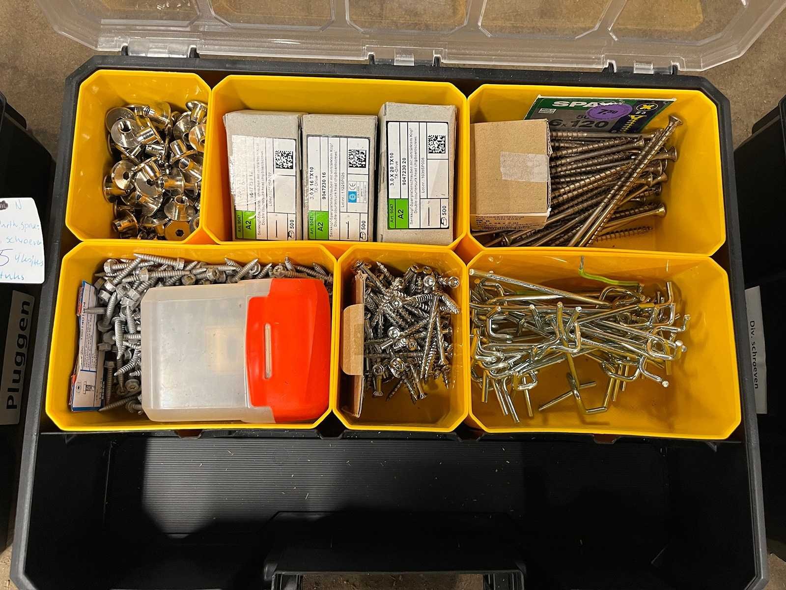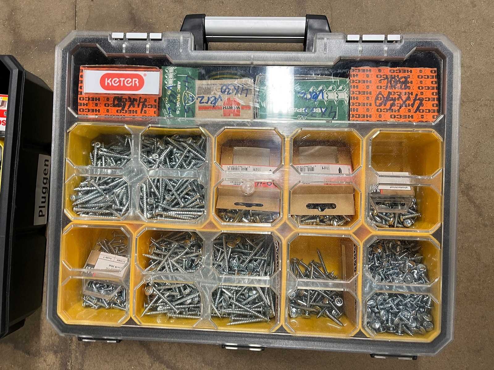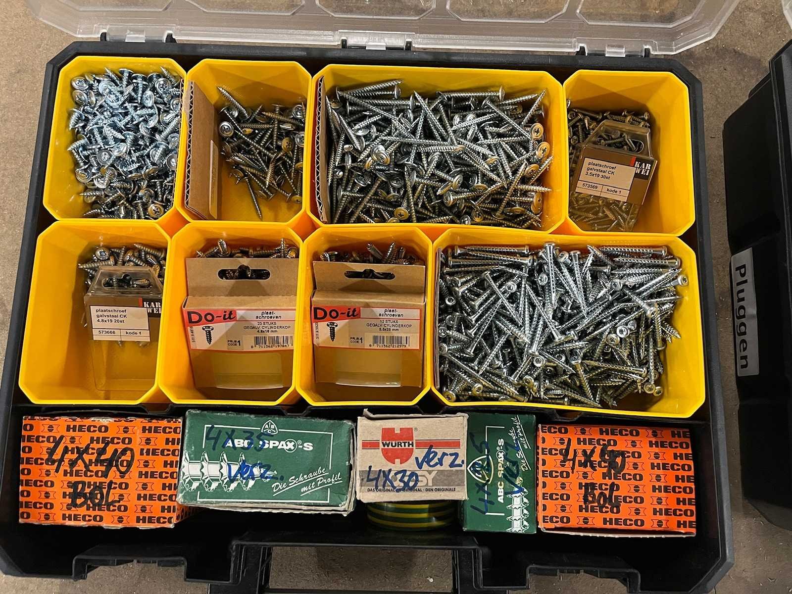 Partij schroeven en pluggen in 4 organizers (o.a. borgh, heco, fischer, spax, wago)