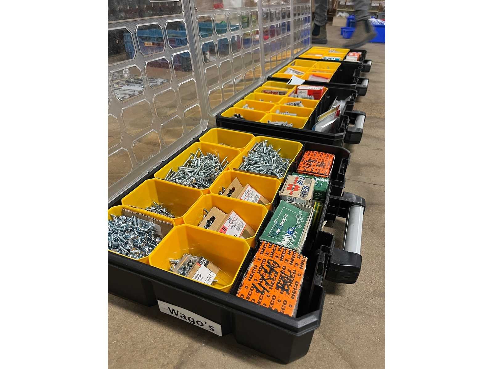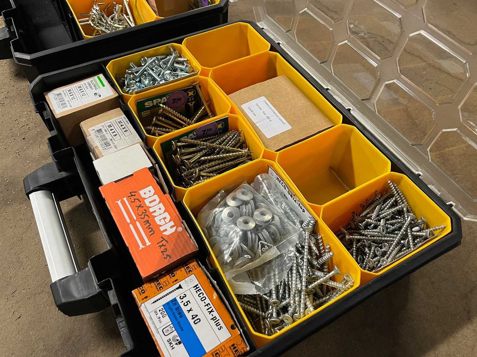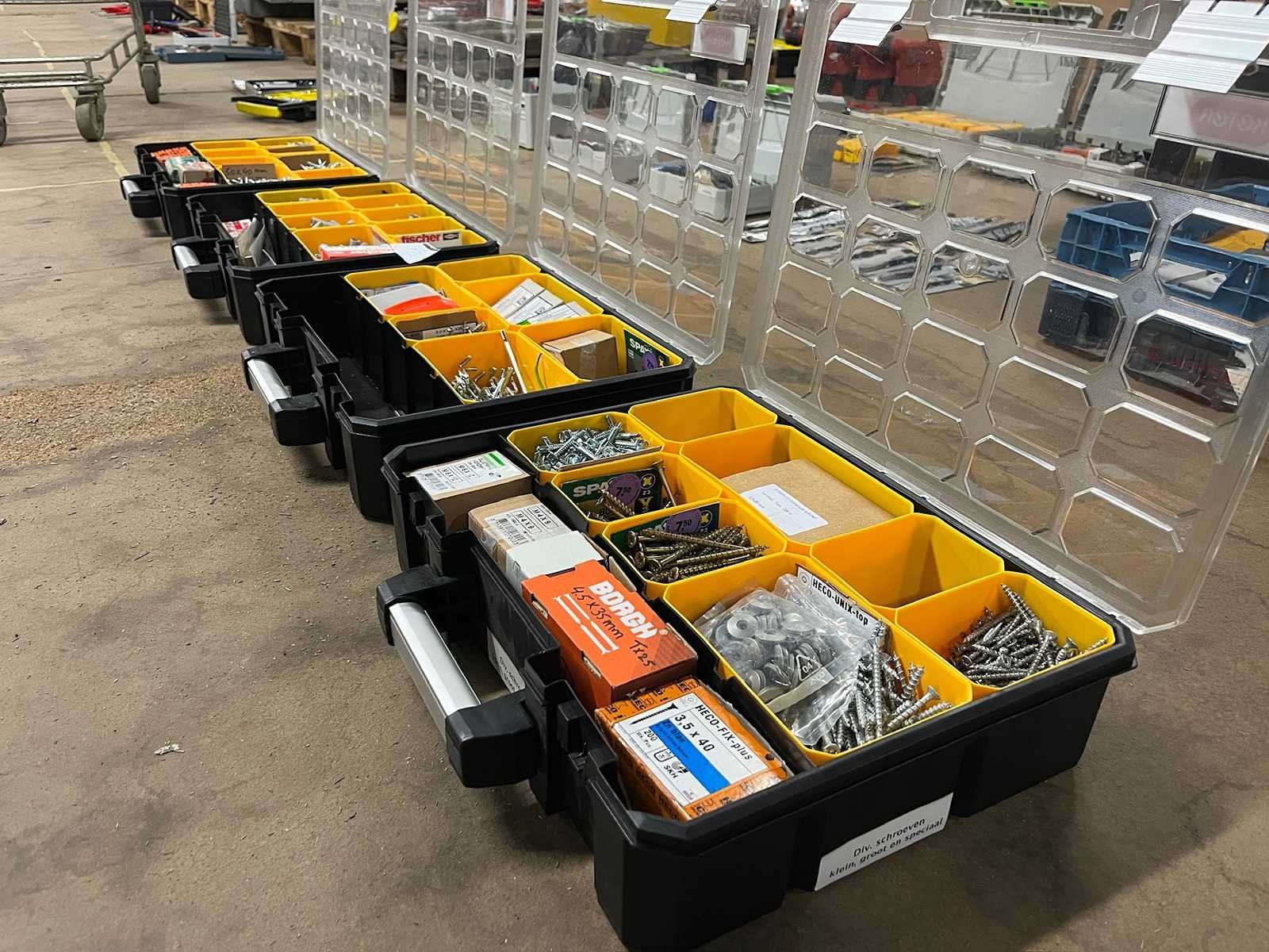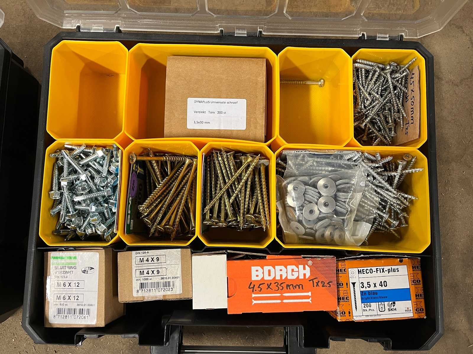 Partij schroeven en pluggen in 4 organizers (o.a. borgh, heco, fischer, spax, wago)
