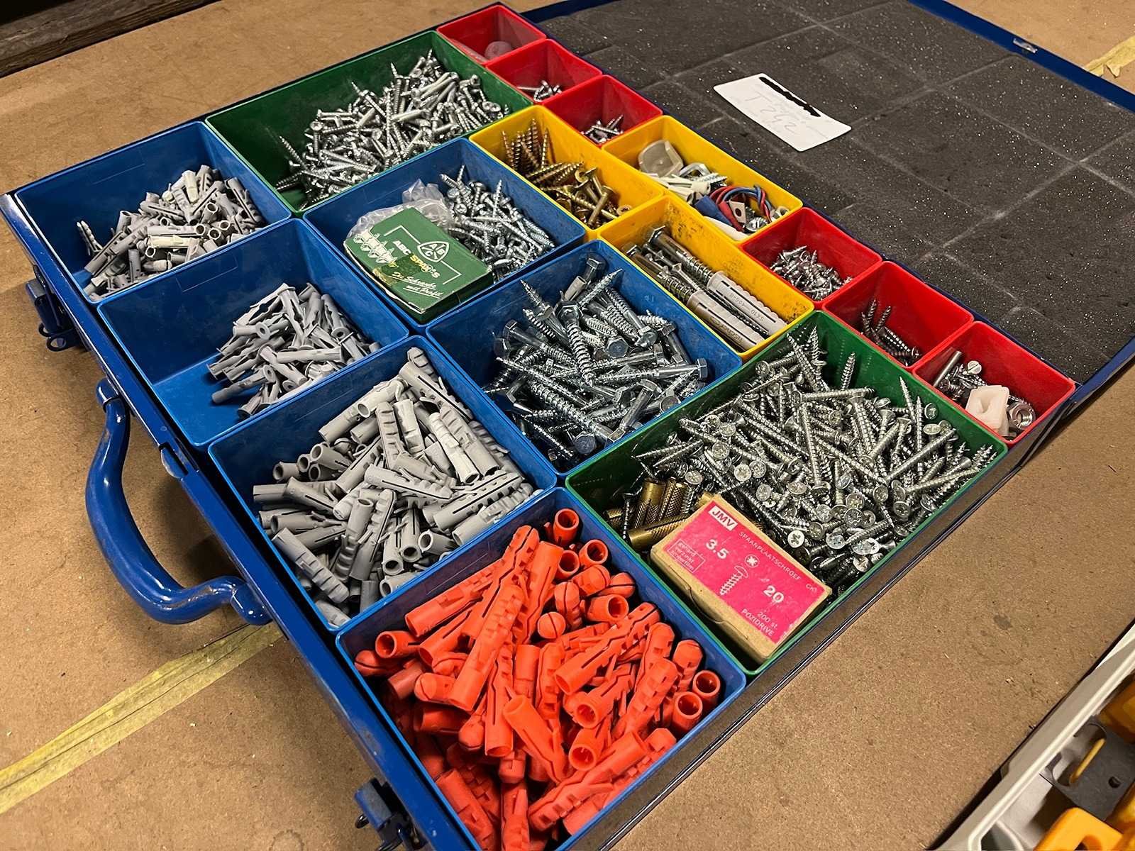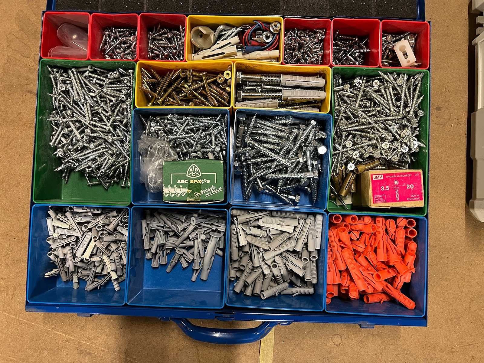 Partij schroeven en pluggen (ca. 1000) in metalen assortimentskist