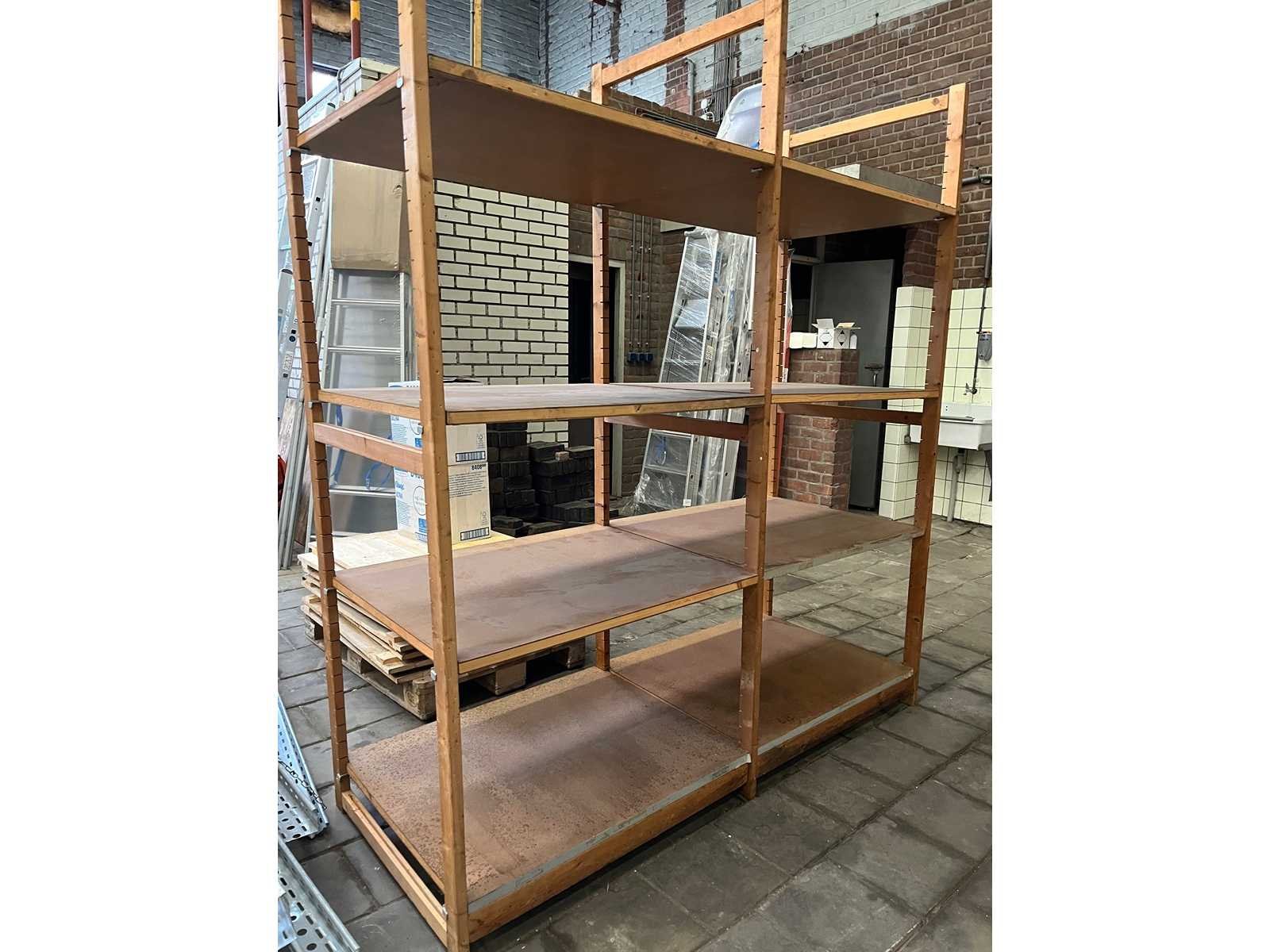 Bruynzeel - 12 meter houten magazijnstelling (15 staanders, 48 legborden)