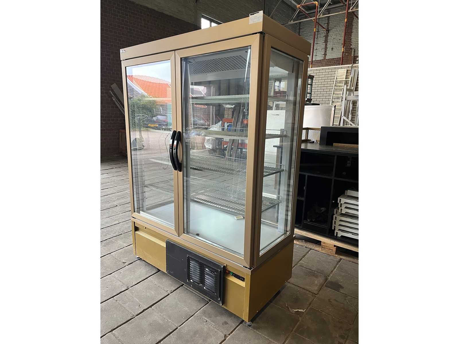 Gebruikt. De 7400 PV is een ruime gebaksvitrine van Tekna. Standaard wordt de vitrine geleverd op zwenkwielen, met de mogelijkheid deze wielen te blokkeren door uitdraaibare stelpoten. Uitgevoerd met 4 zijden glas en 10 verchroomde roosters (510×430 mm) of 5 verchroomde etages. De kast beschikt over automatische ontdooiing. De vitrine van Tekna is geleverd in bronzen kleur. De temperatuur is eenvoudig te regelen via het digitale bedieningspaneel en display. Dit kan binnen een bereik van 0 tot +10 °C. Deze vitrine maakt gebruik van een geforceerd koelsysteem, wat zorgt voor een constante en gelijkmatige temperatuur, ook als de kast vaak wordt geopend. Merk: Tekna Type: 7400 PV Mobiel: true Temperatuurbereik max.: 10°c Aansluiting: 230V Temperatuurbereik min.: 0°c Eigen gewicht: 275kg Totale afmeting L: 1320mm Totale afmeting Breedte: 640mm Totale afmeting Hoogte: 1930mm Capaciteit.: 880l