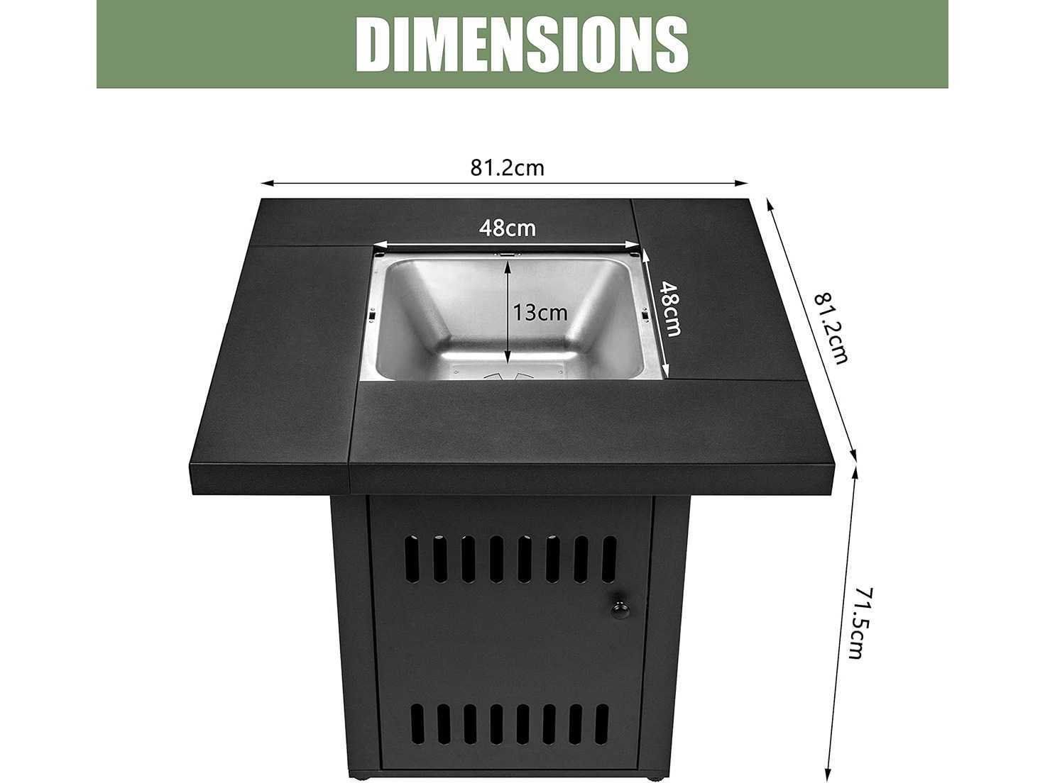 Nieuw in doos. Afmetingen: vuurtafel (b x h x d) ca. 81,2 x 70 x 81,2 cm, grillrooster (l x b) ca. 41 x 41 cm. Materiaal: tafel van staal. Gewicht: ca. 25,2 kg. Lengte: 81,2cm Breedte: 81,2cm Hoogte: 70cm