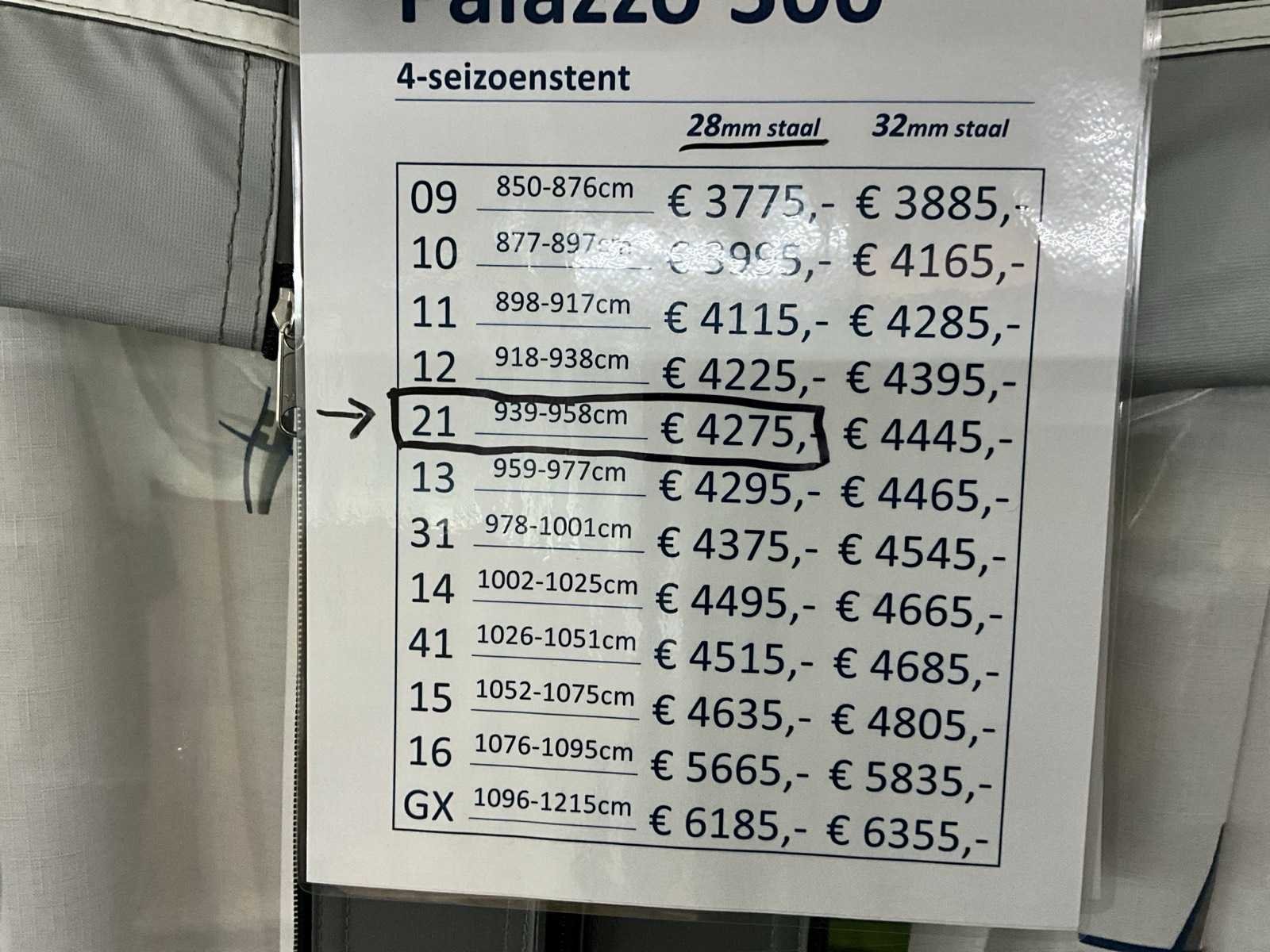 Omloopmaat: 21, 939-958 cm, voortentdiepte: 300 cm, dakmateriaal: dubbelzijdig PVC 550 gr/m2, wandmateriaal: TenCate AllSeason / PVC, frame: staal Ø 28x1 mm Merk: Brand Product type: Palazzo 300 Lengte: 330cm Breedte: 540cm Hoogte: 248cm