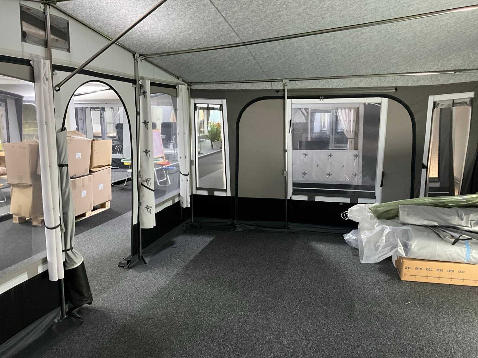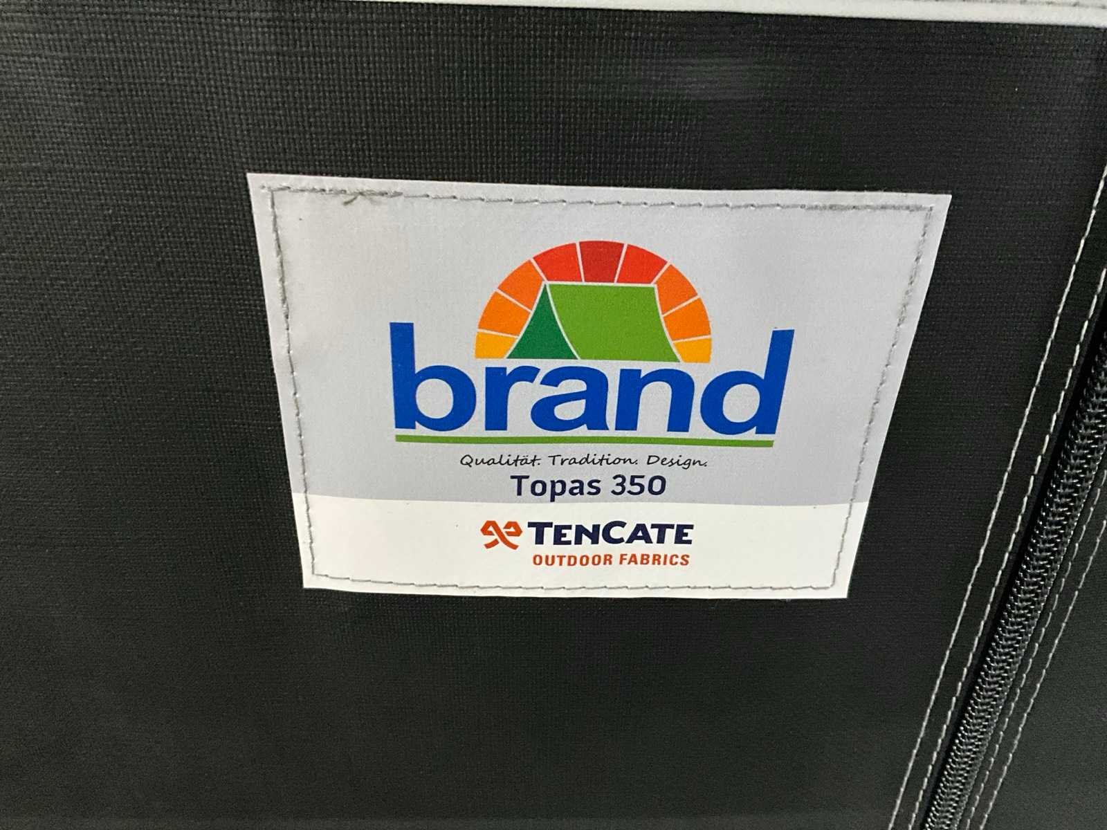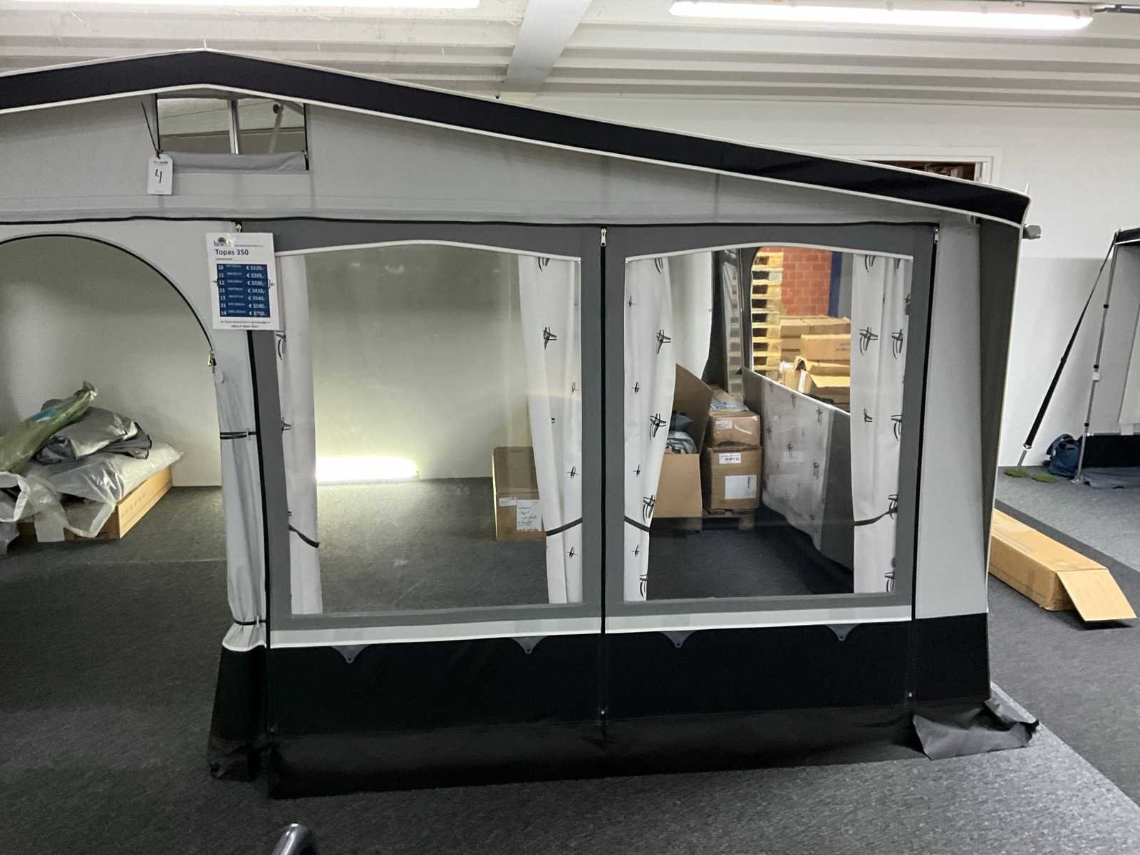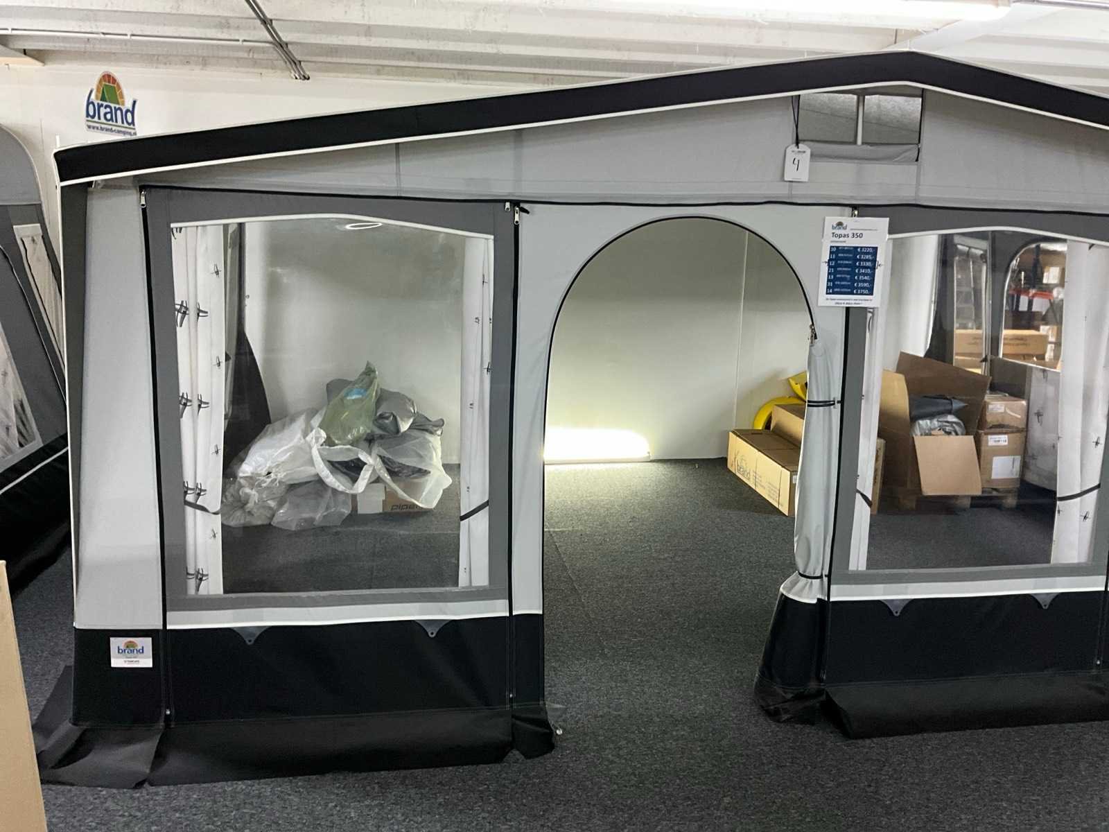 Omloopmaat: 12, 918-938 cm, voortentdiepte: 350 cm, dakmateriaal: TenCate Residential 260 grams, wandmateriaal: TenCate AllSeason 240 grams, frame: Staal Ø 28x1 mm Merk: Brand Product type: Topas 350 Lengte: 280cm Breedte: 510cm Hoogte: 250cm