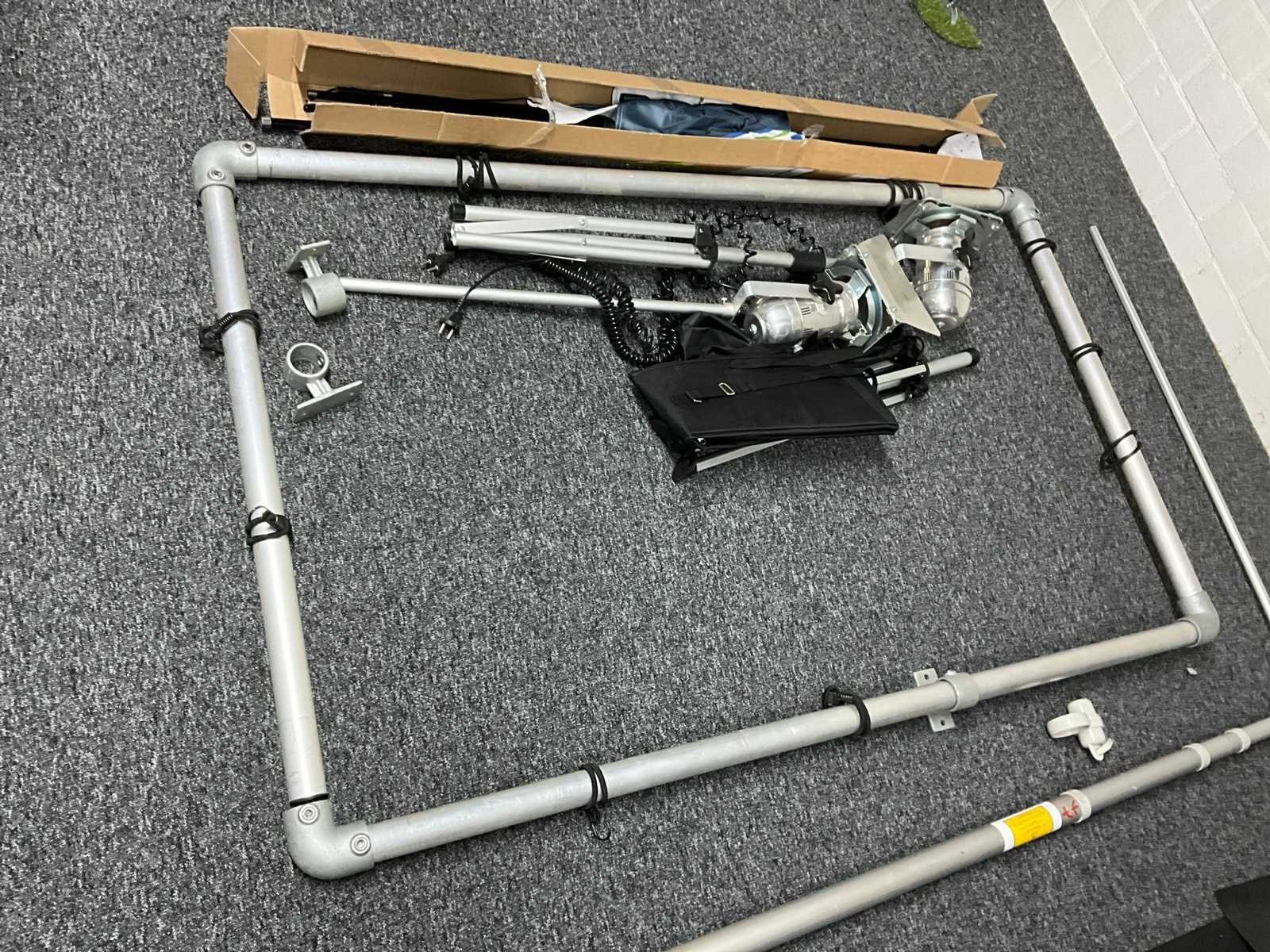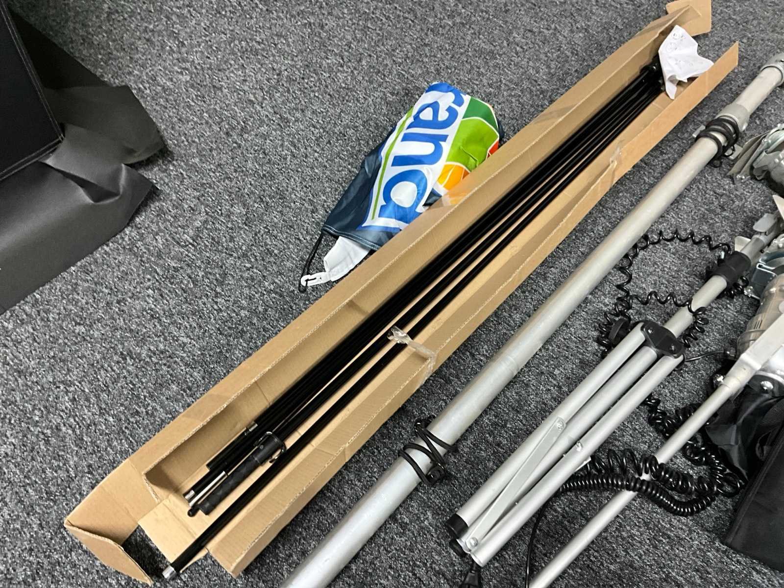 Inclusief beachvlag met 2x mast, 2x lamp op statief, spandoekframe afmeting binnenmaat circa: 1680x960 mm, afmeting uitschuifbare vlaggenmast circa 1260x1860 mm .