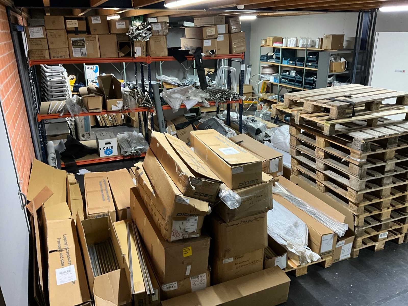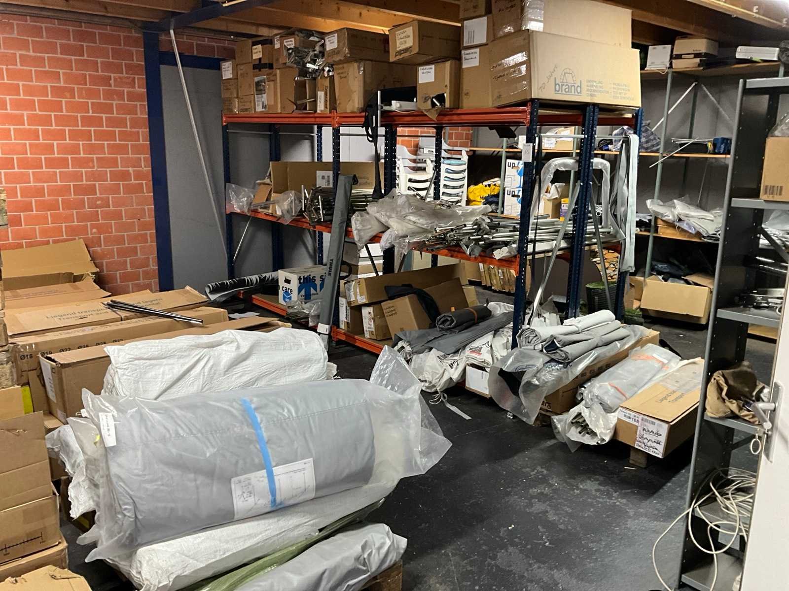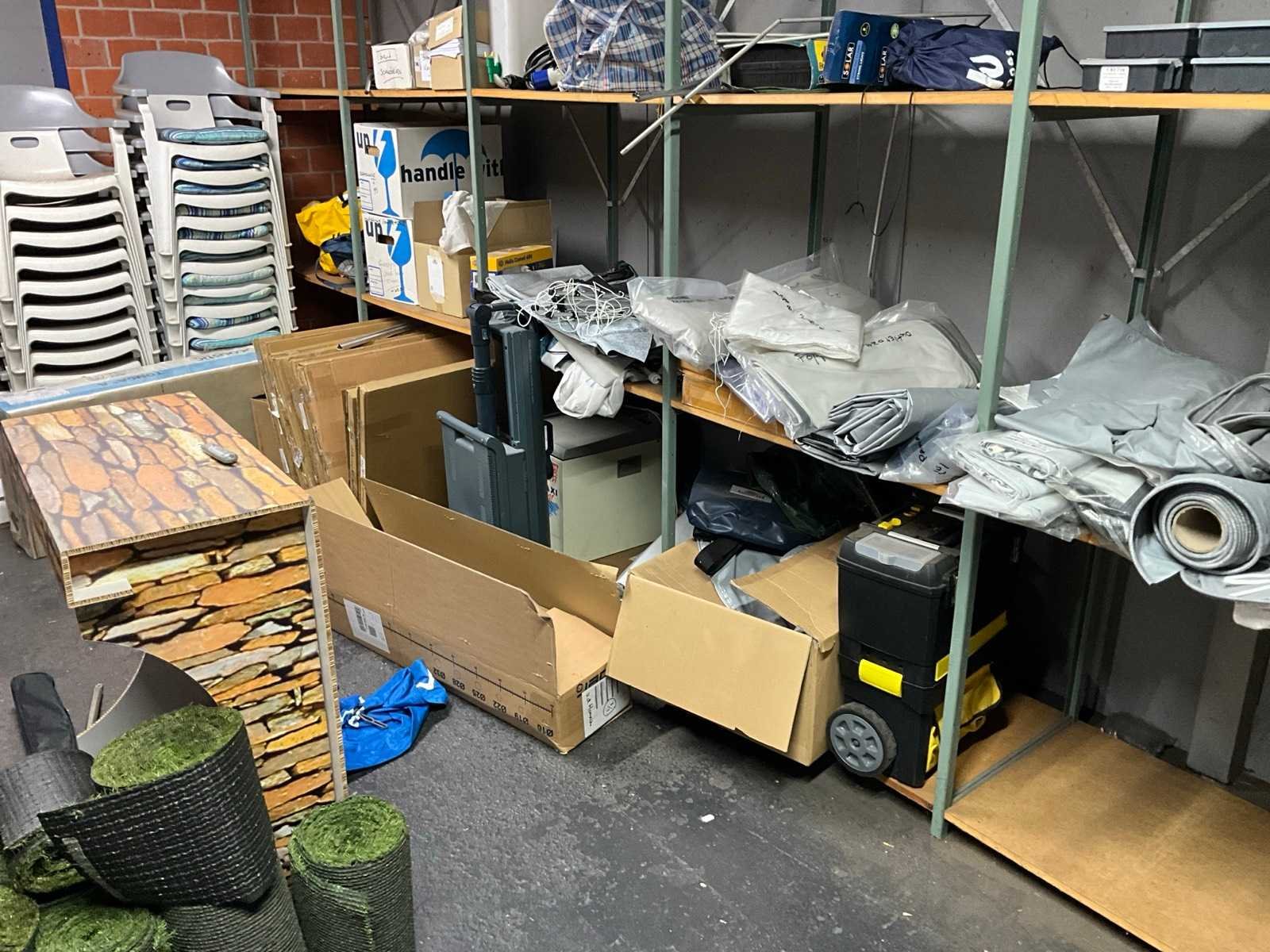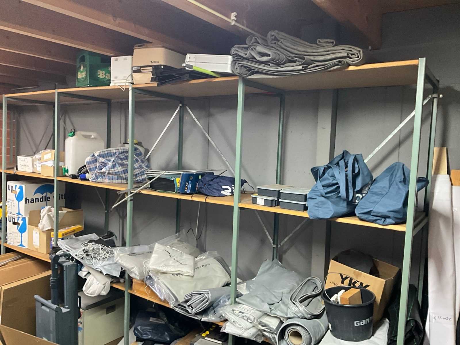 Betreft inhoud opslag, waaronder: 4x stelling met inhoud, magazijnbakken, partij aluminium en stalen frame stangen en onderdelen, diverse (in)complete voortent frames, diverse (in)complete tenten zonder frame, etc