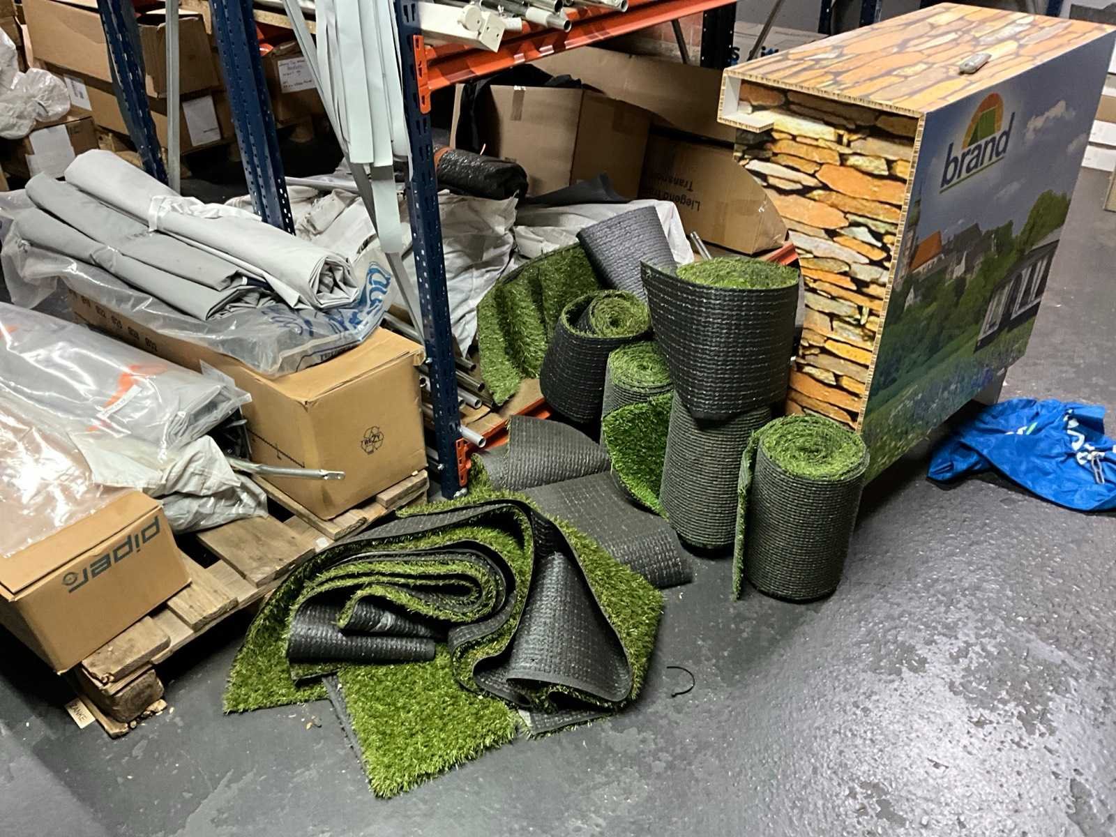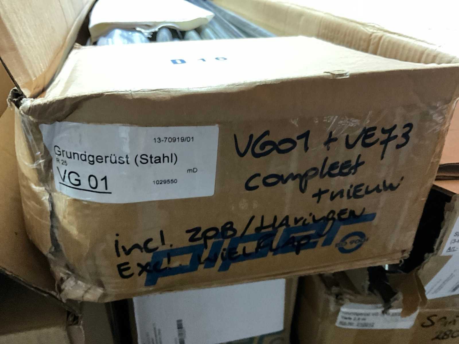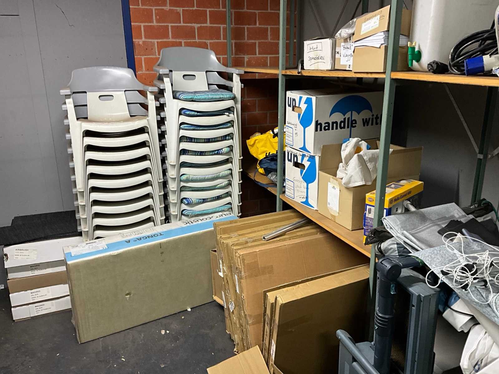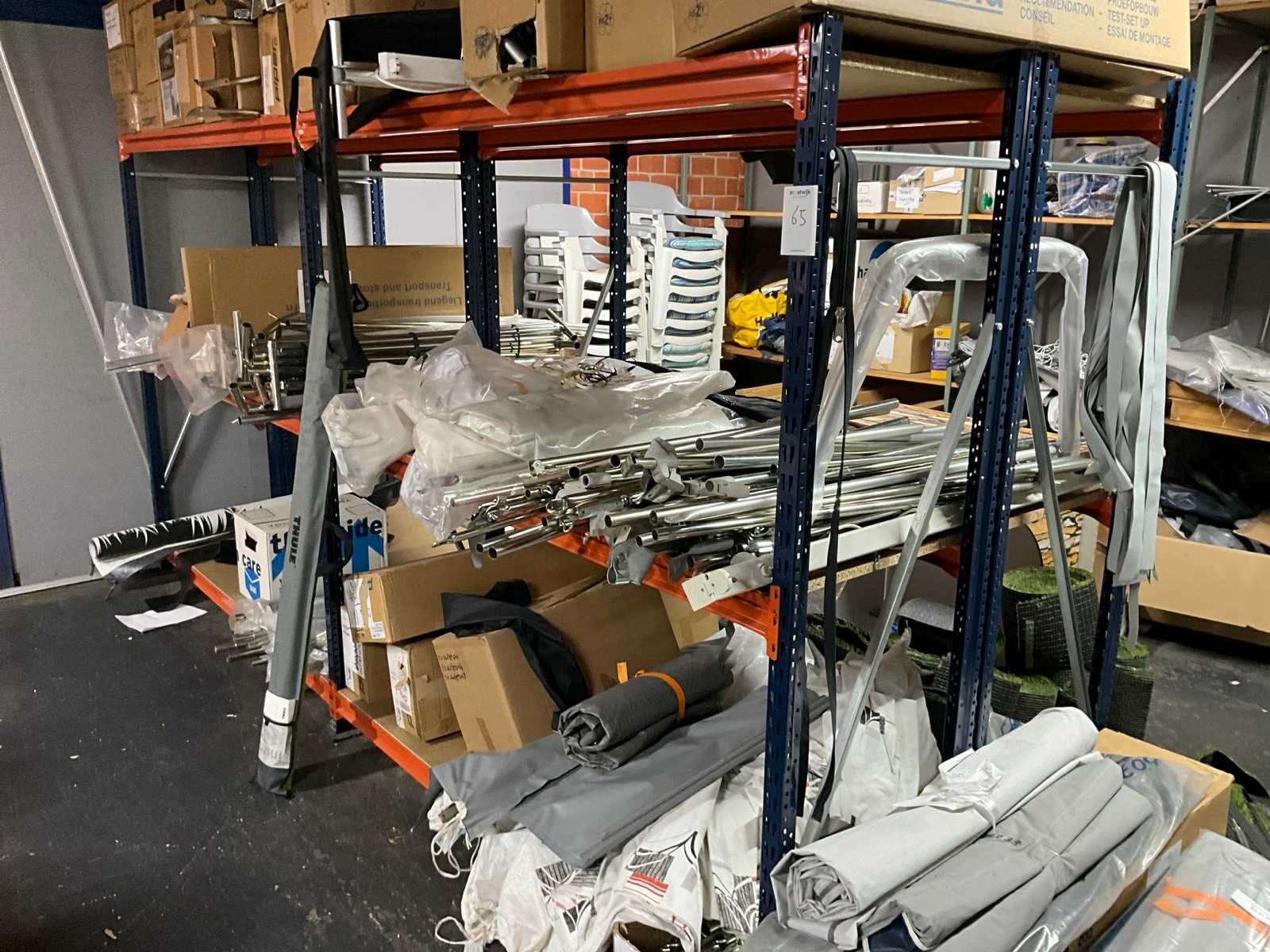 Betreft inhoud opslag, waaronder: 4x stelling met inhoud, magazijnbakken, partij aluminium en stalen frame stangen en onderdelen, diverse (in)complete voortent frames, diverse (in)complete tenten zonder frame, etc
