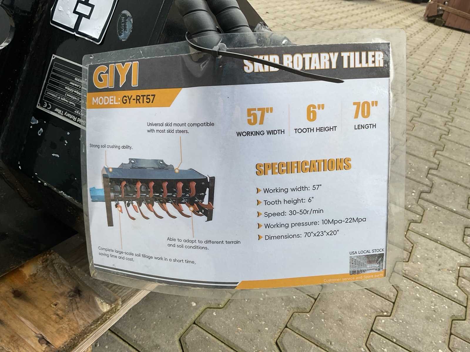 Voorzien van Werkbreedte: 1450 mm; Aansluiting: skid steer quick attach; Hydraulische leidingen: aanwezig; Eigen gewicht: 150 kg; Afmetingen; 1650 mm × B 500 mm × H 500 mm; Olieflow: 49–76 L/min; Werkdruk: 9–14 MPa; Rotorsnelheid: 30–50 rpm; Tandenhoogte: 15 cm; Ongebruikt Merk: GIYI Type: RT57 Bouwjaar: 2025