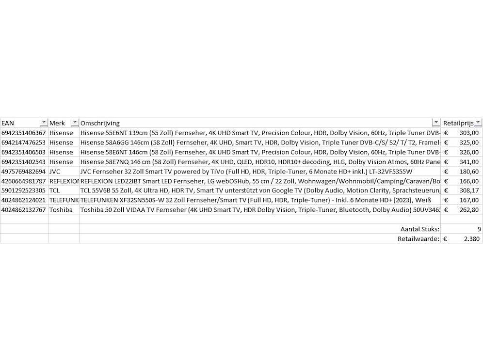 Dit betreft een partij televisies retourgoederen van een grote online retailer. De partij bestaat uit diverse diverse maten televisies. Aantal stuks: 9. Retailwaarde: €2380,- De televisies zijn niet werkend en zijn te gebruiken voor onderdelen. Kom op de kijkdag om te om zo een goed beeld te krijgen van de reden van retour. Zie foto's voor lijst met inhoud. Bezorgtermijn 14 dagen Merk: Pallet Retourgoederen - Televisies