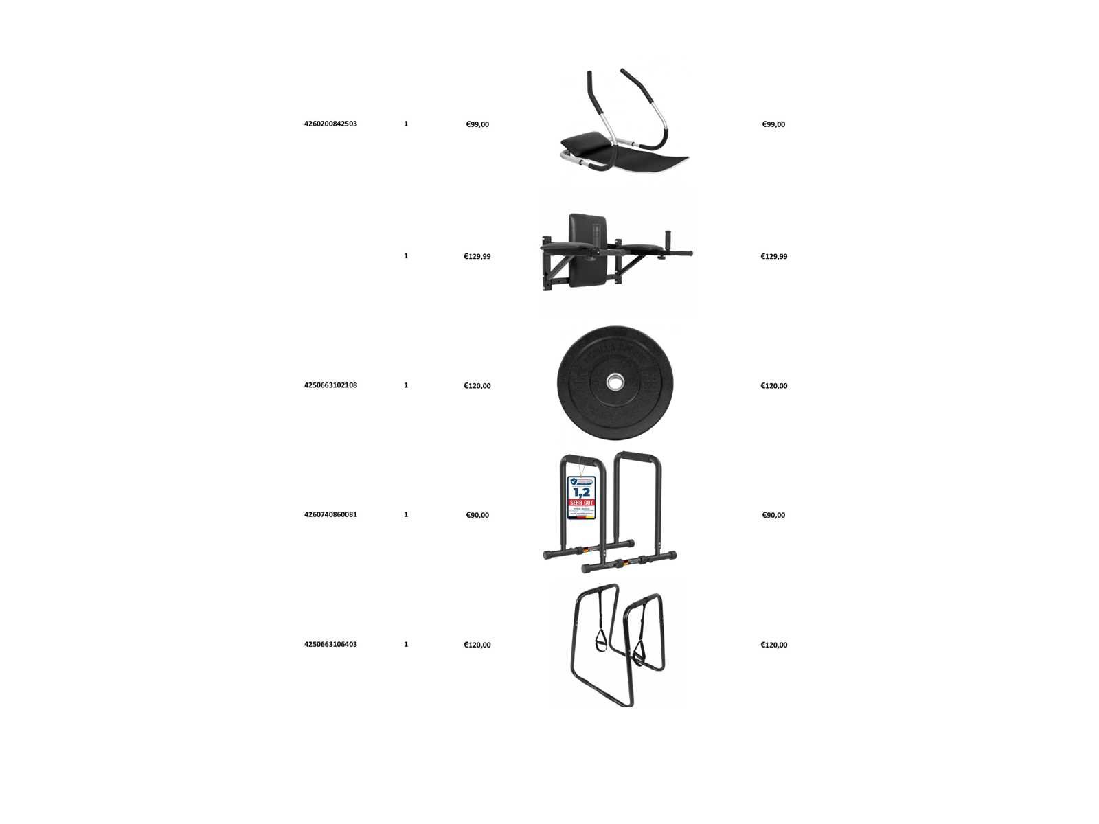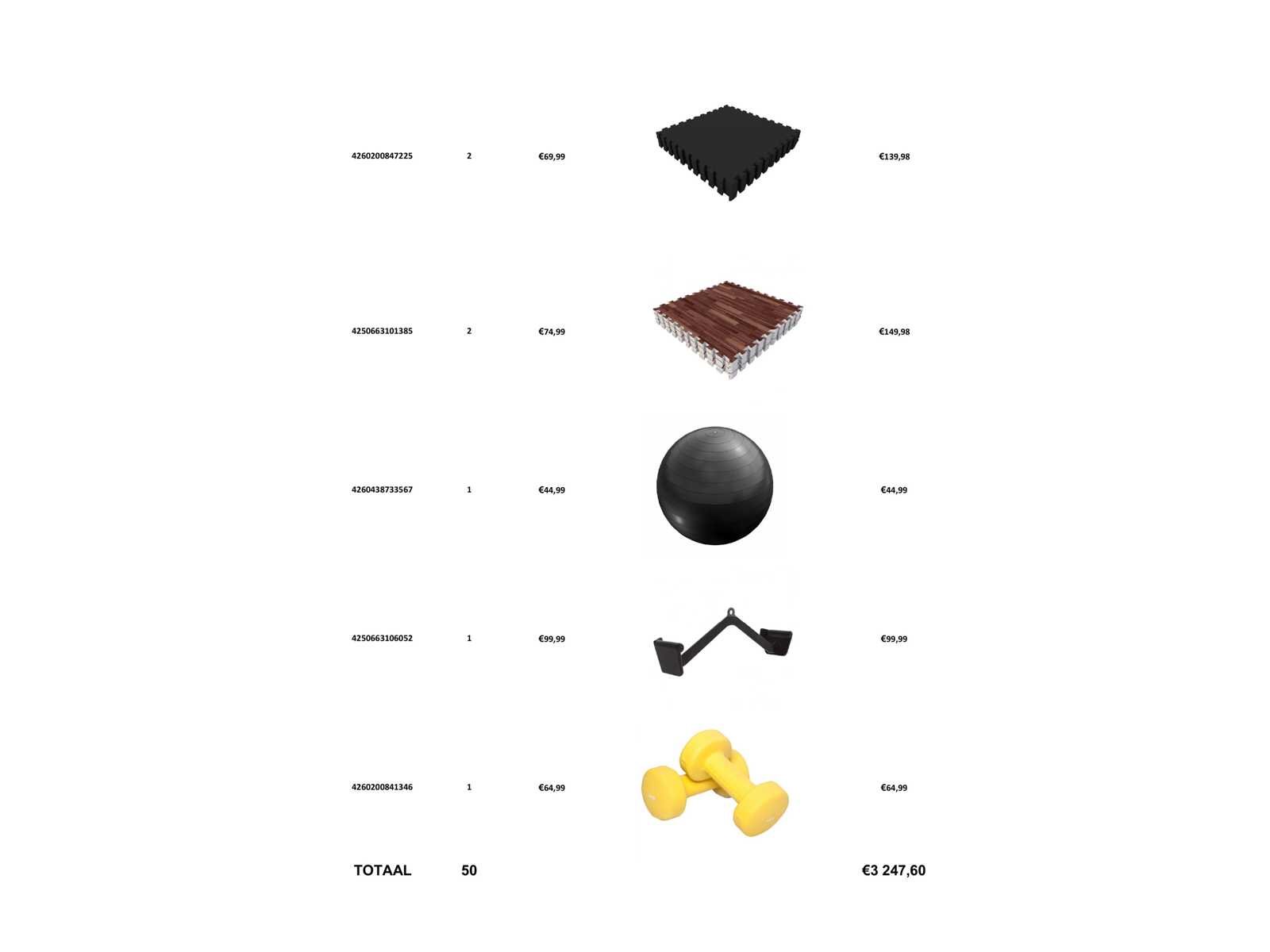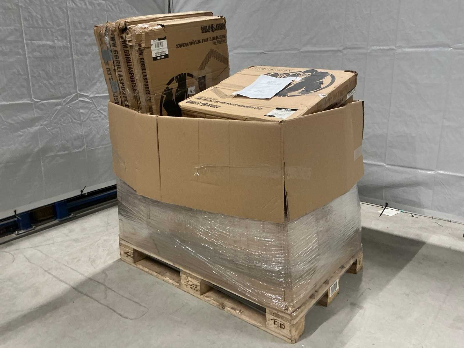Gemengde pallet met kracht- en fitnessapparatuur. Zwaartepunt op halterschijven. kettlebells en vrije gewichten. Aangevuld met trainingsaccessoires en functionele fitnessapparatuur. Inhoud omvat o.a.: halterschijven (diverse gewichten), kettlebells, hantels, medicine balls, beschermmatten, dip bars, push-up stands, trainingsbank/roman chair en overige trainingscomponenten. Geschikt voor sportscholen, PT-studio's, wederverkoop of thuisfitness. Merk: Pallet
