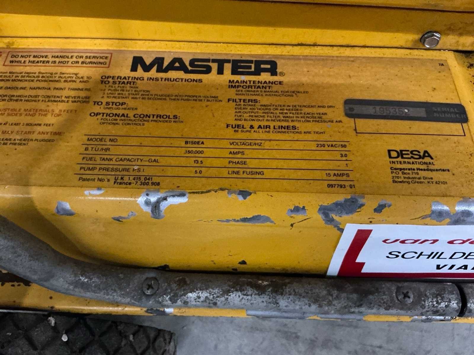 Merk: Master Type: B150EA Vermogen: 44kW Ventilator: true Aansluiting: 230V