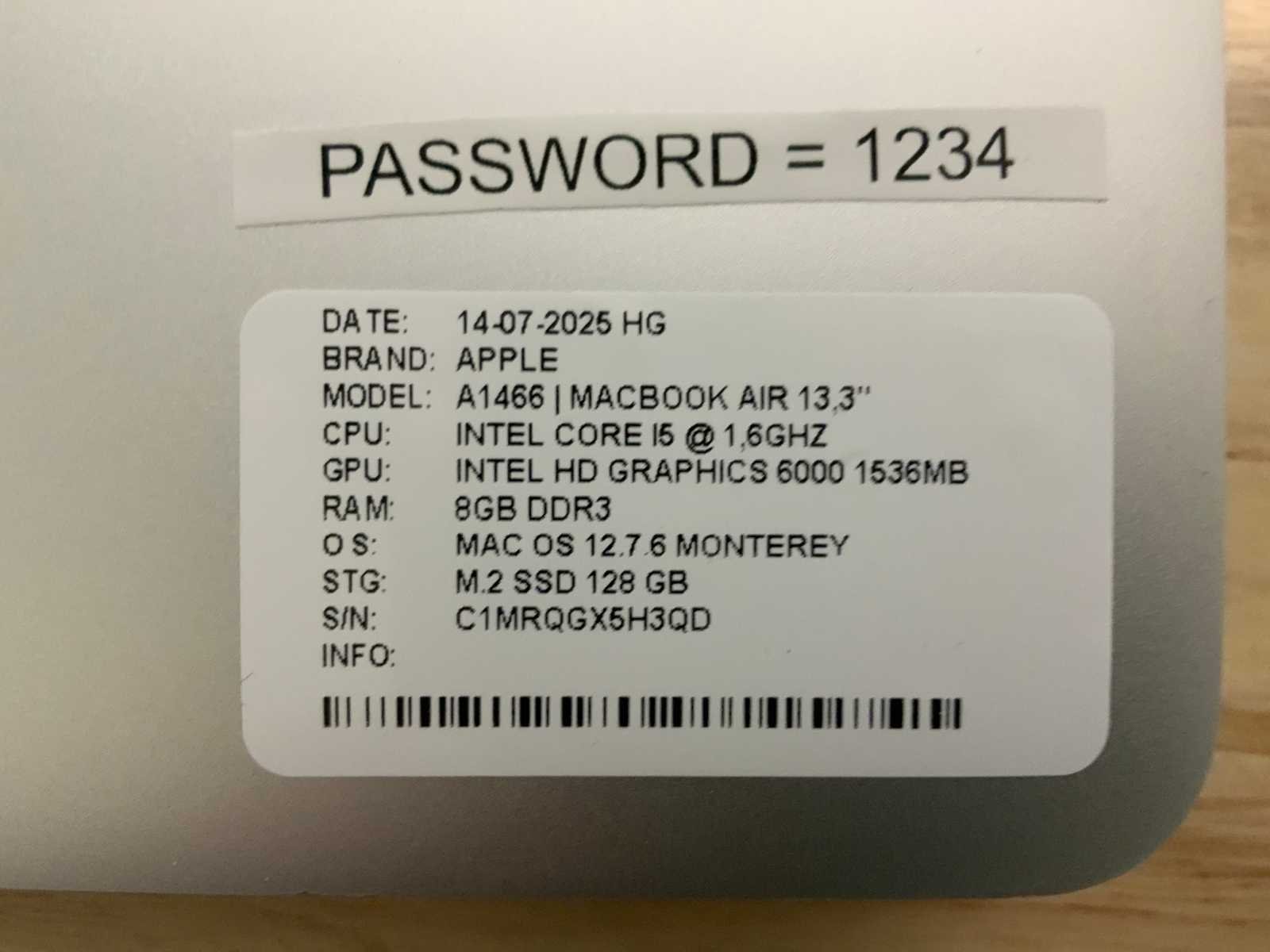 Merk: Apple Type: MACBook Air A1466 Processor type: Intel core i5 Processorsnelheid Ghz: 1,6 RAM Geheugen: 8GB RAM Geheugen Type: DDR3 Totale opslagcapaciteit: 128GB Type datadrager: M.2 NVMe Aantal datadragers: 1 Type videokaart: Intel HD Graphics 6000 Besturingssysteem: Monterey Zonder adapter: true Beelddiagonaal: 13'' Wifi: true Bluetooth: true USB-Type: USB-A USB poorten: 2 Card reader: true Thunderbolt: true Koptelefoon aansluiting: true Webcam: true Toetsenbord: QWERTY