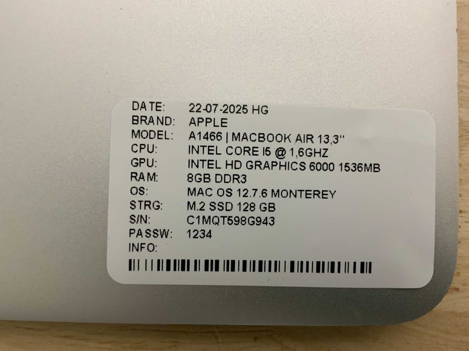 Merk: Apple Type: MACBook Air A1466 Processor type: Intel core i5 Processorsnelheid Ghz: 1,6 RAM Geheugen: 8GB RAM Geheugen Type: DDR3 Totale opslagcapaciteit: 128GB Type datadrager: M.2 NVMe Aantal datadragers: 1 Type videokaart: Intel HD Graphics 6000 Besturingssysteem: Monterey Zonder adapter: true Beelddiagonaal: 13'' Wifi: true Bluetooth: true USB-Type: USB-A USB poorten: 2 Card reader: true Thunderbolt: true Koptelefoon aansluiting: true Webcam: true Toetsenbord: QWERTY