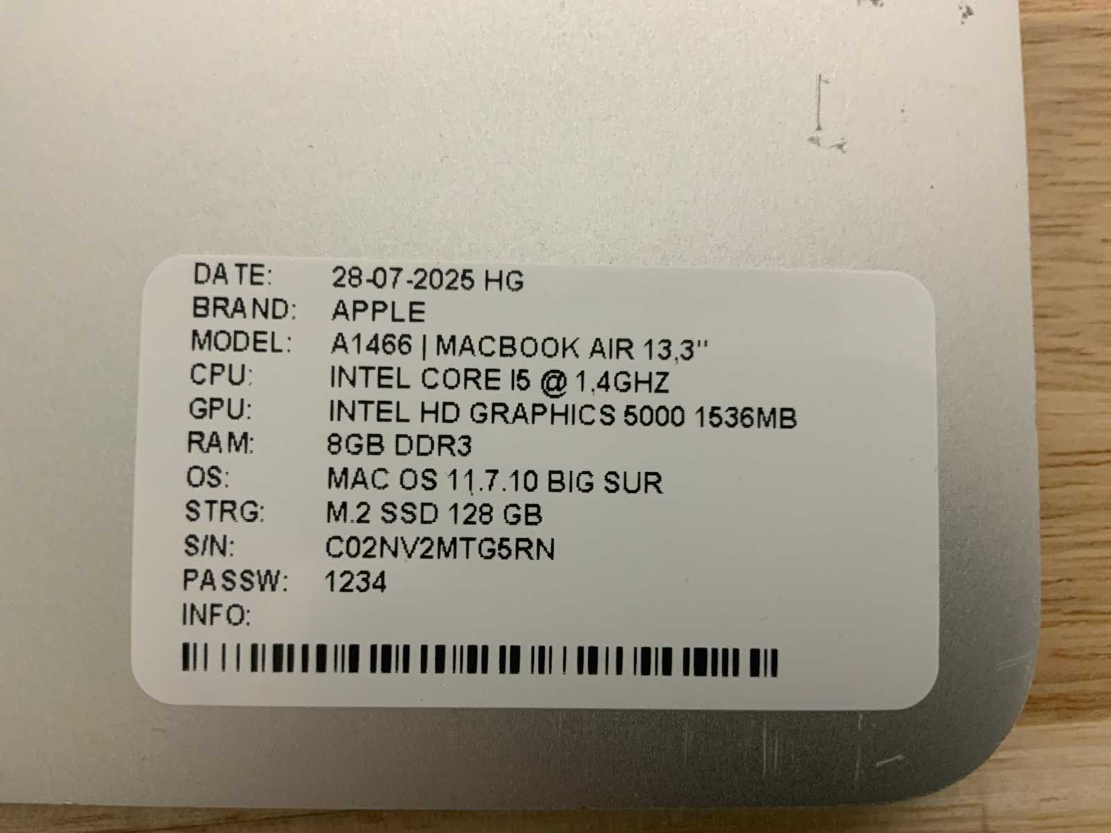 Merk: Apple Type: MACBook Air A1466 Processor type: Intel core i5 Processorsnelheid Ghz: 1,40 RAM Geheugen: 4GB RAM Geheugen Type: DDR3 Totale opslagcapaciteit: 128GB Type datadrager: M.2 NVMe Aantal datadragers: 1 Type videokaart: Intel HD Graphics 5000 Besturingssysteem: BigSur/monterey Zonder adapter: true Beelddiagonaal: 13'' Wifi: true Bluetooth: true USB-Type: USB-A USB poorten: 2 Card reader: true Thunderbolt: true Koptelefoon aansluiting: true Webcam: true Toetsenbord: QWERTY