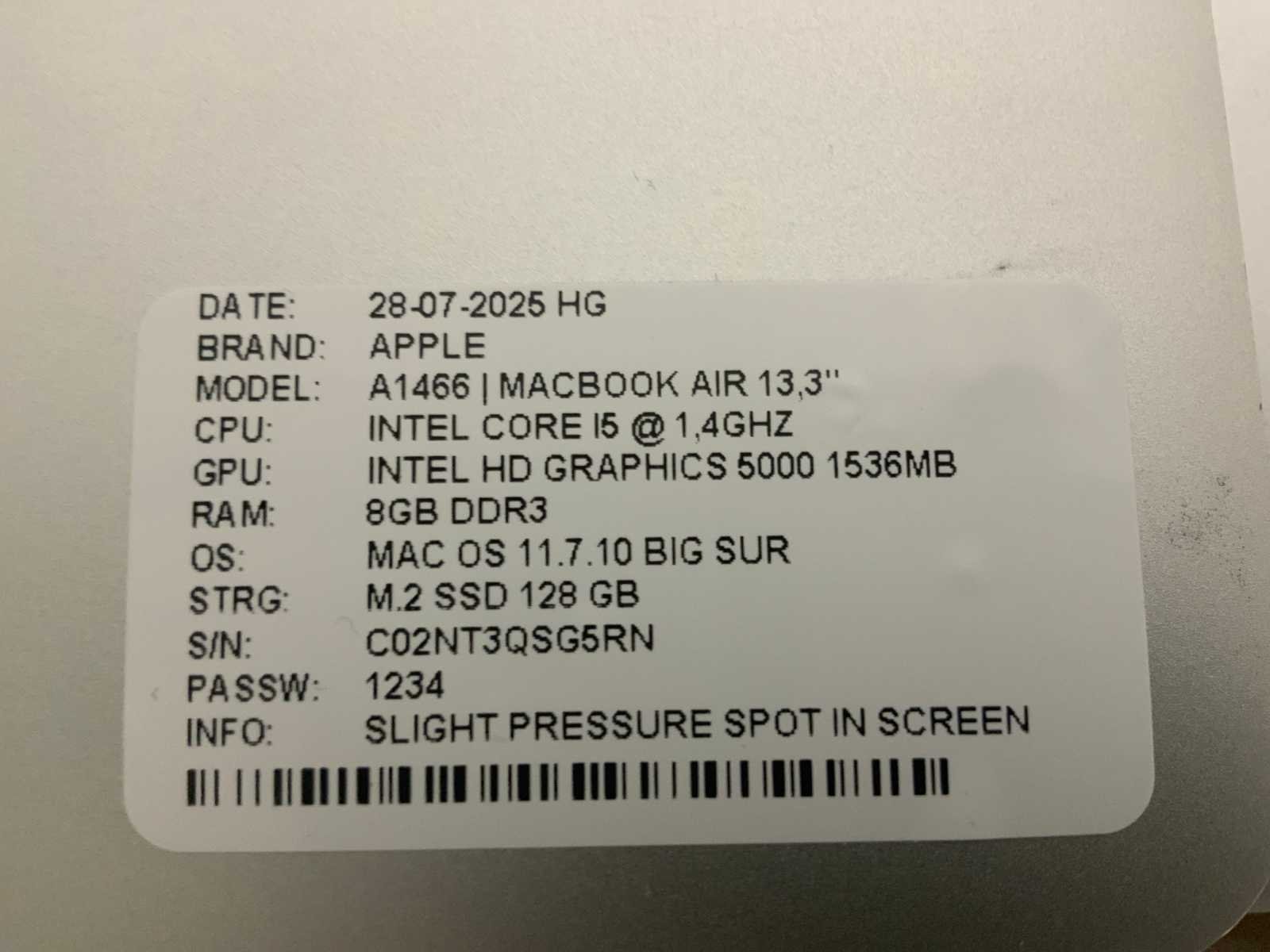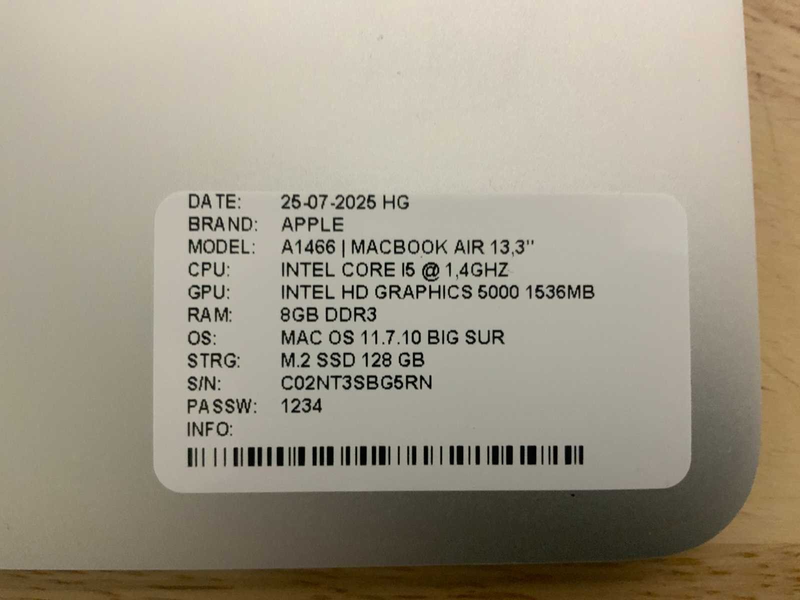 Merk: Apple Type: MACBook Air A1466 Processor type: Intel core i5 Processorsnelheid Ghz: 1,40 RAM Geheugen: 4GB RAM Geheugen Type: DDR3 Totale opslagcapaciteit: 128GB Type datadrager: M.2 NVMe Aantal datadragers: 1 Type videokaart: Intel HD Graphics 5000 Besturingssysteem: BigSur/monterey Zonder adapter: true Beelddiagonaal: 13'' Wifi: true Bluetooth: true USB-Type: USB-A USB poorten: 2 Card reader: true Thunderbolt: true Koptelefoon aansluiting: true Webcam: true Toetsenbord: QWERTY