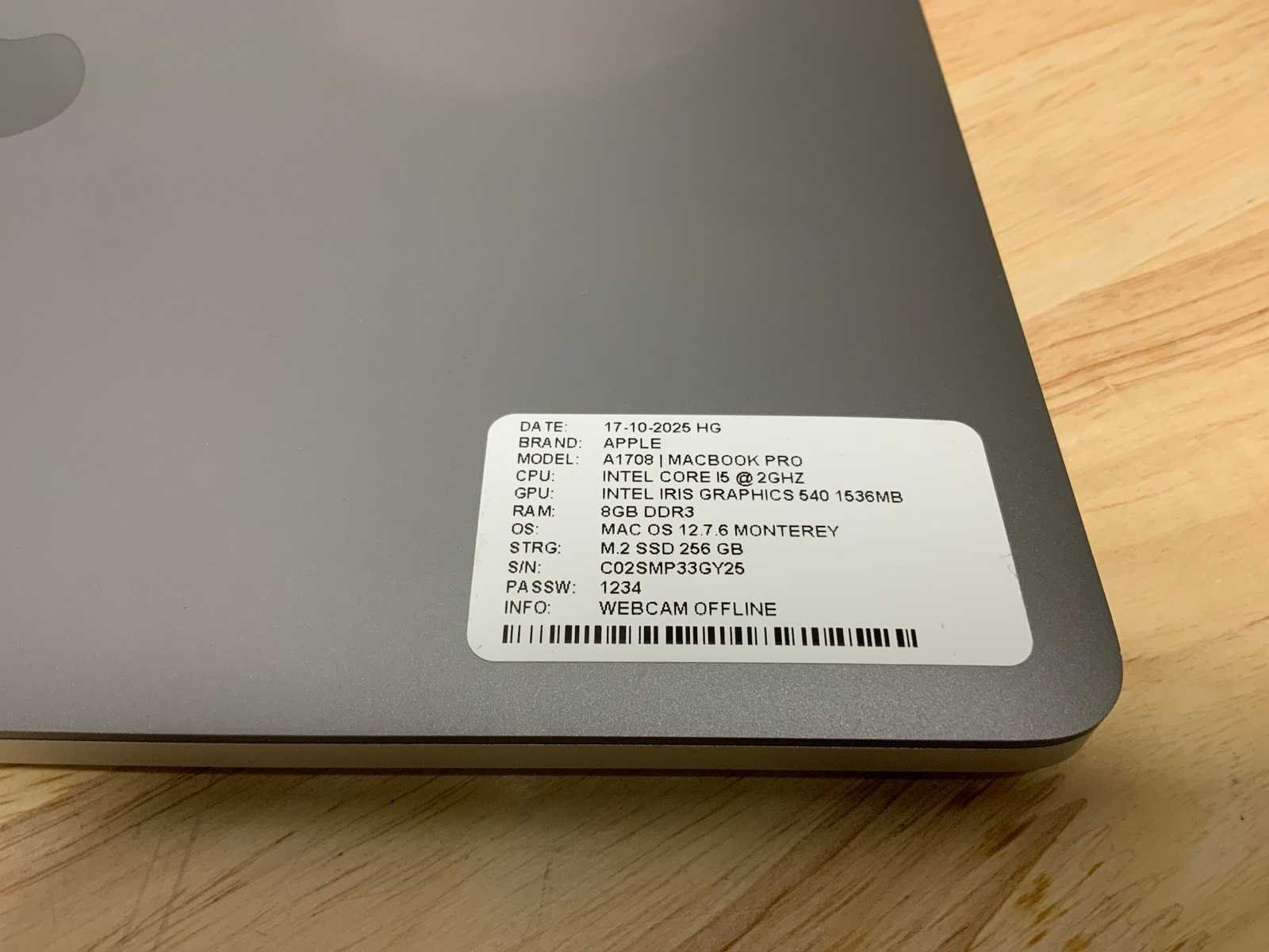 Merk: Apple Type: MACBook Pro A1708 Processor type: Intel core i5 Processorsnelheid Ghz: 2,0 RAM Geheugen: 8GB RAM Geheugen Type: DDR3 Totale opslagcapaciteit: 256GB Type datadrager: M.2 SSD Aantal datadragers: 1 Besturingssysteem: Monterey Zonder adapter: true Beelddiagonaal: 13'' Wifi: true Bluetooth: true USB-Type: USB-C USB poorten: 2 Koptelefoon aansluiting: true Webcam: true Toetsenbord: QWERTY Refurbished: true