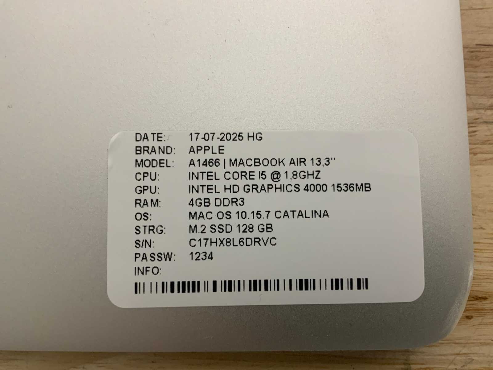 Merk: Apple Type: MACBook Air A1466 Processor type: Intel core RAM Geheugen Type: DDR3 Type datadrager: M.2 NVMe Aantal datadragers: 1 Type videokaart: Intel HD Graphics 4000/6000 Besturingssysteem: Catalina/monterey Zonder adapter: true Beelddiagonaal: 13'' Wifi: true Bluetooth: true USB-Type: USB-A USB poorten: 2 Card reader: true Thunderbolt: true Koptelefoon aansluiting: true Webcam: true Toetsenbord: QWERTY