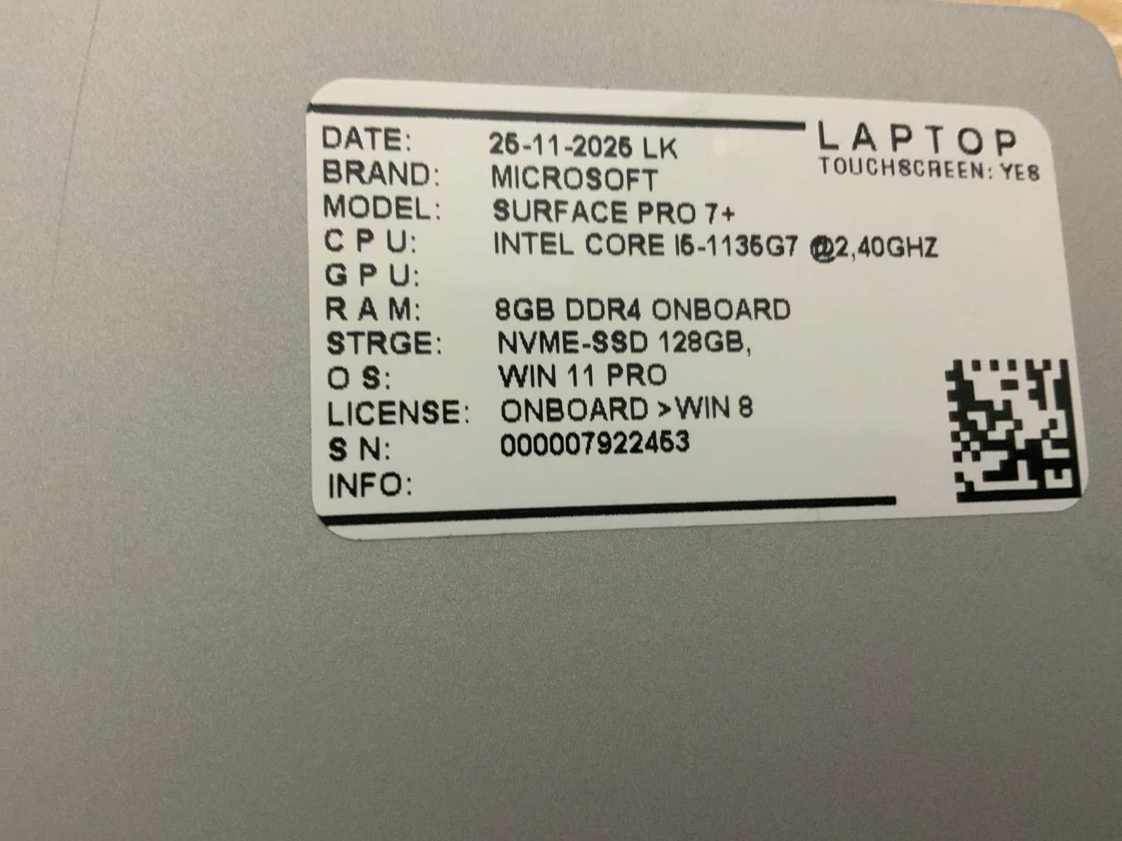 Merk: Microsoft Type: Surface pro 7+ Processor type: Intel core i5-1135G7 Processorsnelheid Ghz: 2,40 RAM Geheugen: 8GB RAM Geheugen Type: Ddr4 Totale opslagcapaciteit: 128GB Aantal datadragers: 1 Besturingssysteem: Windows 11 pro Licentie: Onboard Zonder adapter: true Touchscreen: true Wifi: true Bluetooth: true USB-Type: Usb-A/usb-C USB poorten: 2 Card reader: true Koptelefoon aansluiting: true Webcam: true Toetsenbord: Qwerty