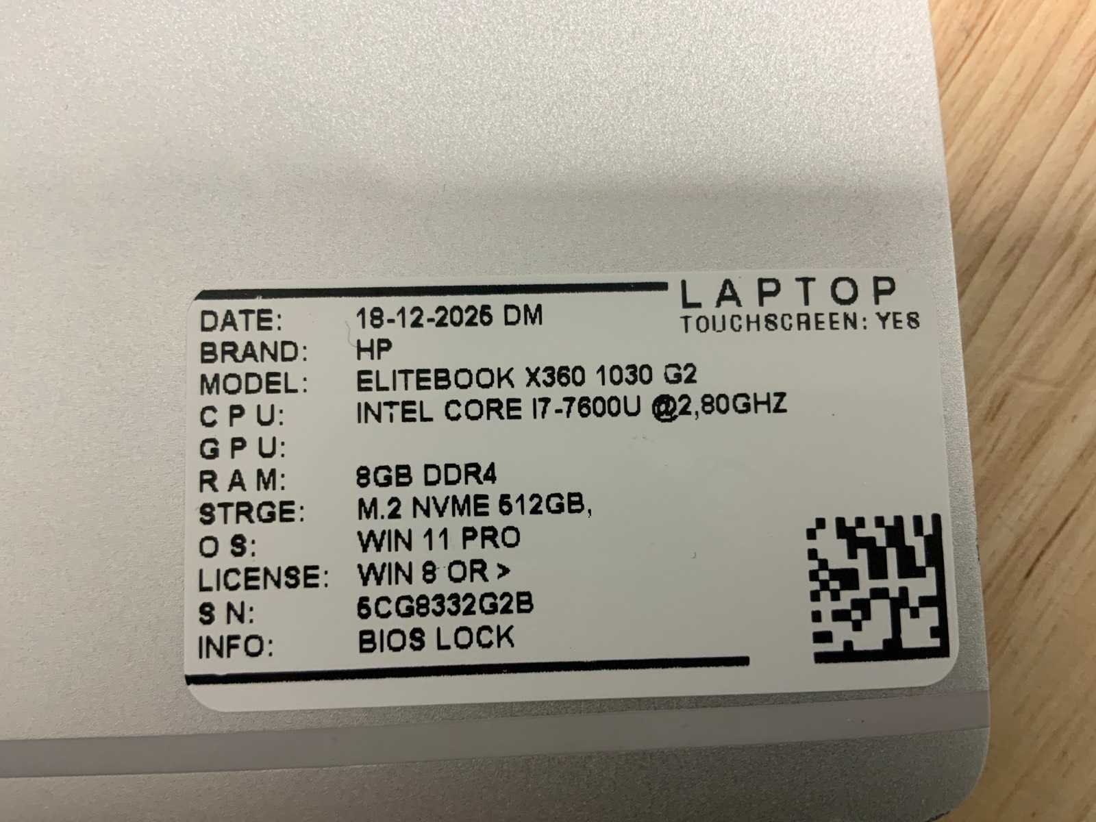 Merk: HP Type: Elitebook X360 1030 G2(i7) Processor type: Intel core i7-7600U Processorsnelheid Ghz: 2,80 RAM Geheugen: 8GB RAM Geheugen Type: Ddr4 Totale opslagcapaciteit: 512GB Type datadrager: Nvme Aantal datadragers: 1 Besturingssysteem: Win 11 pro Licentie: Onboard Zonder adapter: true Touchscreen: true Wifi: true Bluetooth: true USB-Type: Usb-A/Usb-C USB poorten: 3 Card reader: true Koptelefoon aansluiting: true Webcam: true Toetsenbord: Qwerty HDMI: 1