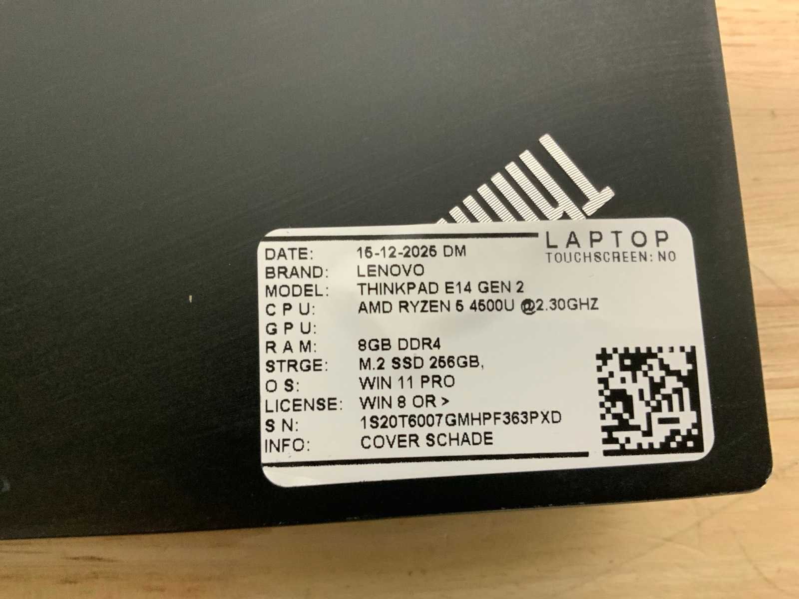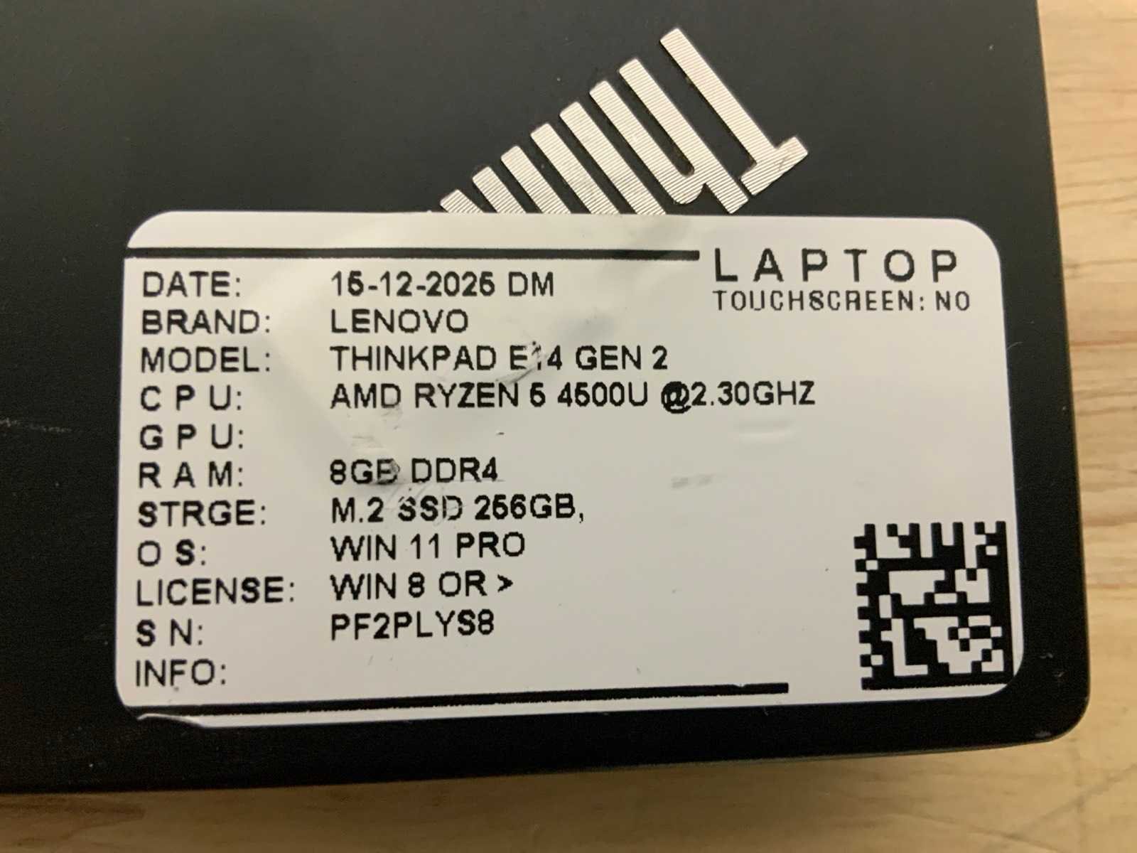 Merk: Lenovo Type: Thinkpad e14 gen2 Processor type: Amd ryzen 5 4500U RAM Geheugen: 2.3GB RAM Geheugen Type: 8 Totale opslagcapaciteit: 256GB Type datadrager: M-sata Aantal datadragers: 1 Besturingssysteem: Windows 11 pro Licentie: Onboard Zonder adapter: true Wifi: true Bluetooth: true USB-Type: Usb-A/usb-C USB poorten: 3 Card reader: true Koptelefoon aansluiting: true Webcam: true Toetsenbord: Qwerty HDMI: 1