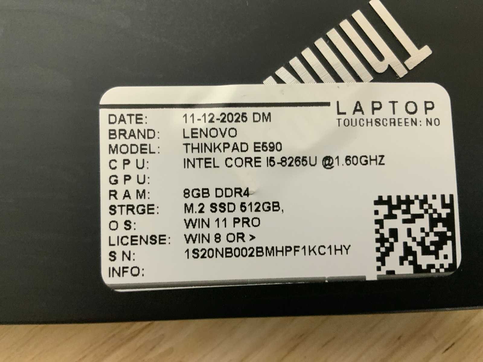 Merk: Lenovo Type: Thinkpad e590 Processor type: Intel core i5-8265U Processorsnelheid Ghz: 1,60 RAM Geheugen: 8GB RAM Geheugen Type: Ddr4 Totale opslagcapaciteit: 513GB Type datadrager: M-sata Aantal datadragers: 1 Besturingssysteem: Windows 11 pro Licentie: Onboard Zonder adapter: true Wifi: true Bluetooth: true USB-Type: Usb-A/usb-C USB poorten: 4 Card reader: true Koptelefoon aansluiting: true Webcam: true Toetsenbord: Qwerty HDMI: 1