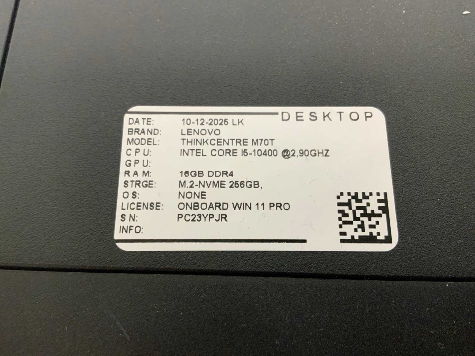 Merk: Lenovo Type: Thinkcentre M70T Processor type: Intel core i5-10400 Processorsnelheid Ghz: 2,90 Besturingssysteem: Nvt Type datadrager: Nvme RAM Geheugen: 16GB RAM Geheugen Type: Ddr4 Opslagcapaciteit: 256GB Displaypoort: 2 HDMI: 1 Ethernet: 1 USB poorten: 9 Zonder voedingskabel: true