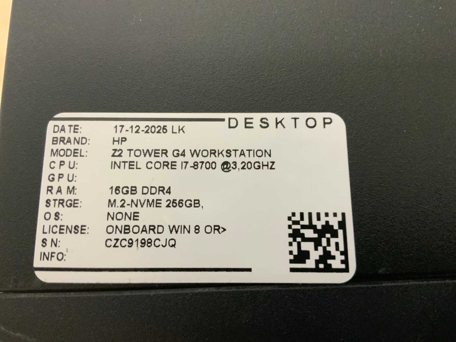 Merk: Hp Type: Z2 Tower G4 Workstation(i7) Processor type: Intel core i7-8700 Processorsnelheid Ghz: 3,20 Besturingssysteem: Nvt Type datadrager: Nvme RAM Geheugen: 16GB RAM Geheugen Type: Ddr4 Opslagcapaciteit: 256GB Type videokaart: Nvidia quadro p2000 Displaypoort: 4 Ethernet: 1 USB poorten: 8 Zonder voedingskabel: true