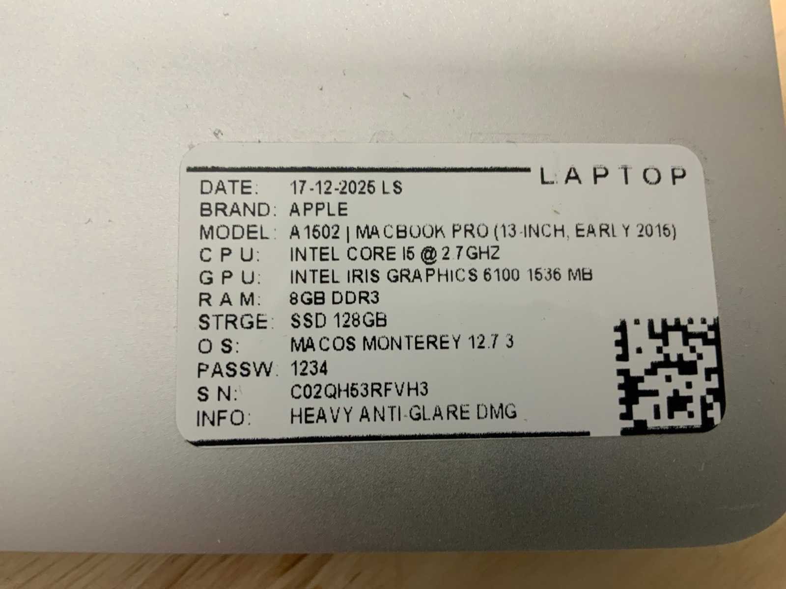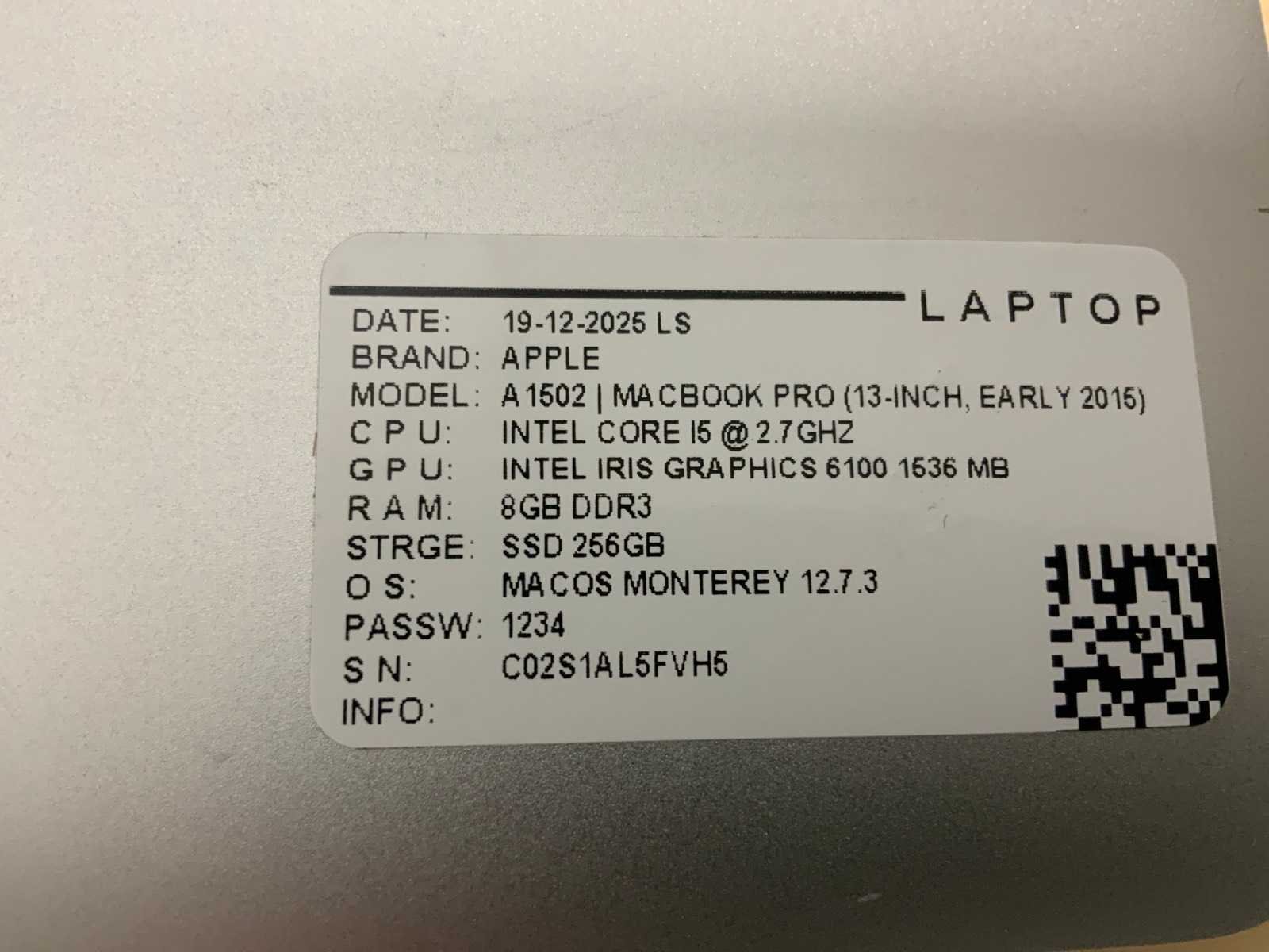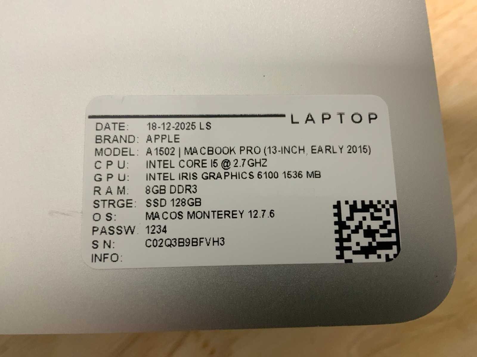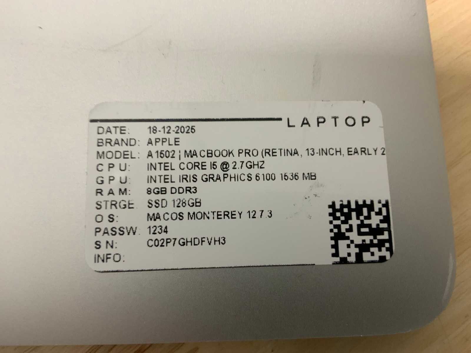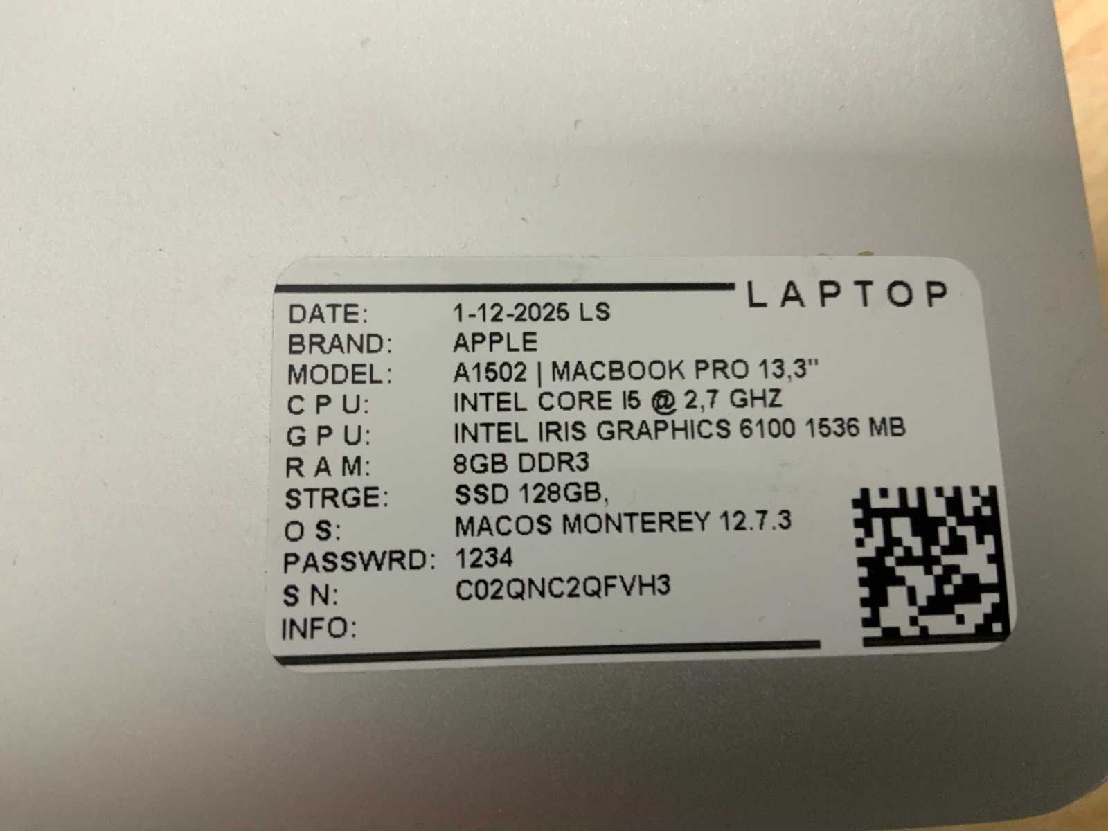 Merk: Apple Type: MACBook Pro A1502 Processor type: Intel core i5 Processorsnelheid Ghz: 2,60 RAM Geheugen: 8GB RAM Geheugen Type: DDR3 Type datadrager: SSD Aantal datadragers: 1 Type videokaart: Intel Iris Graphics Besturingssysteem: Monterey Licentie: Nvt Zonder adapter: true Beelddiagonaal: 13'' Wifi: true Bluetooth: true USB-Type: USB-A USB poorten: 2 Thunderbolt: true HDMI: 1