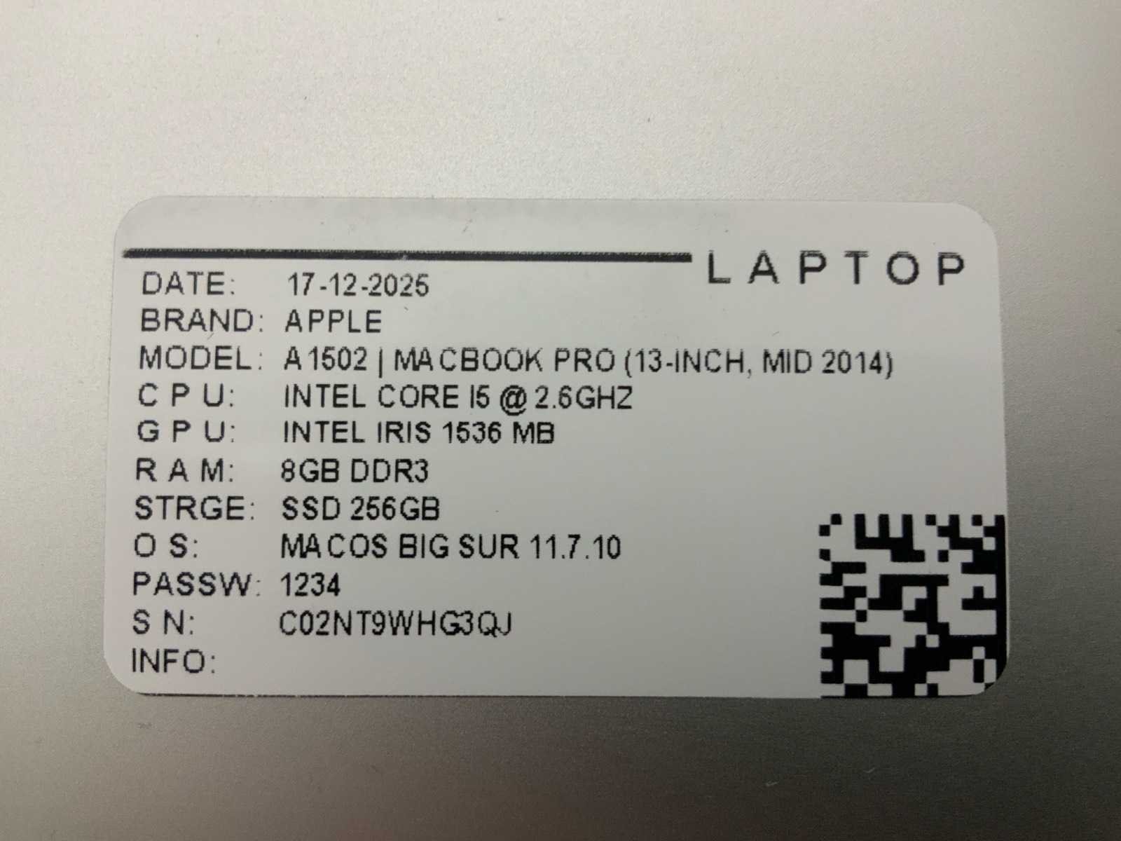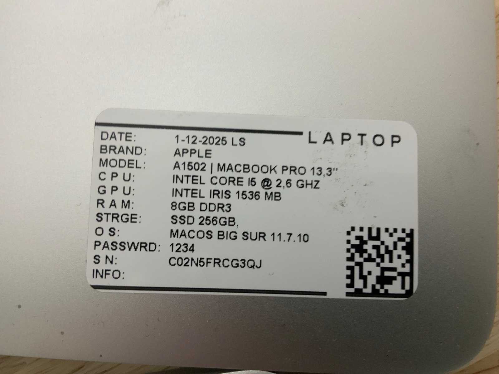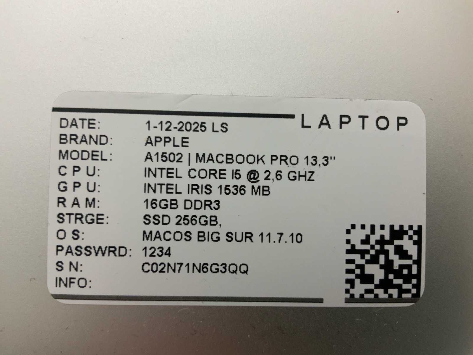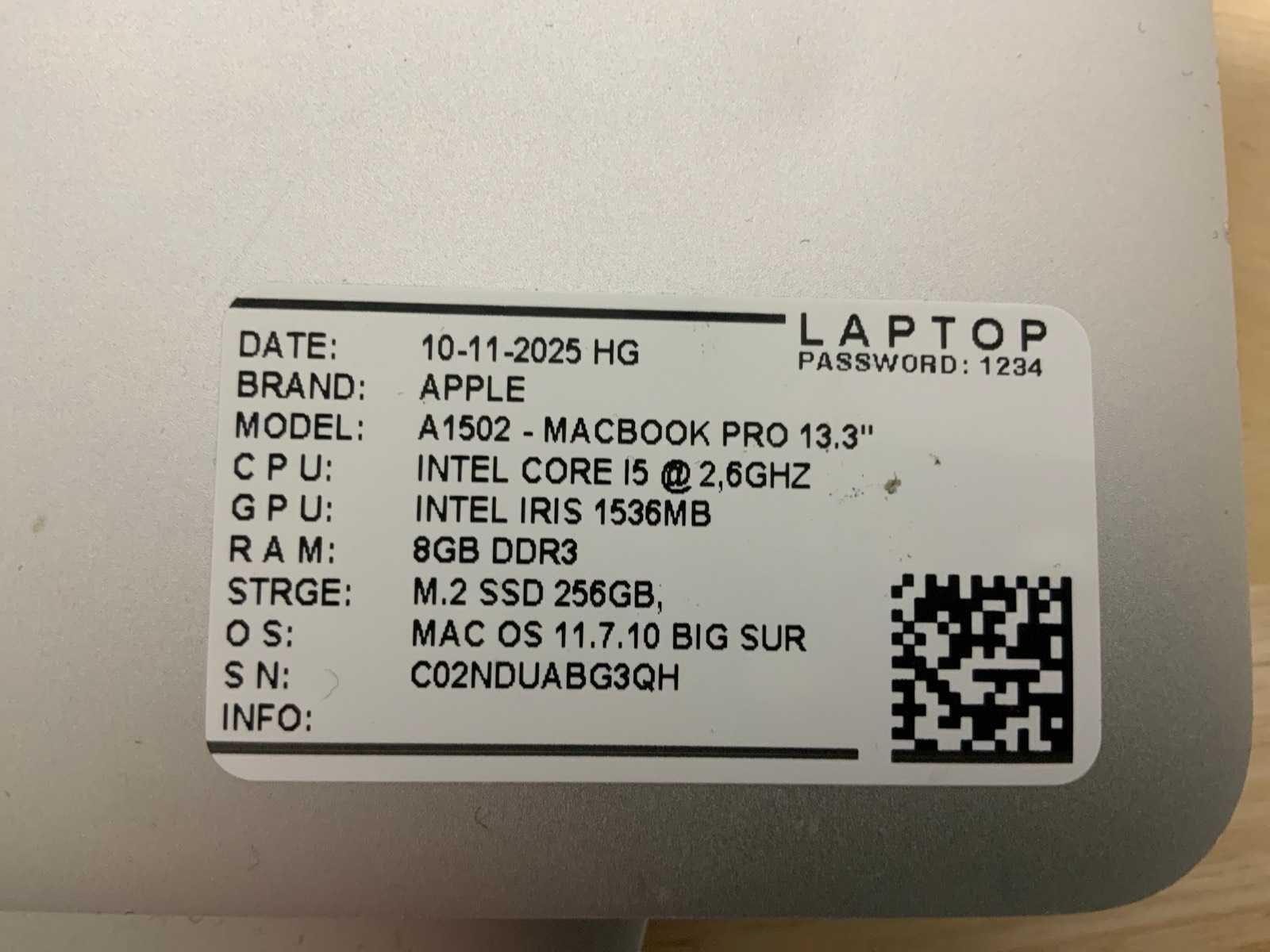 Merk: Apple Type: MACBook Pro A1502 Processor type: Intel core i5 Processorsnelheid Ghz: 2,70 RAM Geheugen Type: DDR3 Type datadrager: SSD Aantal datadragers: 1 Type videokaart: Intel Iris Graphics 6100 Besturingssysteem: Monterey Licentie: Nvt Zonder adapter: true Beelddiagonaal: 13'' Wifi: true Bluetooth: true USB-Type: USB-A USB poorten: 2 Thunderbolt: true HDMI: 1
