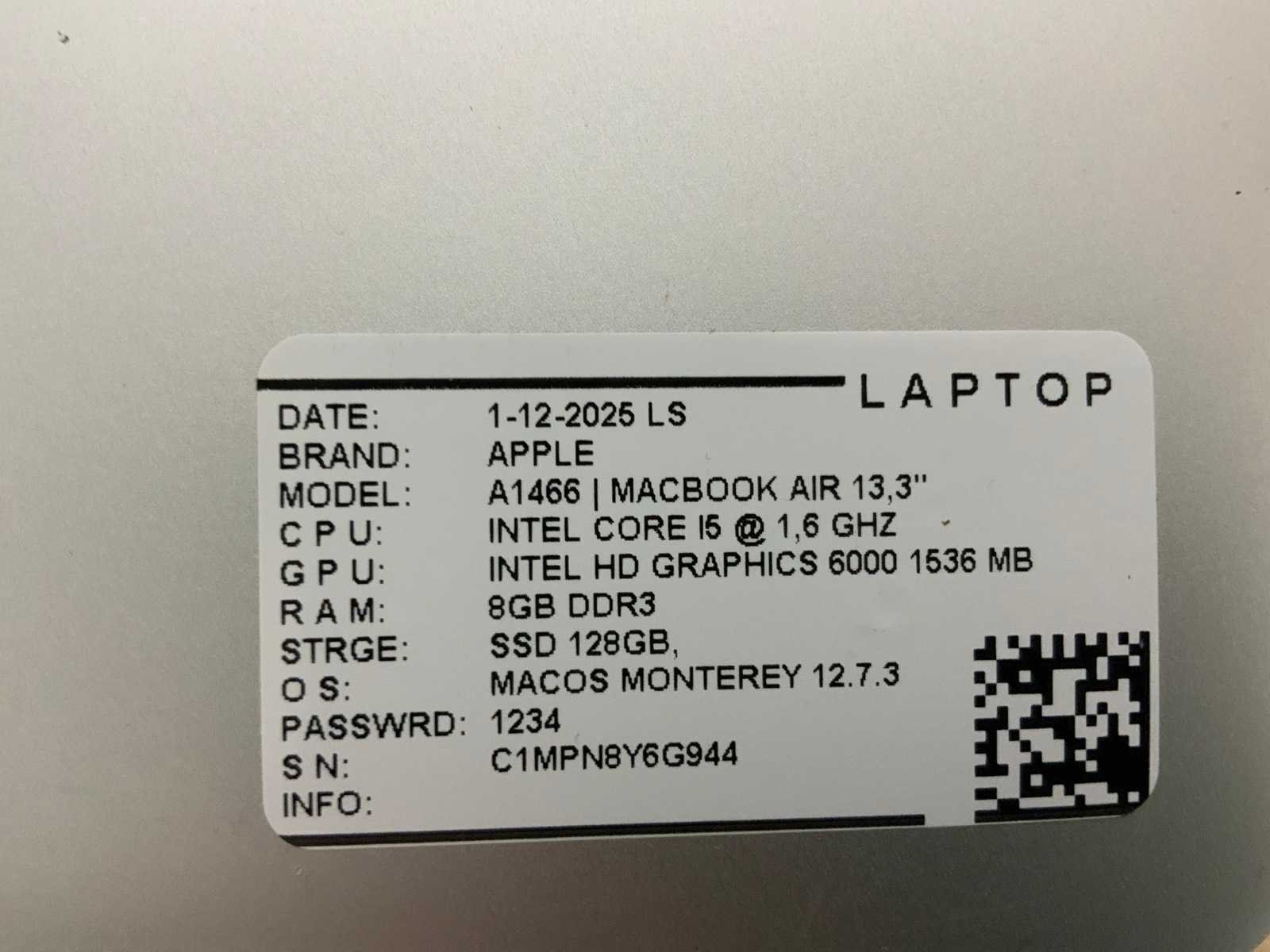 Merk: Apple Type: MACBook Air A1466 Processor type: Intel core i5 Processorsnelheid Ghz: 1.6 RAM Geheugen: 8GB RAM Geheugen Type: DDR3 Totale opslagcapaciteit: 128GB Type datadrager: M.2 NVMe Aantal datadragers: 1 Type videokaart: Intel HD Graphics 6000 Besturingssysteem: Monterey Zonder adapter: true Beelddiagonaal: 13'' Wifi: true Bluetooth: true USB-Type: USB-A USB poorten: 2 Card reader: true Thunderbolt: true Koptelefoon aansluiting: true Webcam: true Toetsenbord: QWERTY