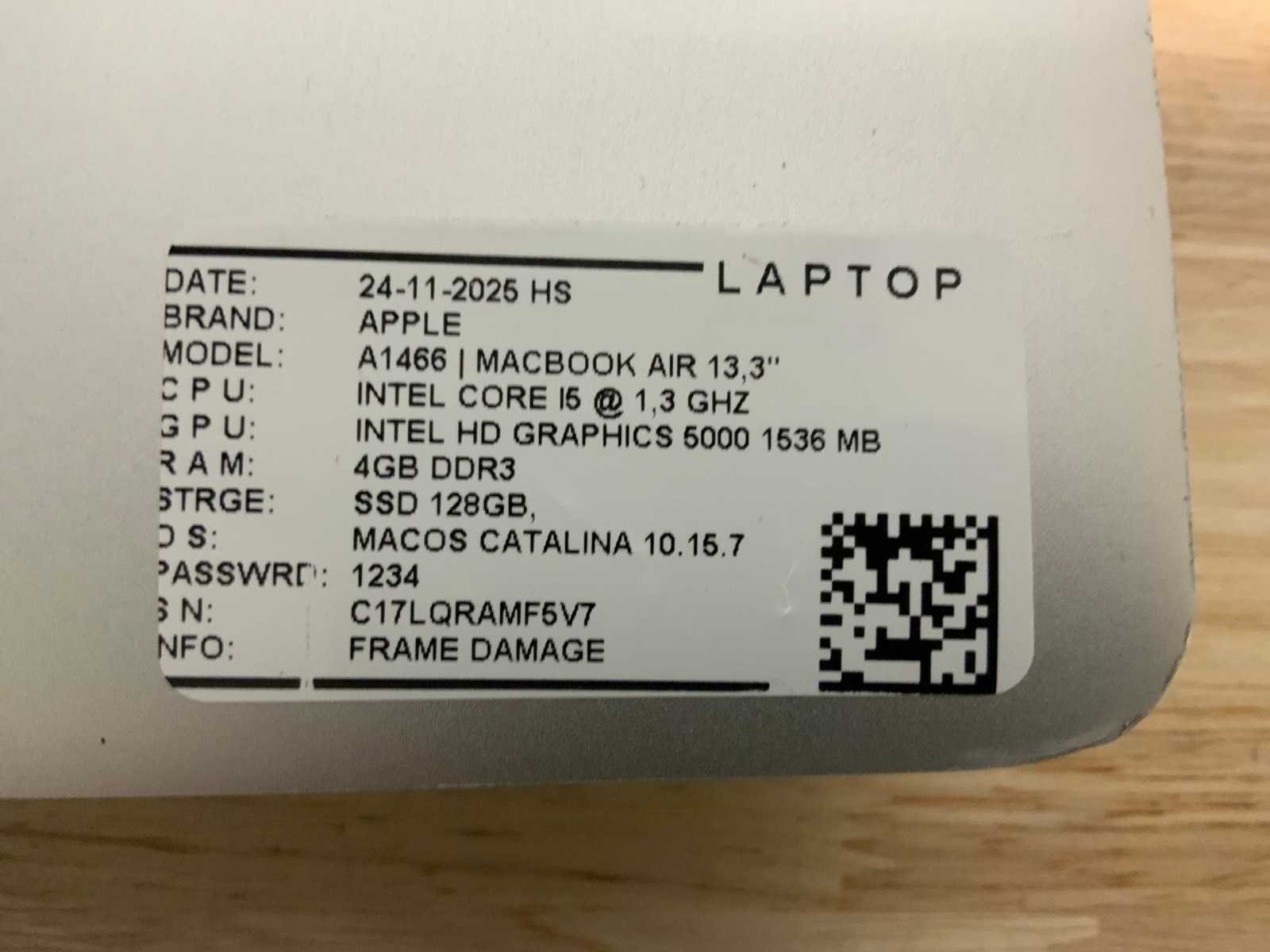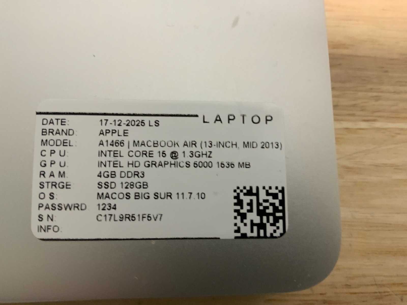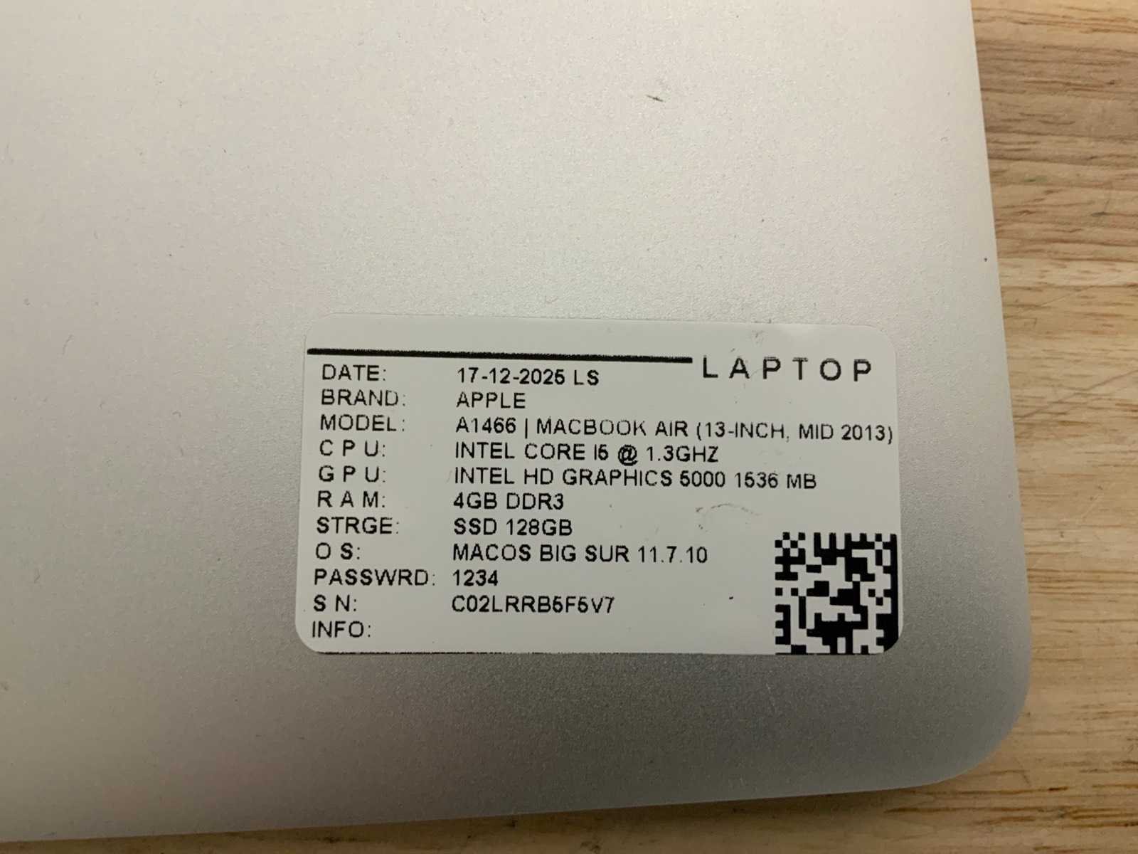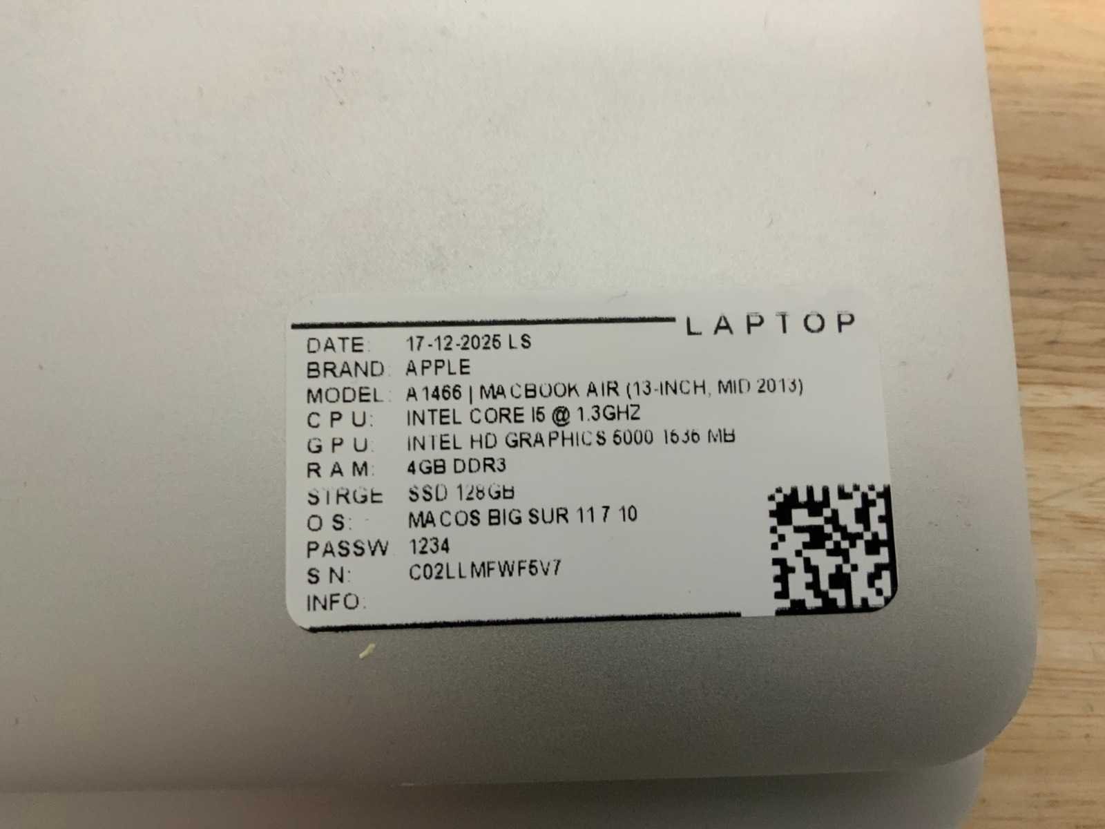 Merk: Apple Type: MACBook Air A1466 Processor type: Intel core i5 Processorsnelheid Ghz: 1,40 RAM Geheugen Type: DDR3 Totale opslagcapaciteit: 128GB Type datadrager: M.2 NVMe Aantal datadragers: 1 Type videokaart: Intel HD Graphics 6000 Besturingssysteem: Big sur/monterey Zonder adapter: true Beelddiagonaal: 13'' Wifi: true Bluetooth: true USB-Type: USB-A USB poorten: 2 Card reader: true Thunderbolt: true Koptelefoon aansluiting: true Webcam: true Toetsenbord: QWERTY