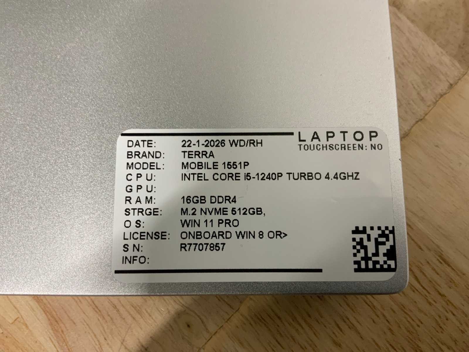 Merk: Terra Type: Mobile 1551P (i5-gen12) Processor type: Intel core i5-1240P Processorsnelheid Ghz: 4,4 turbo boost RAM Geheugen: 16GB RAM Geheugen Type: Ddr4 Totale opslagcapaciteit: 512GB Type datadrager: Nvme Aantal datadragers: 1 Besturingssysteem: Windows 11 pro Zonder adapter: true Wifi: true Bluetooth: true USB-Type: Usb-A/Usb-C USB poorten: 4 Card reader: true Koptelefoon aansluiting: true Webcam: true HDMI: 1