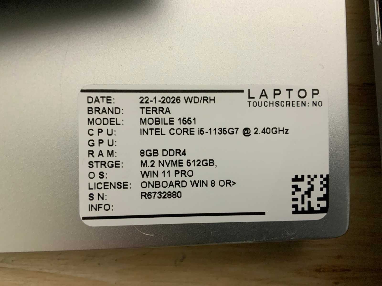 Merk: Terra Type: Mobile 1551 (i5-gen11) Processor type: Intel core i5-1135G7 Processorsnelheid Ghz: 2,40 RAM Geheugen: 8GB RAM Geheugen Type: Ddr4 Totale opslagcapaciteit: 512GB Type datadrager: Nvme Aantal datadragers: 1 Besturingssysteem: Windows 11 pro Zonder adapter: true Wifi: true Bluetooth: true USB-Type: Usb-A/Usb-C USB poorten: 4 Card reader: true Koptelefoon aansluiting: true Webcam: true HDMI: 1